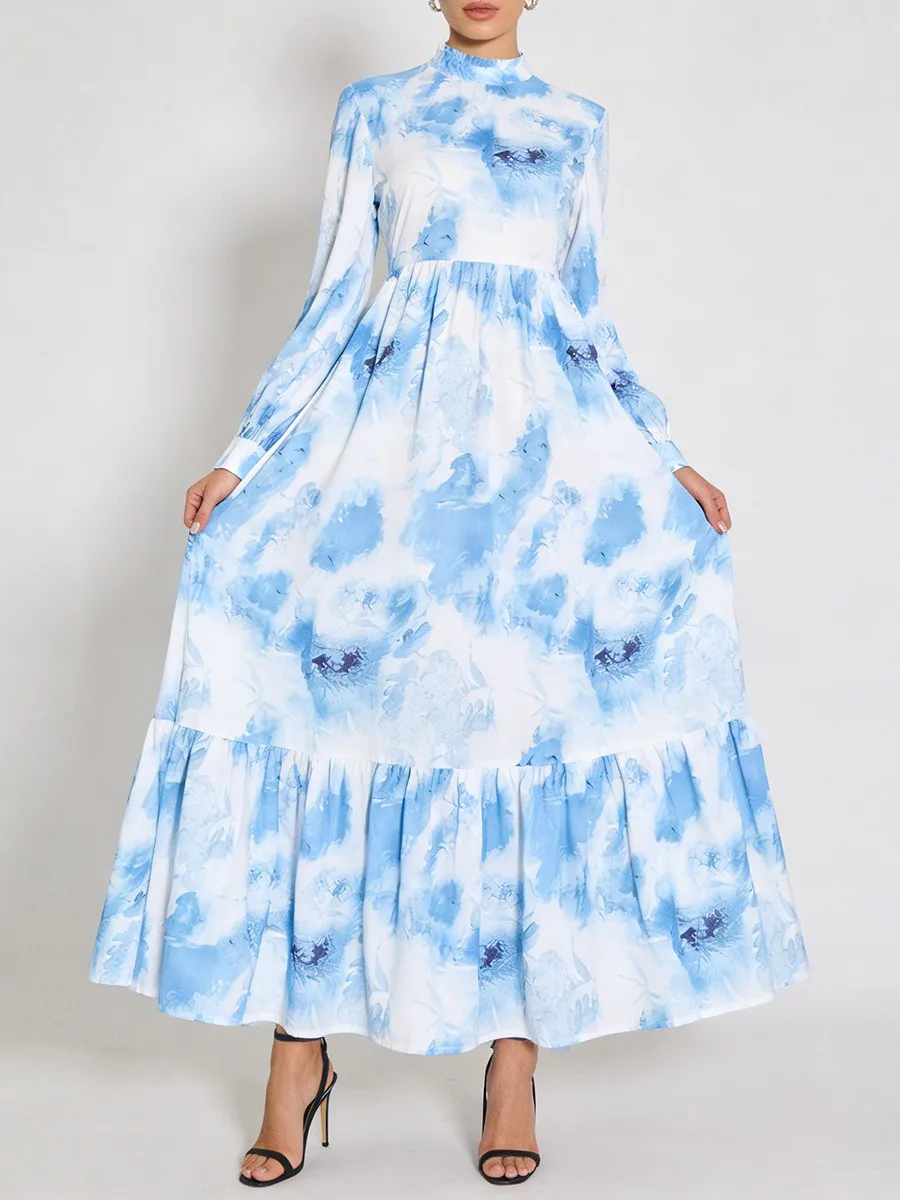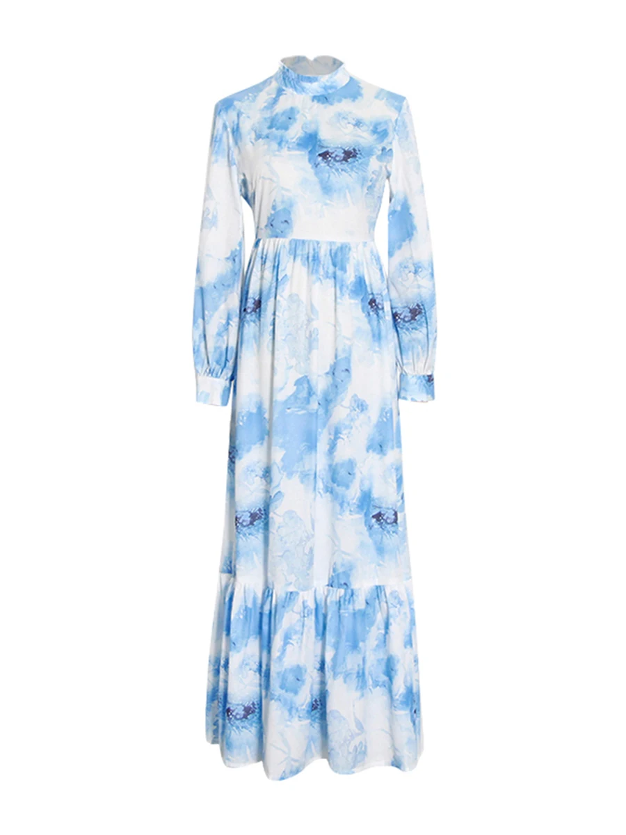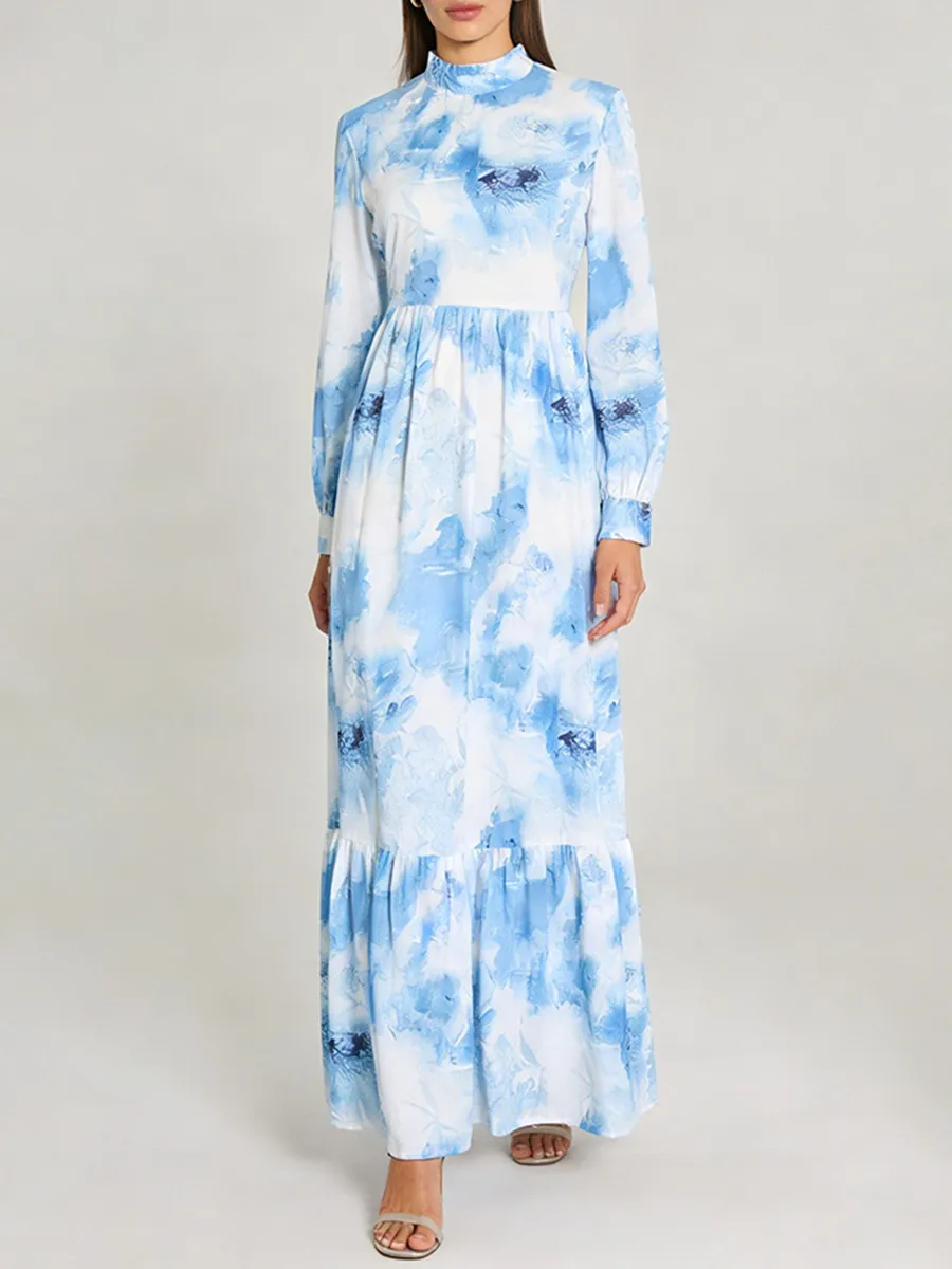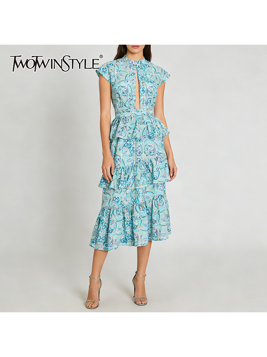 TWOTWINSTYLE Printing Spliced Shirring Slimming Dresses for Women Stand Neck Long Sleeves High Waist Fashion Long Dress Female