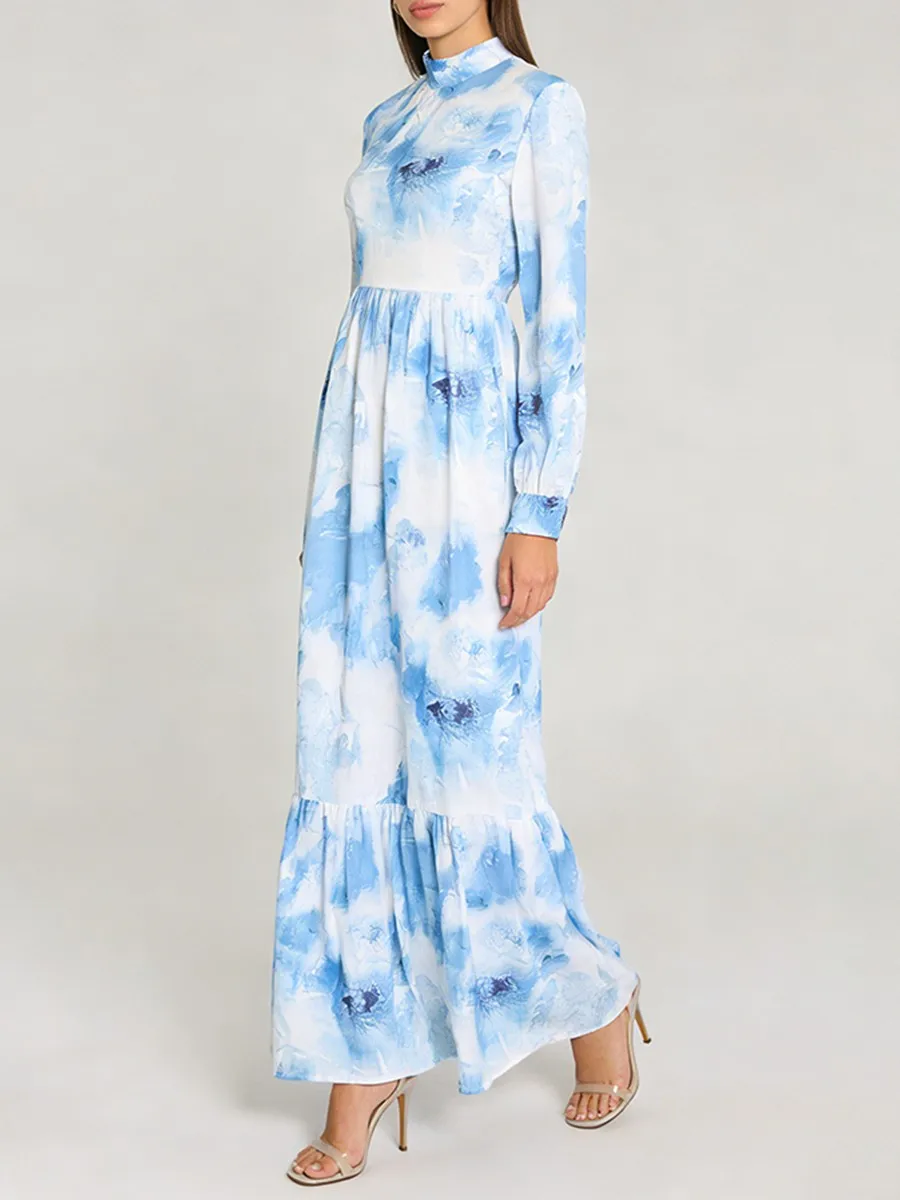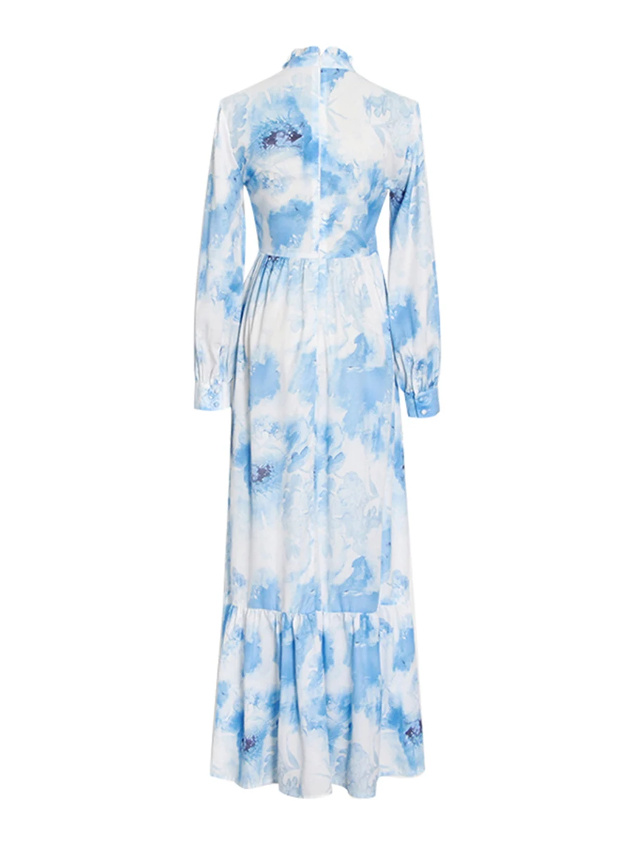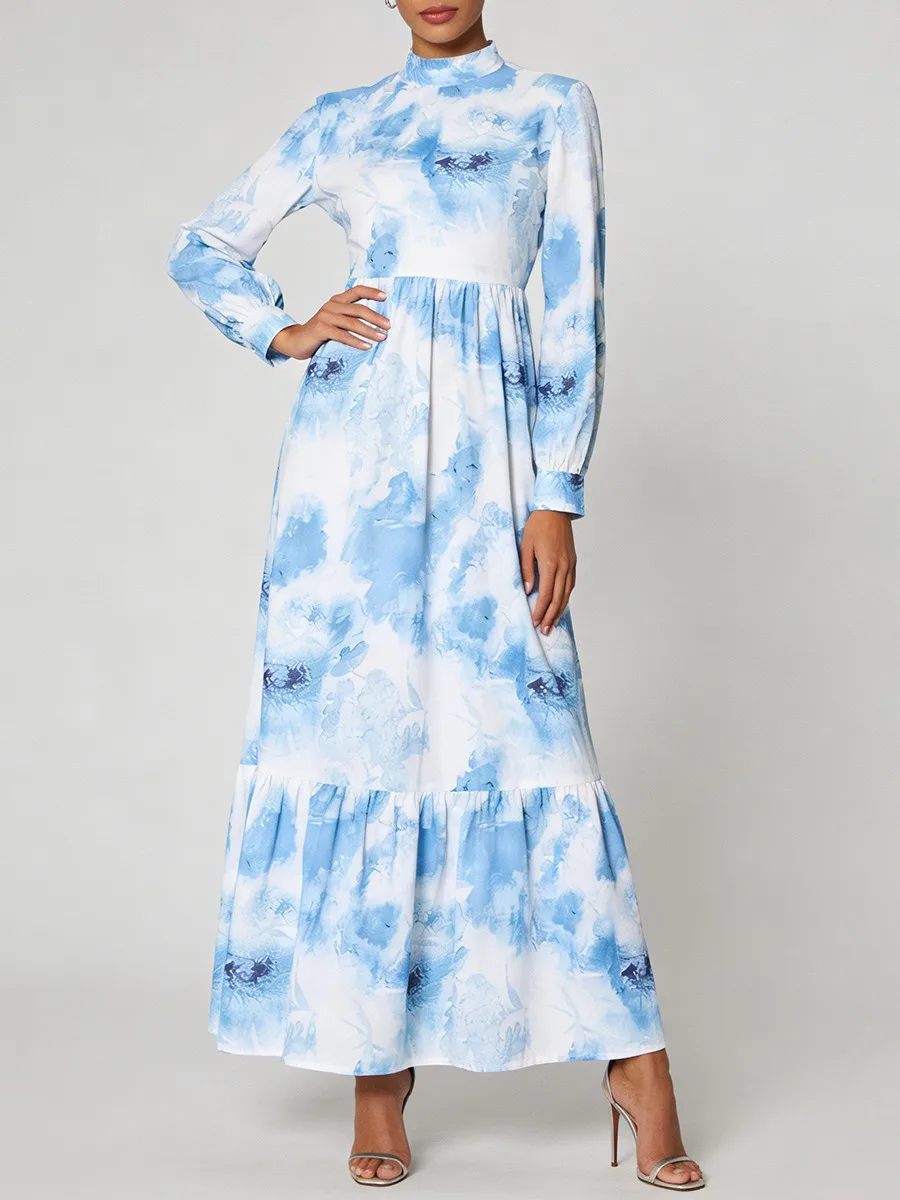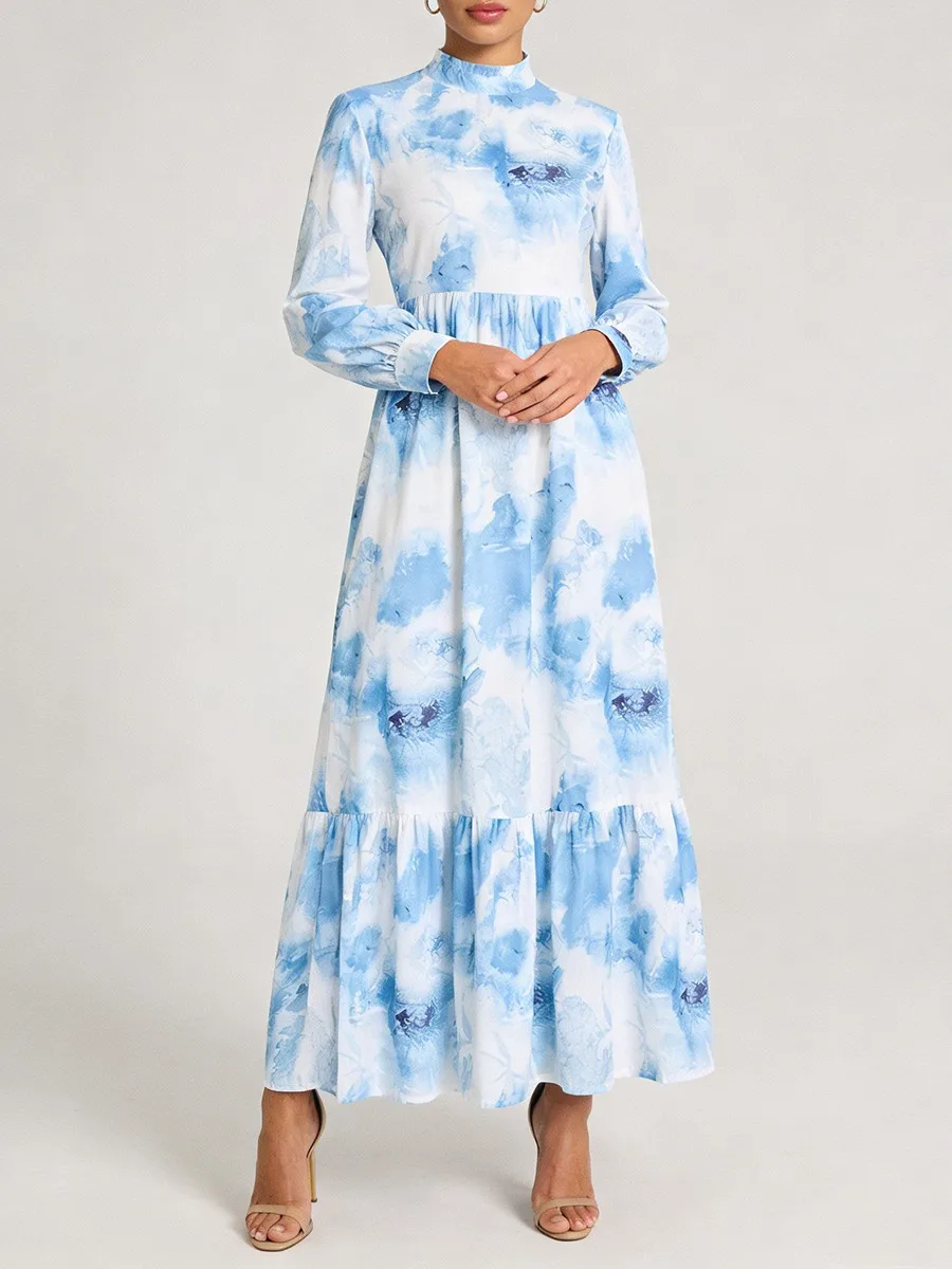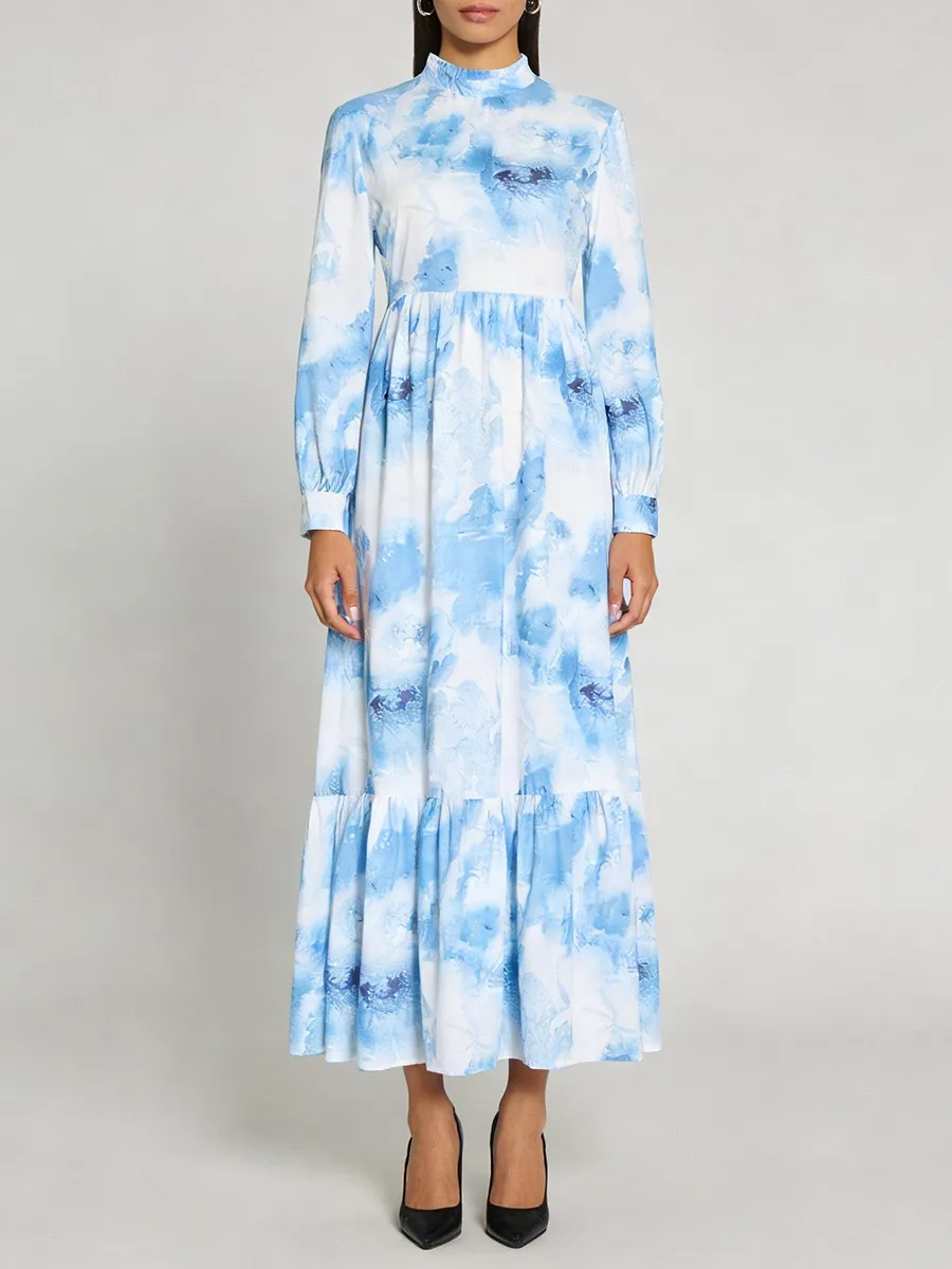 TWOTWINSTYLE Printing Spliced Shirring Slimming Dresses for Women Stand Neck Long Sleeves High Waist Fashion Long Dress Female