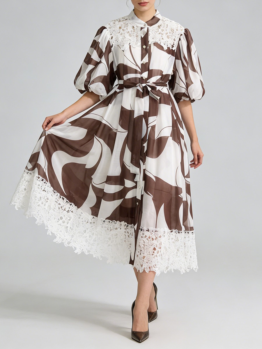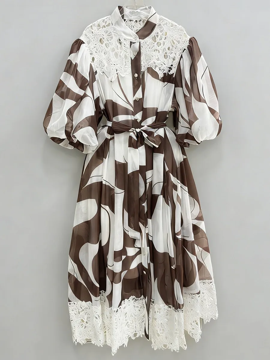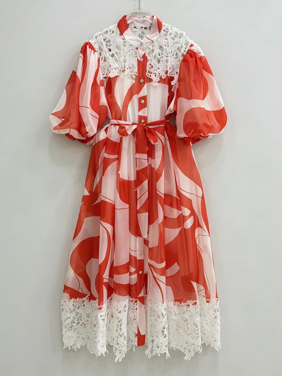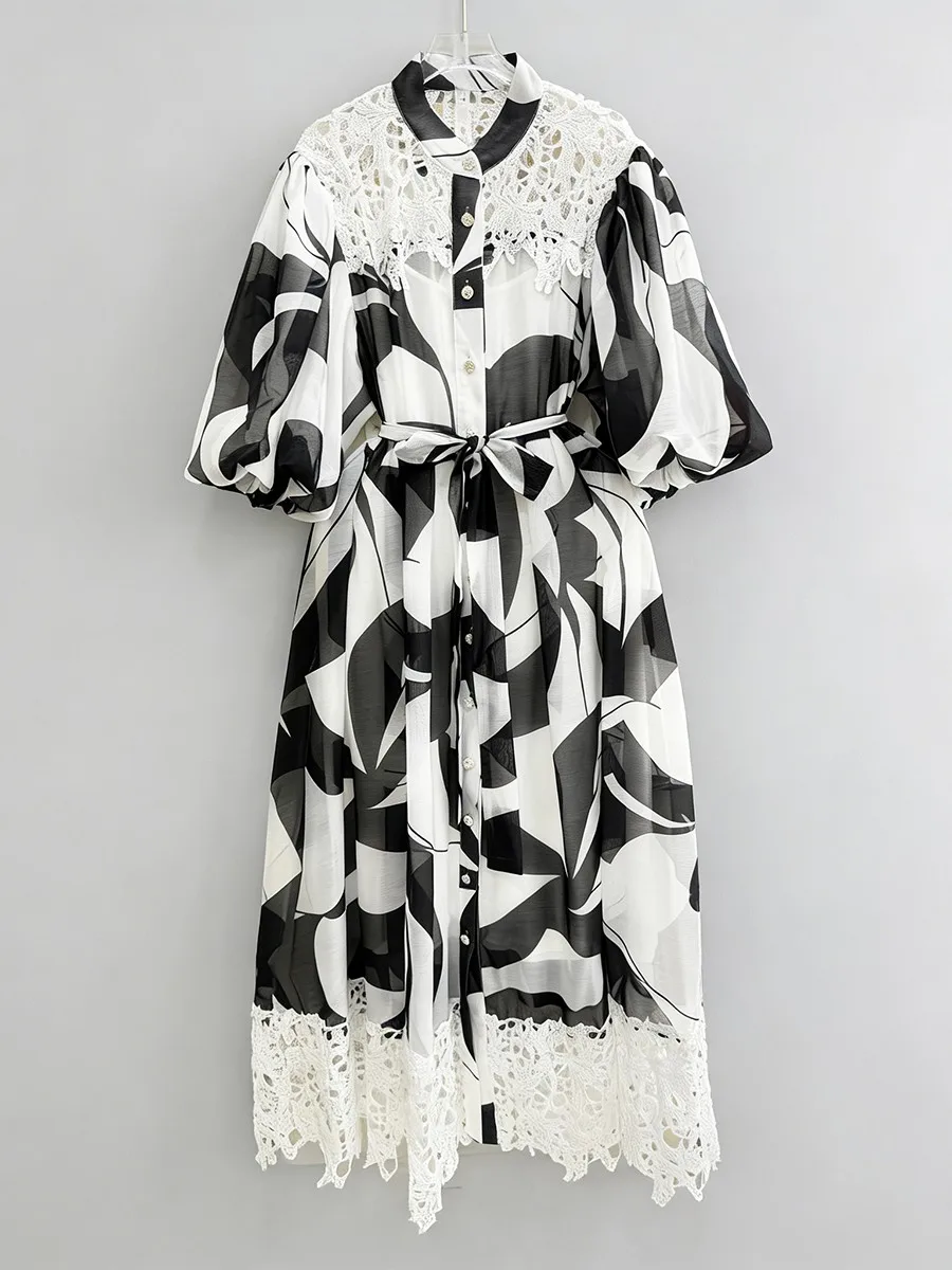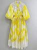 TWOTWINSTYLE Printinghollow Out Spliced Embroidery Dresses for Women O Neck Half Sleeves Hollow Out Patchwork Bead Dress Female