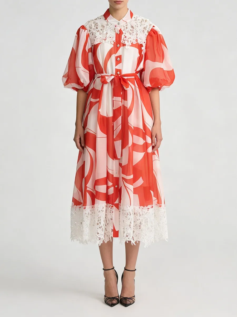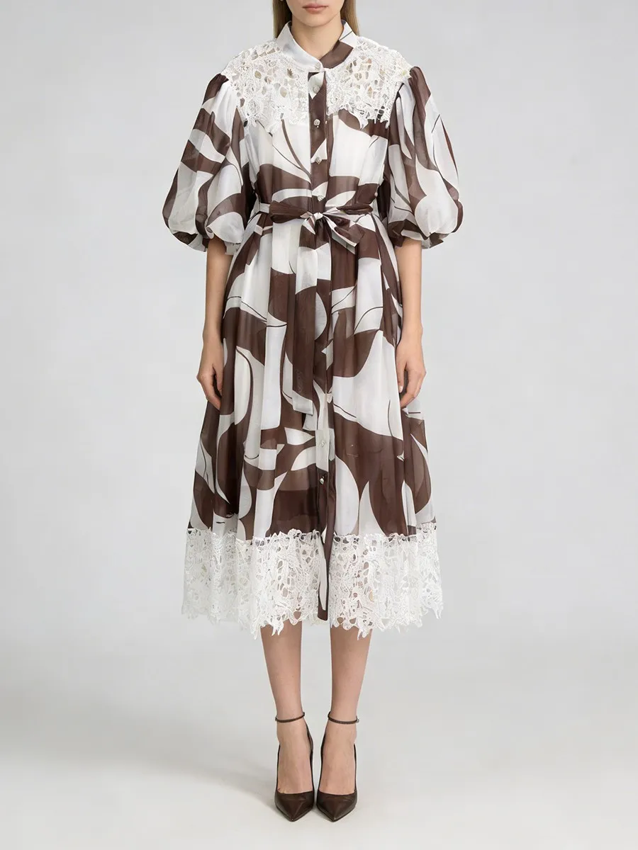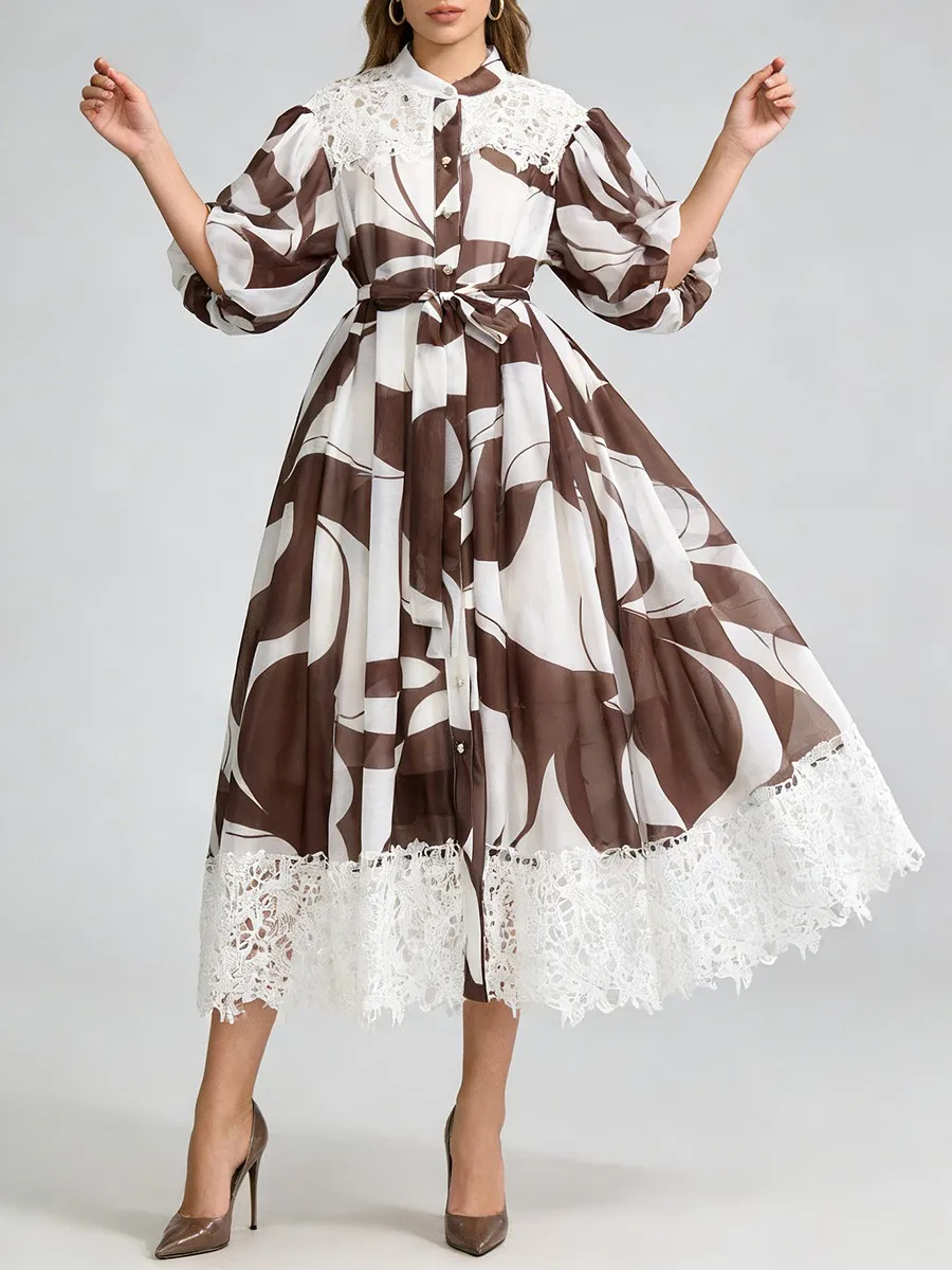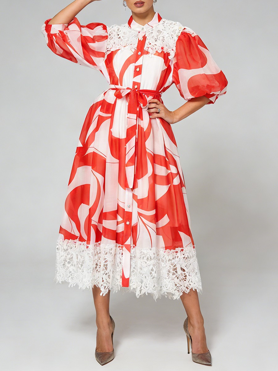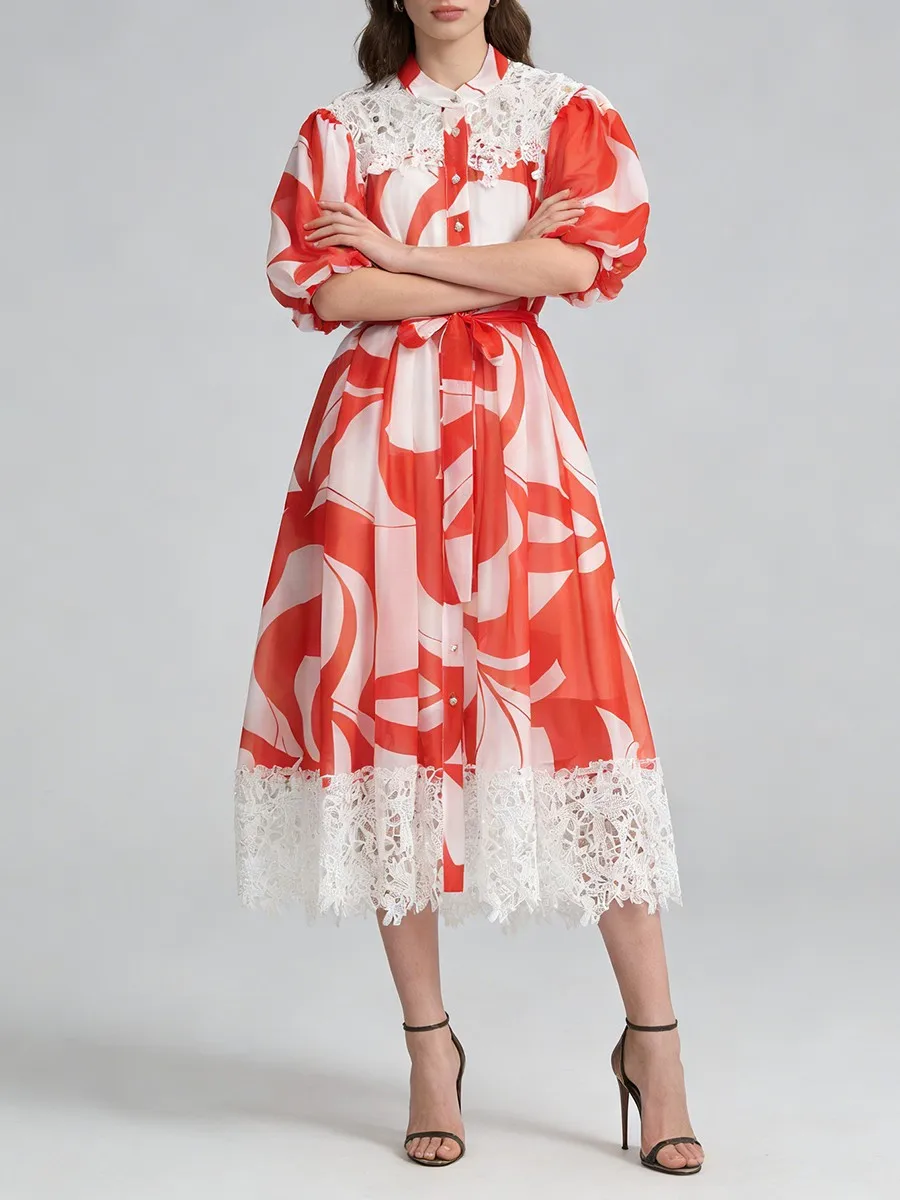 TWOTWINSTYLE Printinghollow Out Spliced Embroidery Dresses for Women O Neck Half Sleeves Hollow Out Patchwork Bead Dress Female