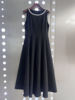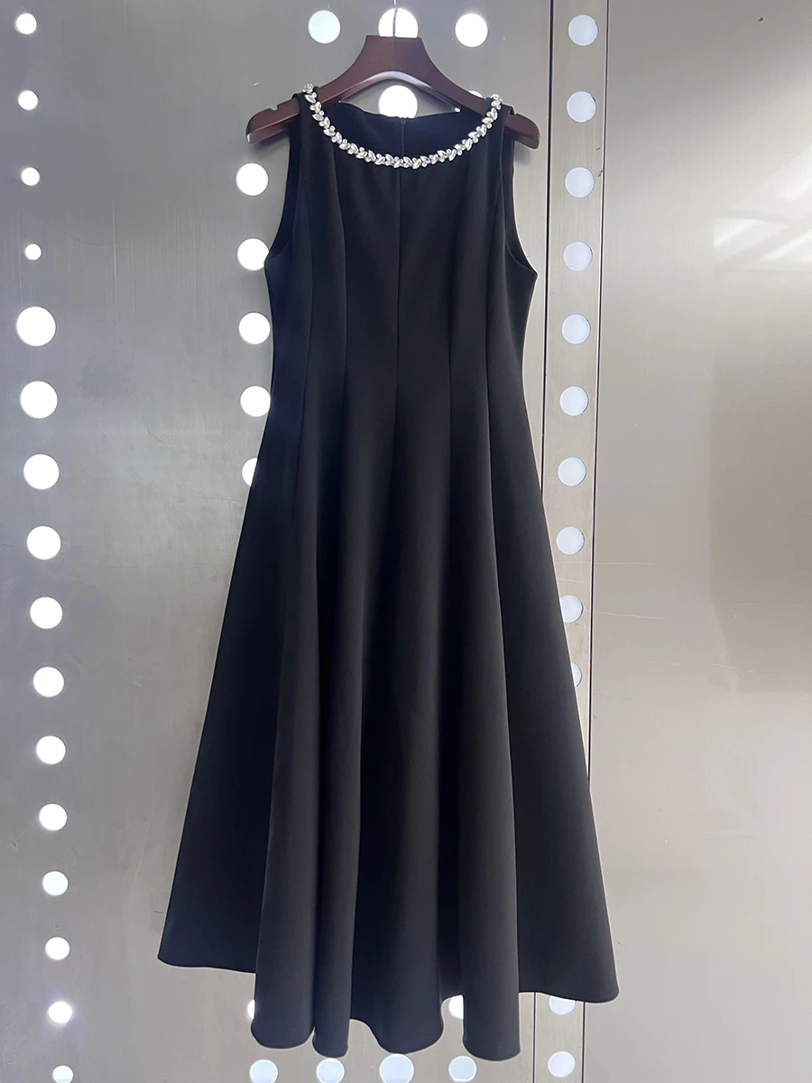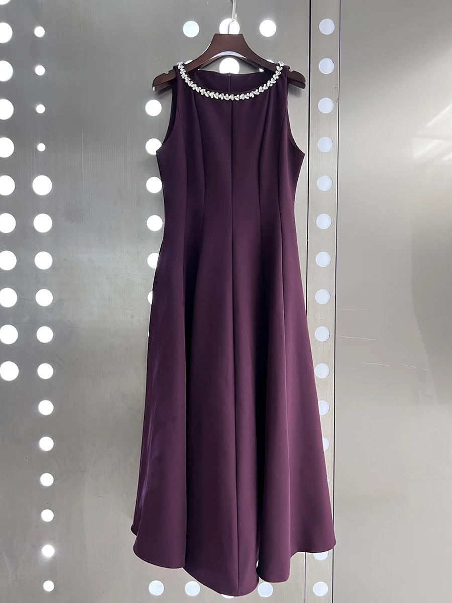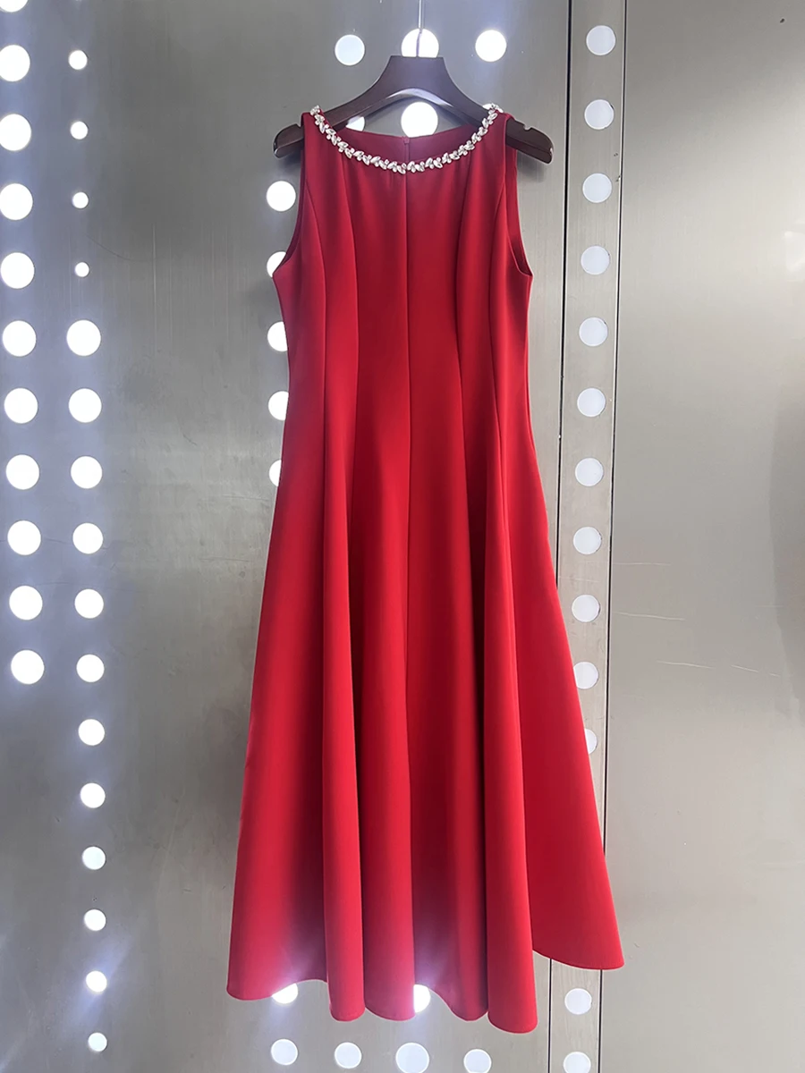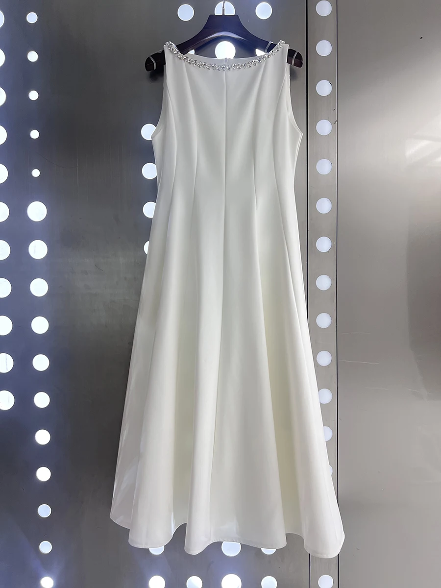 TWOTWINSTYLE Slimming Spliced Bead Elegant Long Dresses for Women Round Neck Sleeveless High Waist Dress Female Fashion Clothing