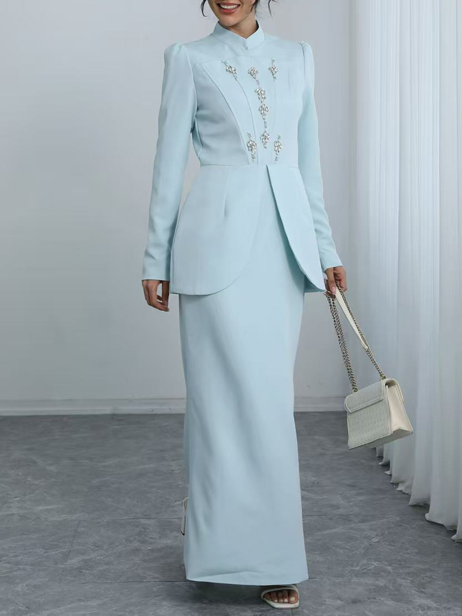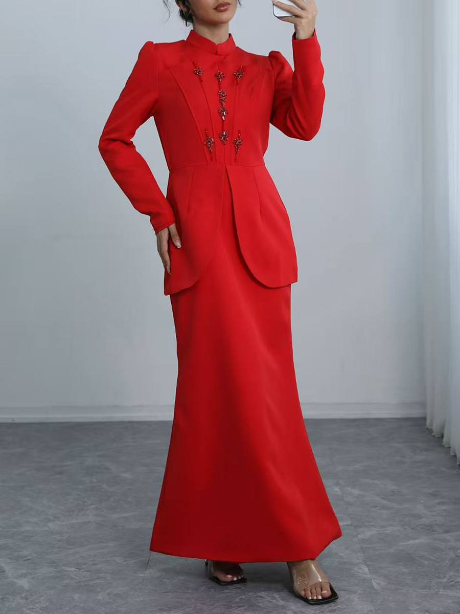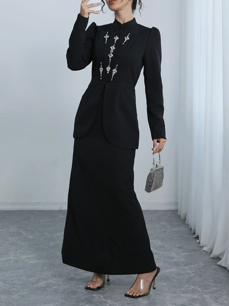 TWOTWINSTYLE Slimming Spliced Bead Temperament Dresses for Women Stand Neck Long Sleeves High Waist Elegant Dress Female Clothes