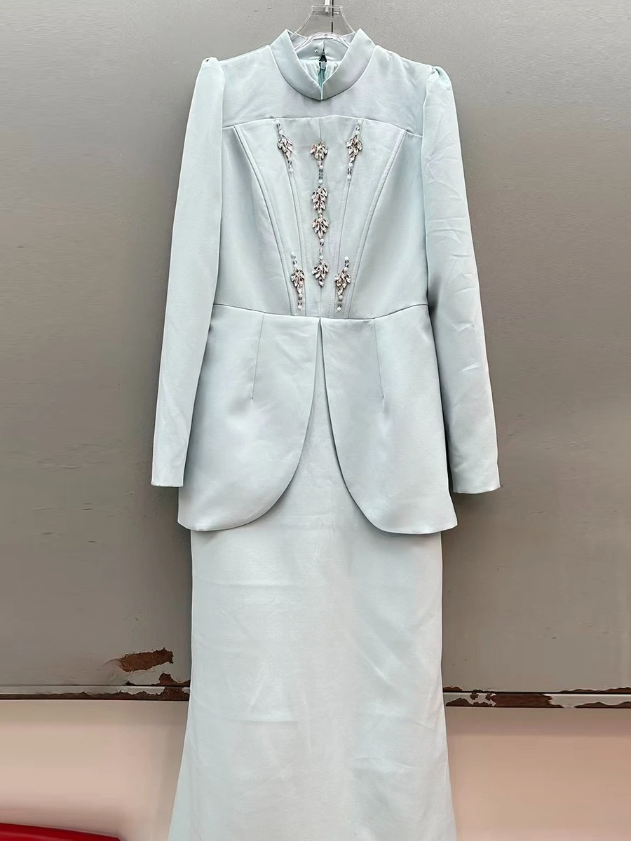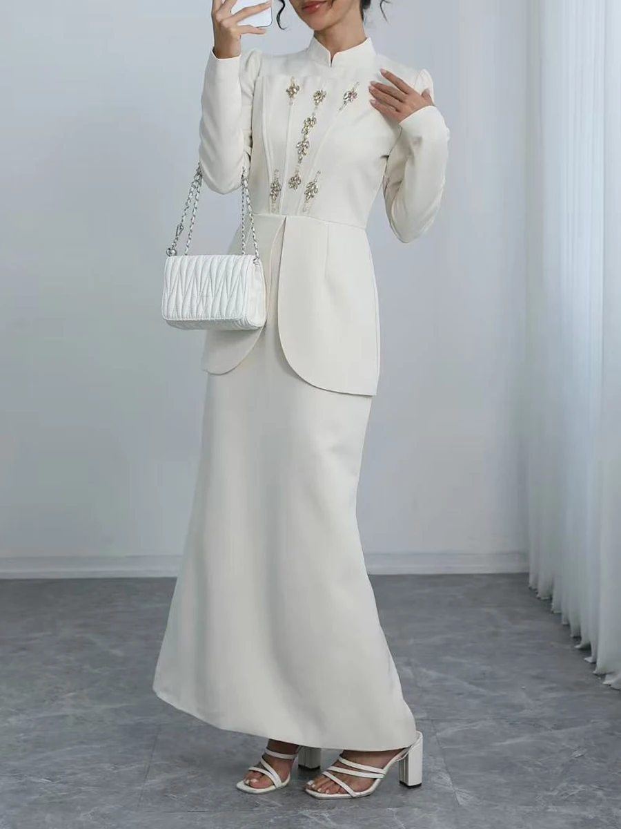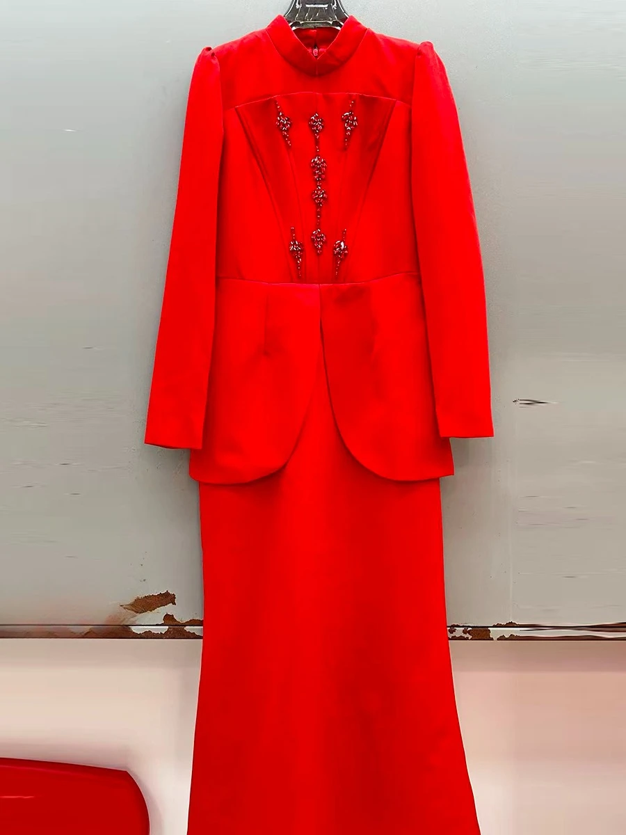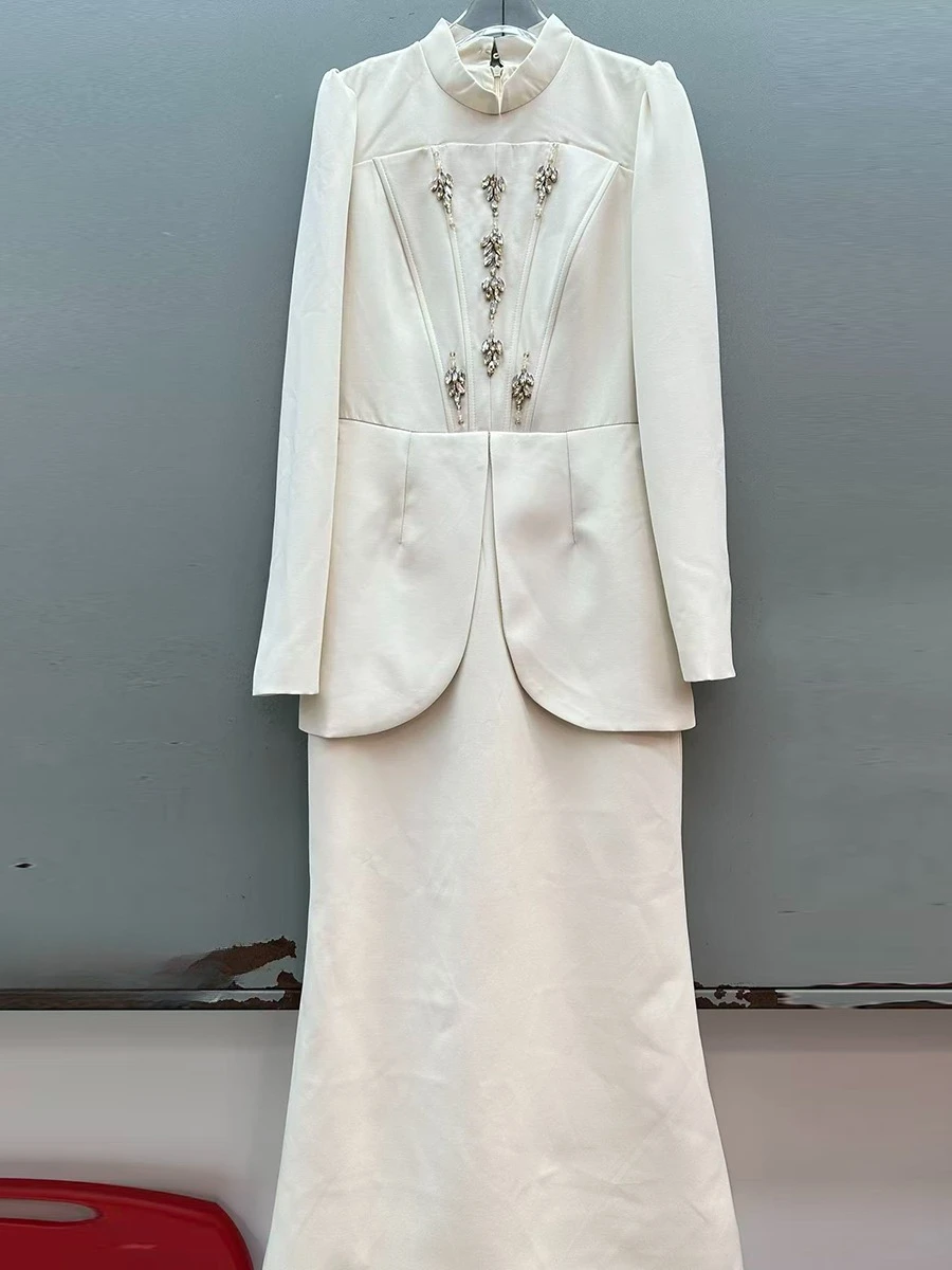 TWOTWINSTYLE Slimming Spliced Bead Temperament Dresses for Women Stand Neck Long Sleeves High Waist Elegant Dress Female Clothes