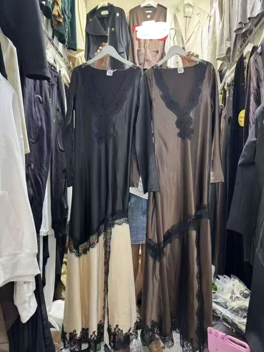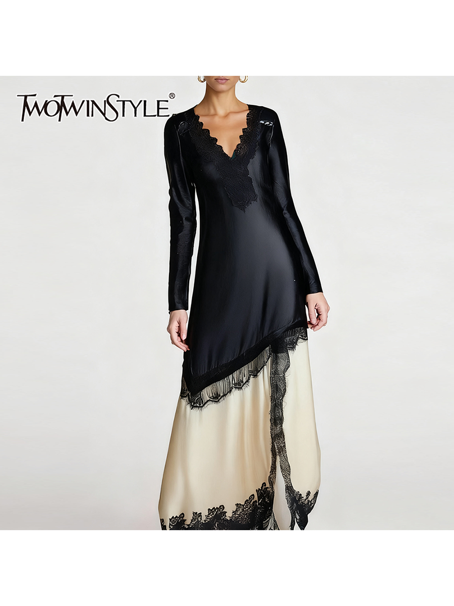 TWOTWINSTYLE Slimming Spliced Lace Elegant Dresses for Women V Neck Long Sleeves Split Casual Dress Female Fashion Clothing New