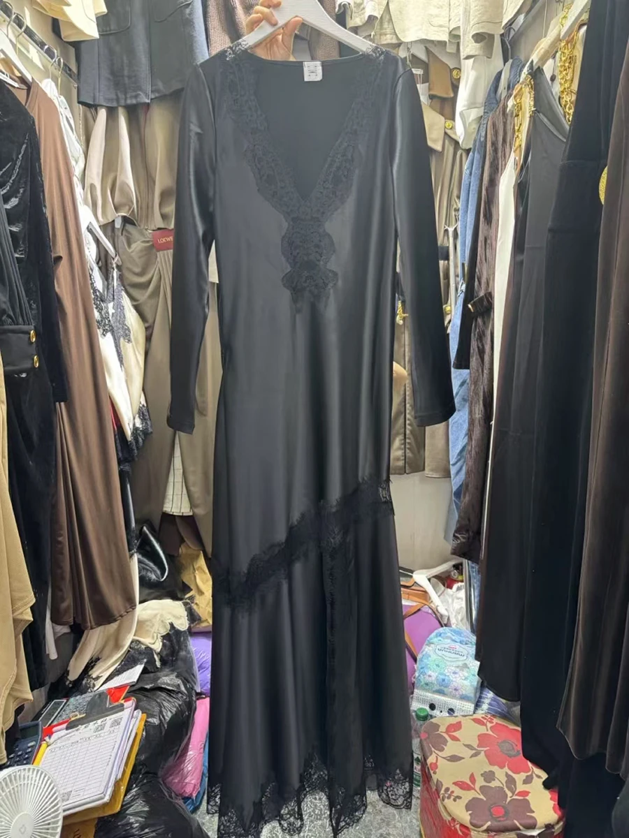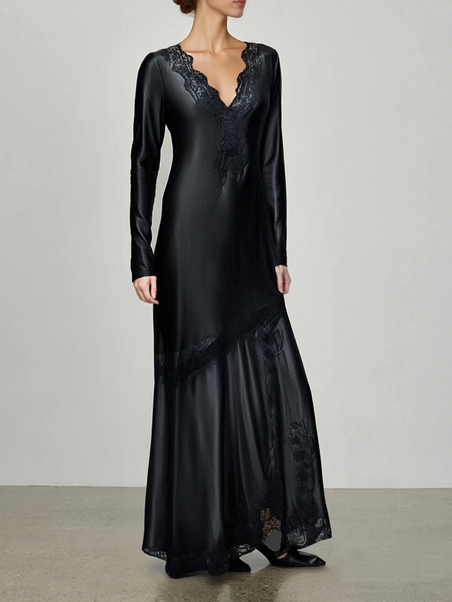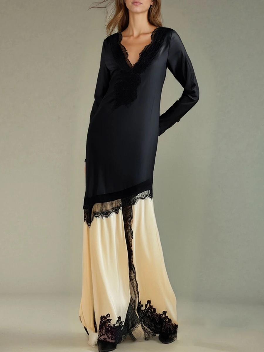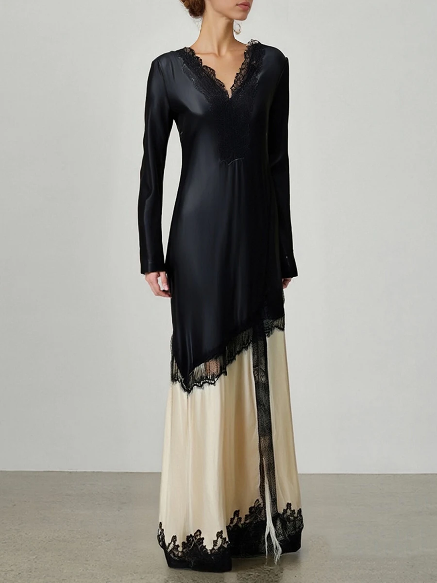TWOTWINSTYLE Slimming Spliced Lace Elegant Dresses for Women V Neck Long Sleeves Split Casual Dress Female Fashion Clothing New