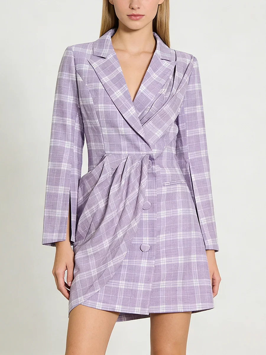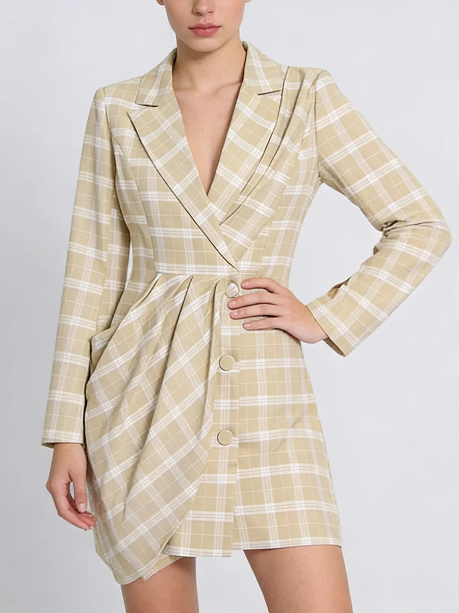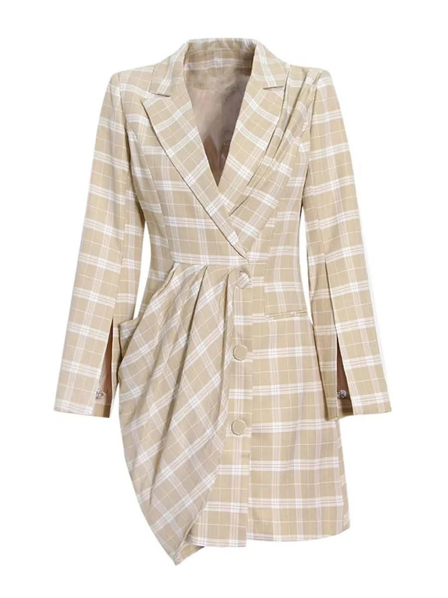 TWOTWINSTYLE Slimming Spliced Plaid Irregular Dresses for Women Lapel Long Sleeves High Waist Patchwork Folds Dress Female New