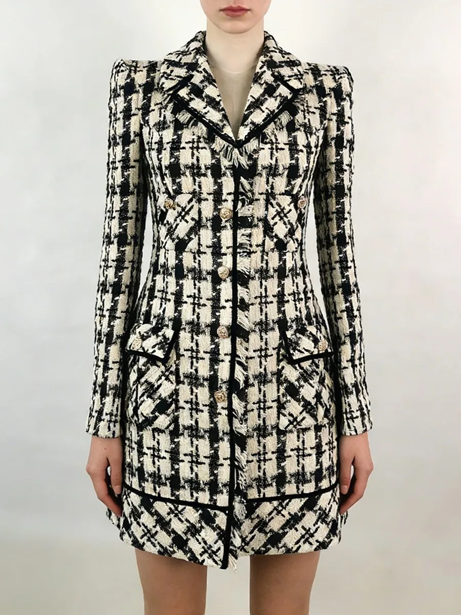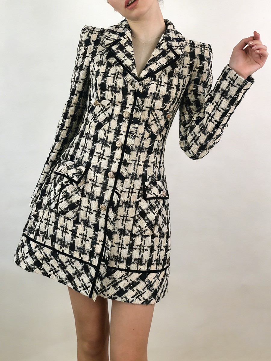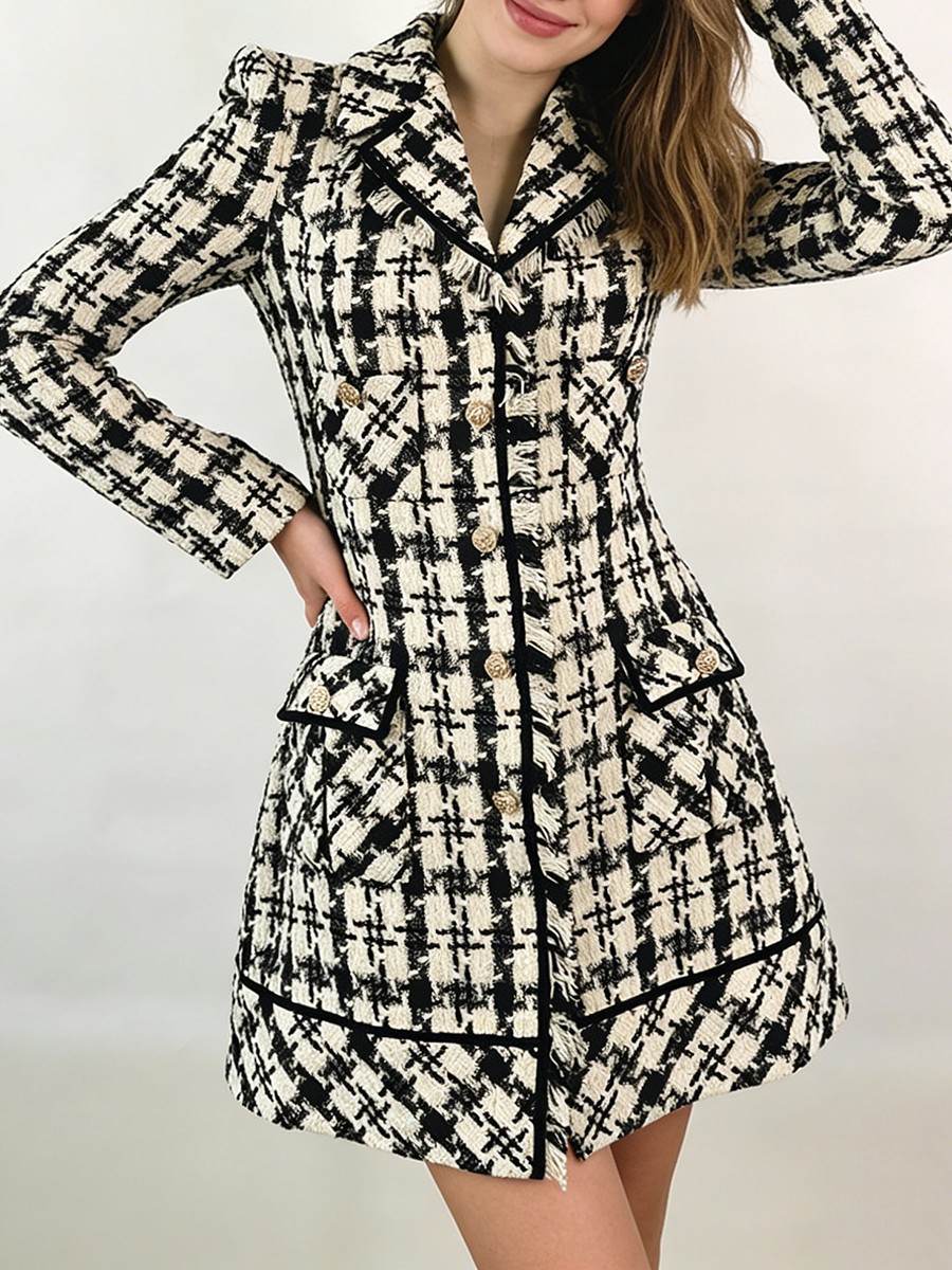 TWOTWINSTYLE Slimming Spliced Plaid Mini Dresses for Women Lapel Long Sleeves Tunic Patchwork Pockets Design Sense Dress Female