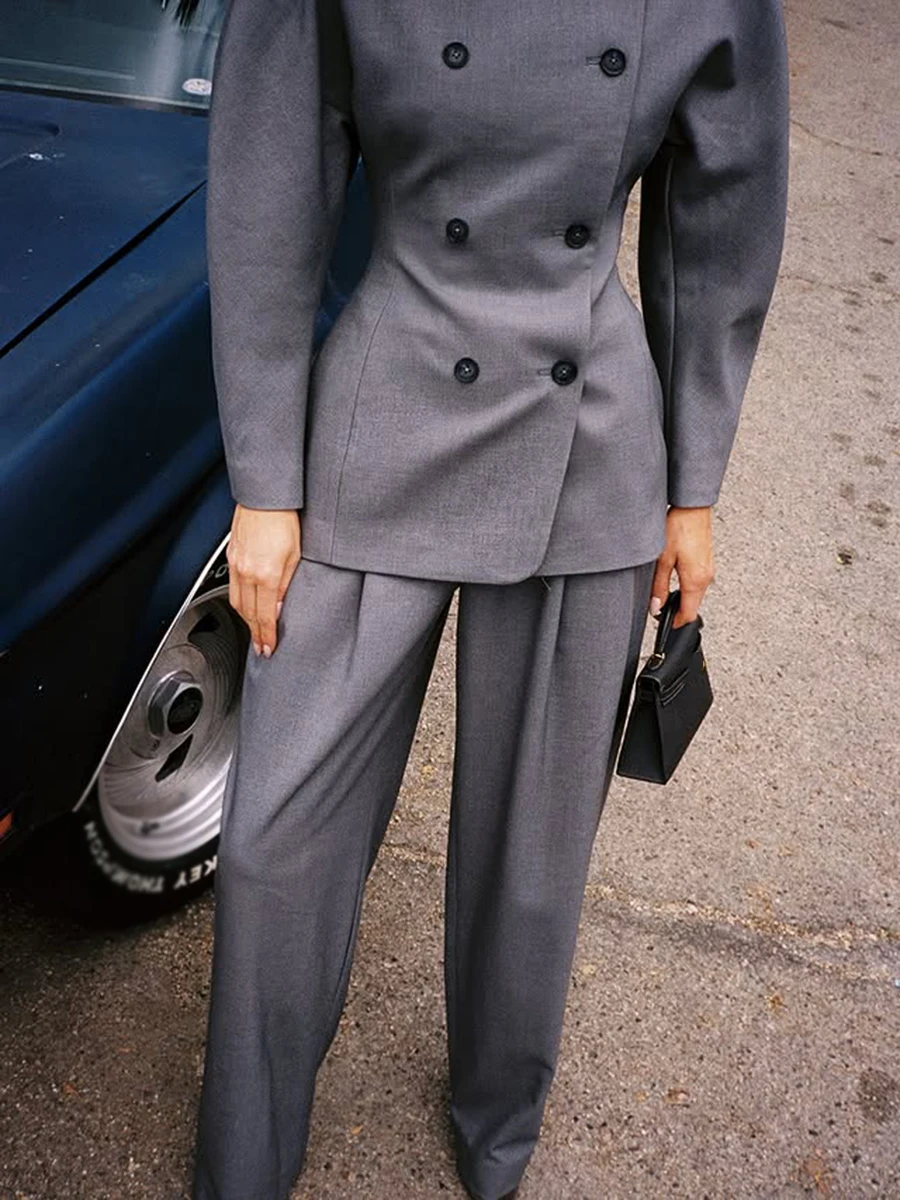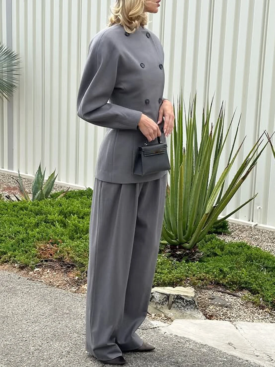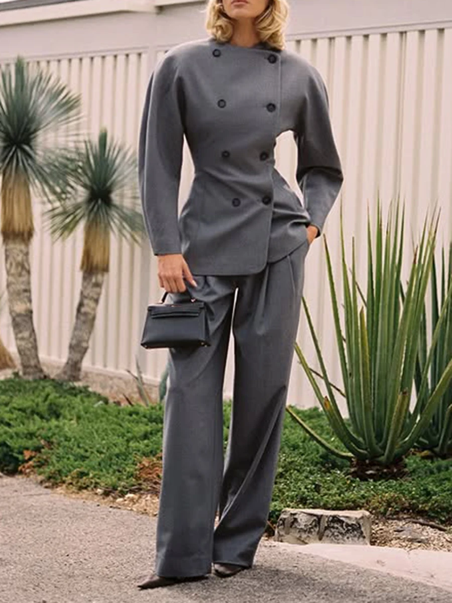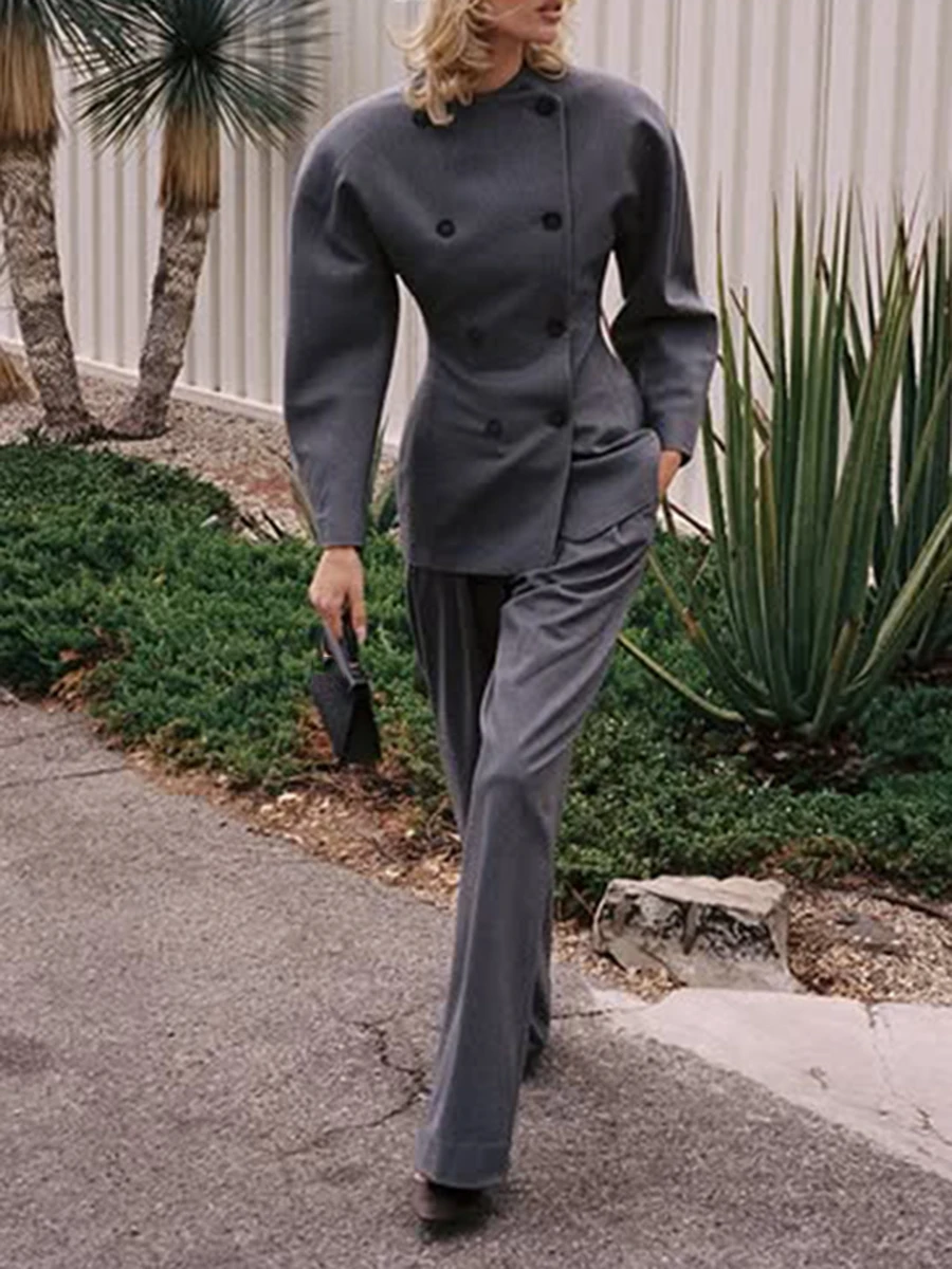 TWOTWINSTYLE Solid Fashion Two Piece Sets for Women O Neck Long Sleeves Spliced Double Breasted Coat High Waist Pant Set Female