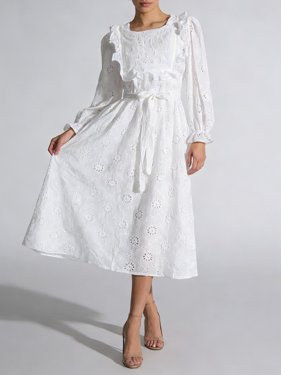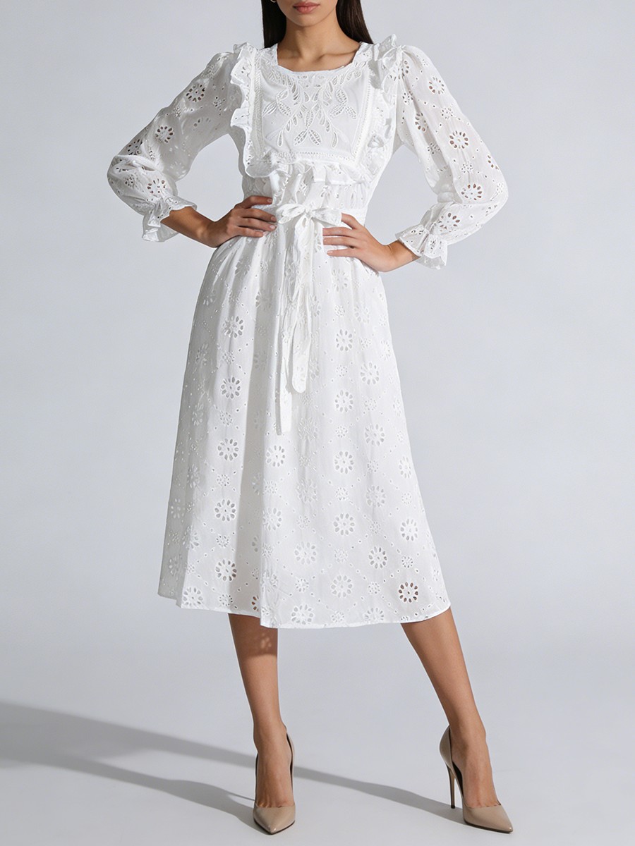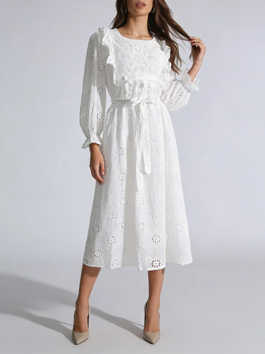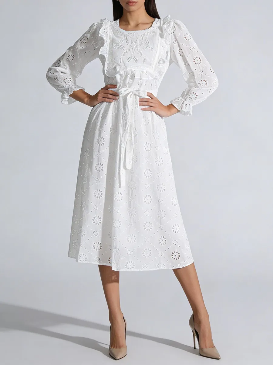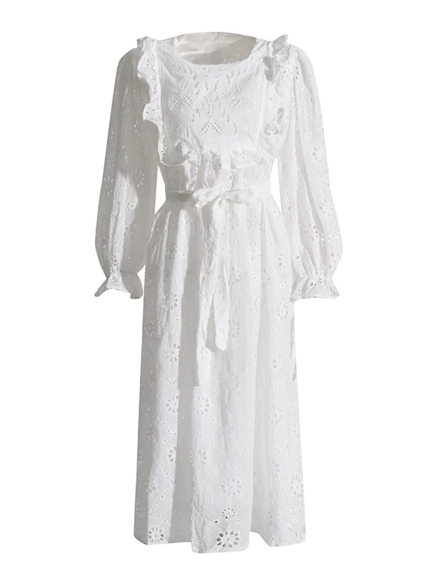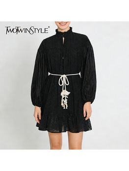 TWOTWINSTYLE Solid Hollow Out Spliced Ruffles Elegant Dress for Women O Neck Long Sleeves Patchwork Embroidery Dresses Female