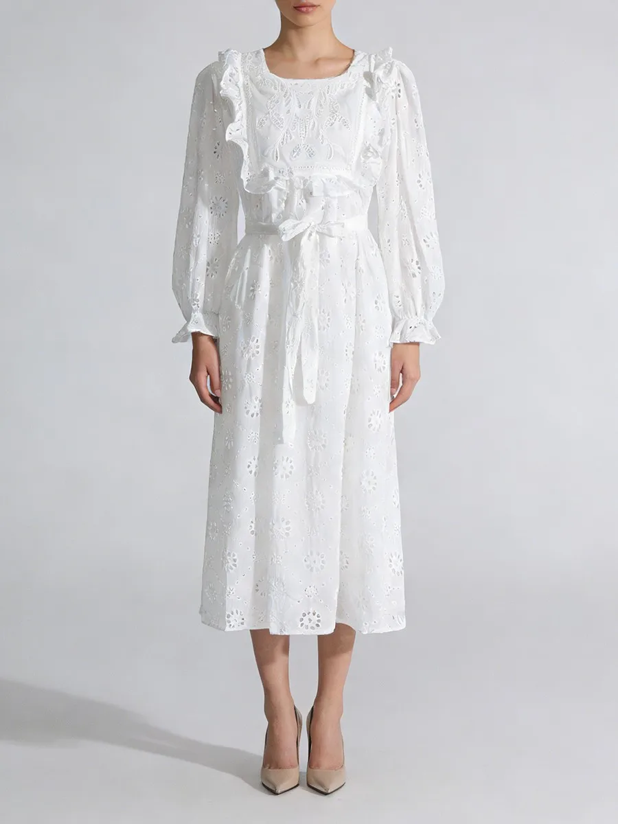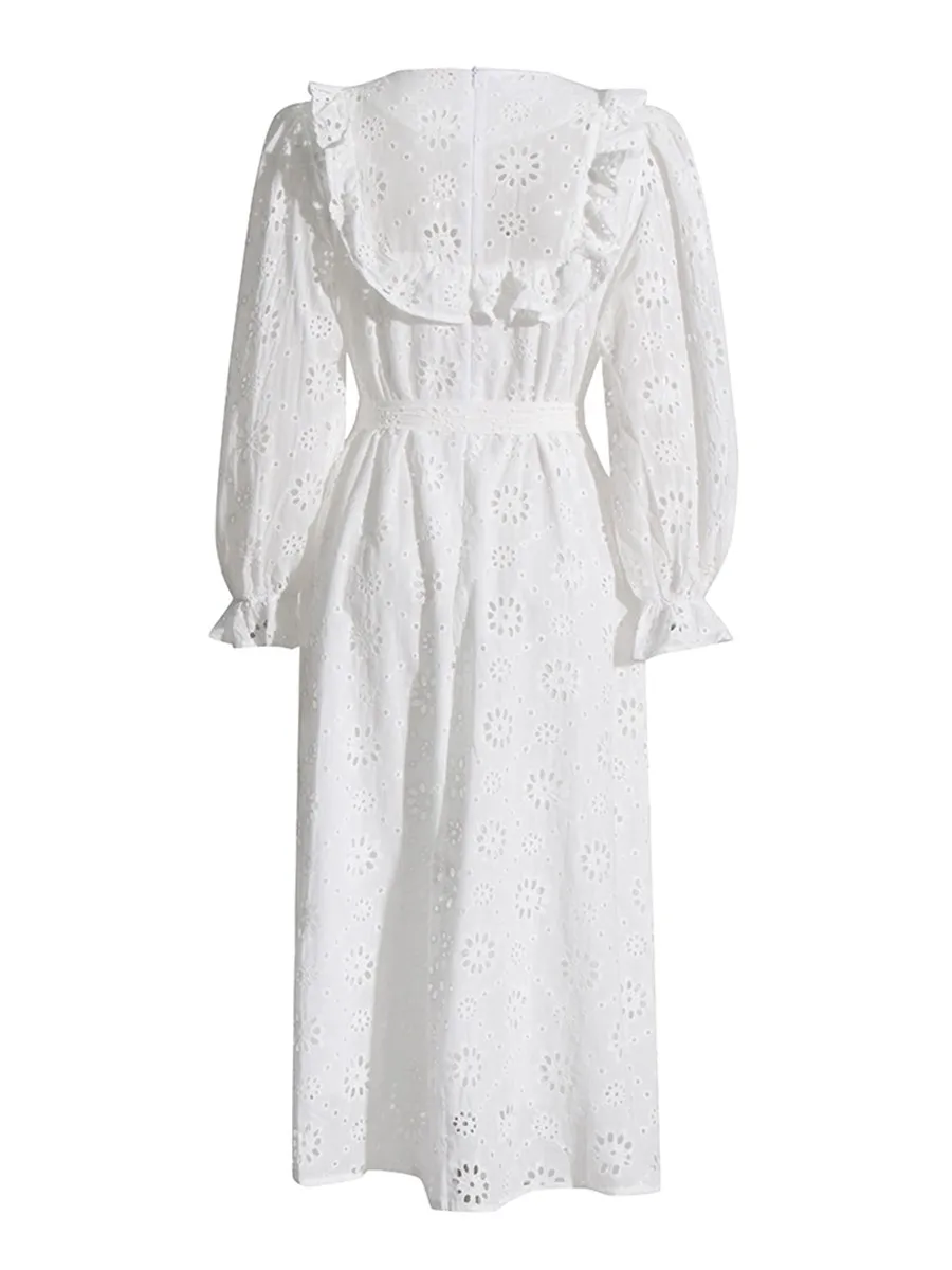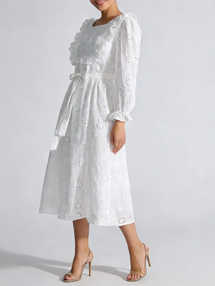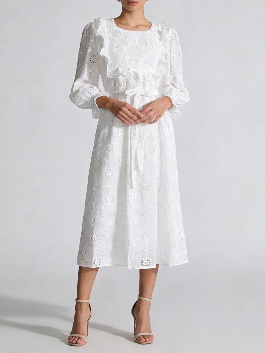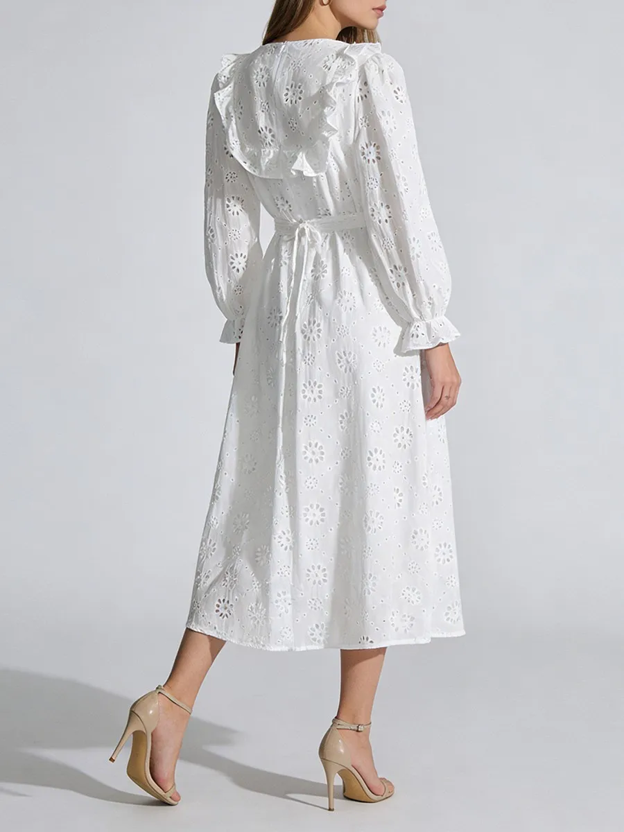 TWOTWINSTYLE Solid Hollow Out Spliced Ruffles Elegant Dress for Women O Neck Long Sleeves Patchwork Embroidery Dresses Female
