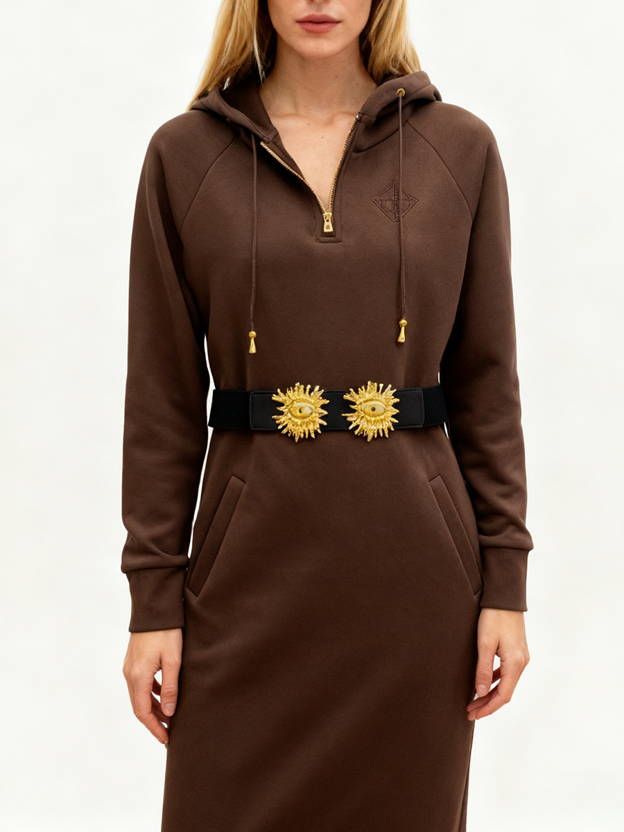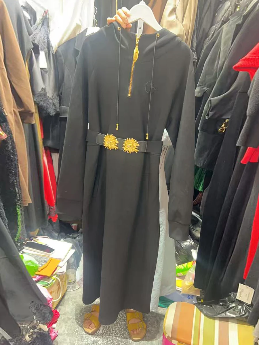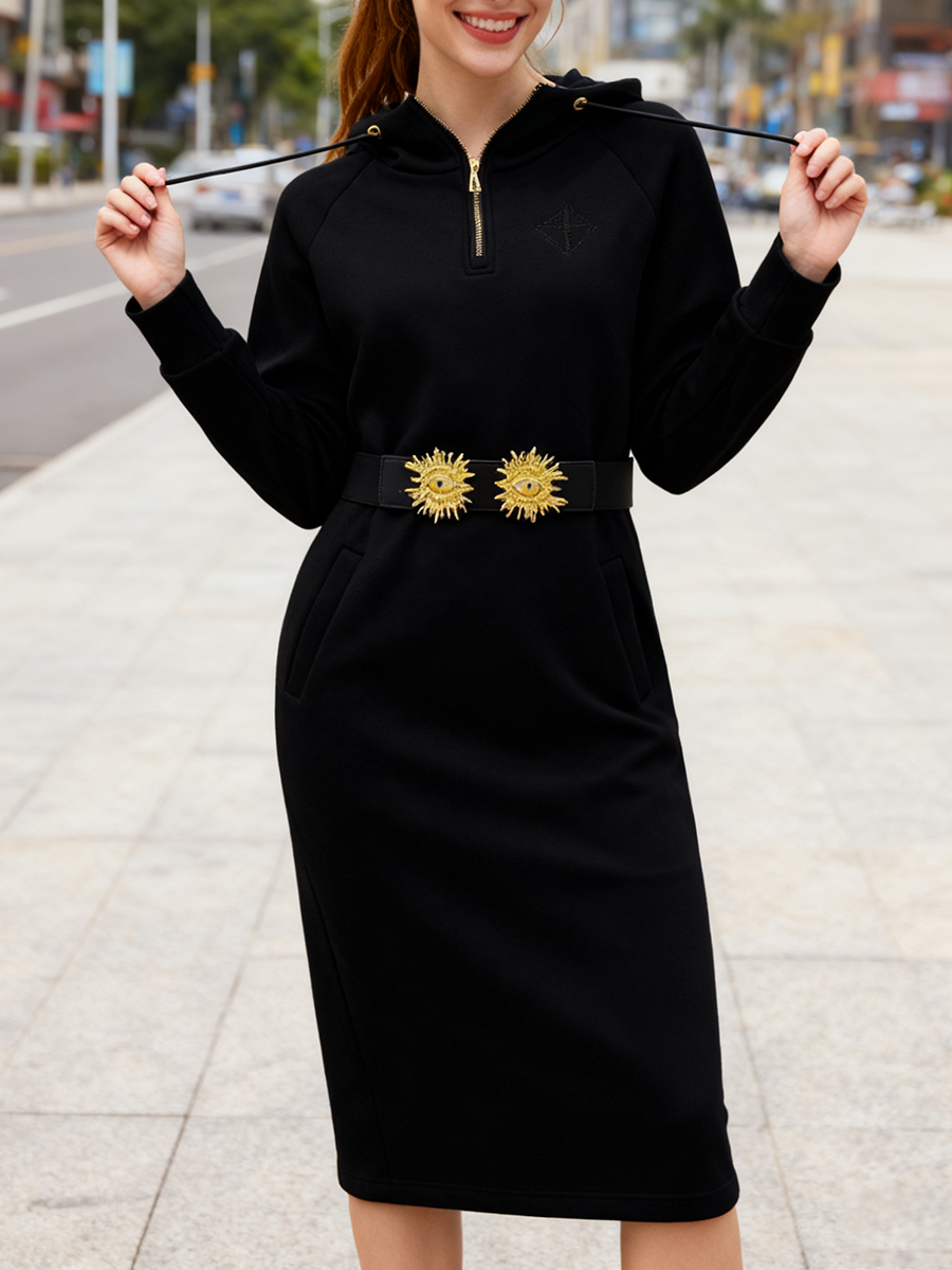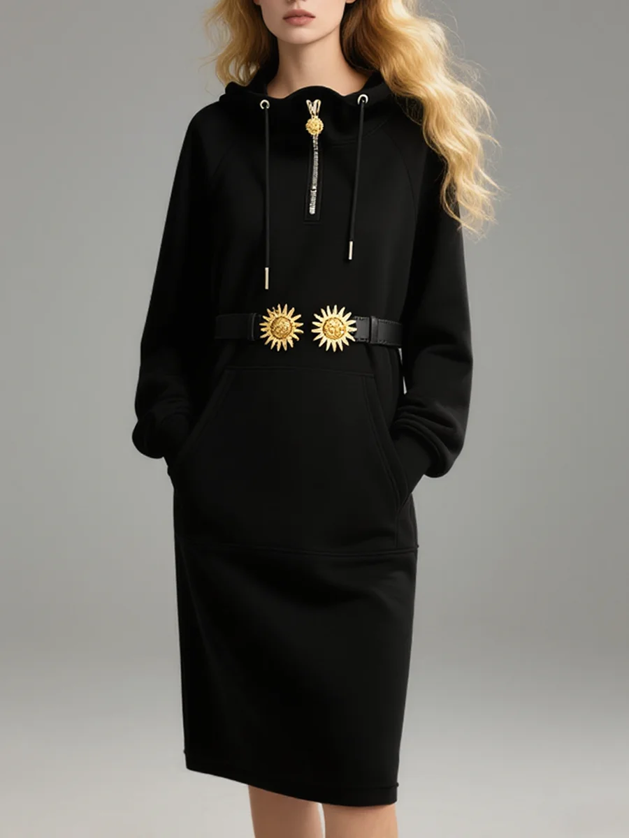 TWOTWINSTYLE Solid Loose Spliced Belt Casual Dresses for Women Hooded Collar Long Sleeves Patchwork Zipper Fashion Dress Female