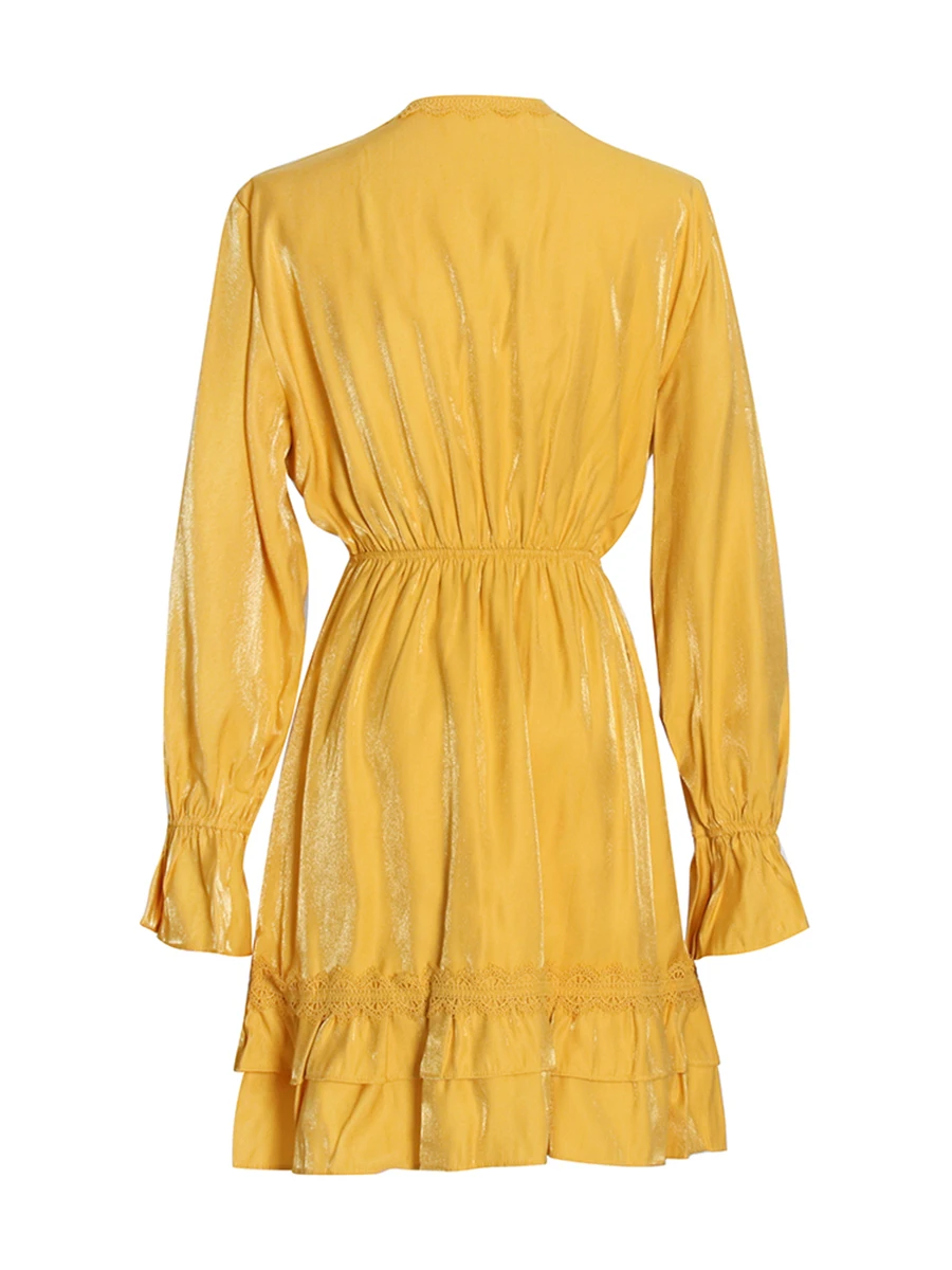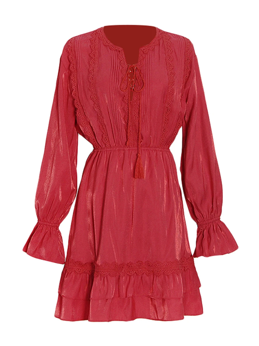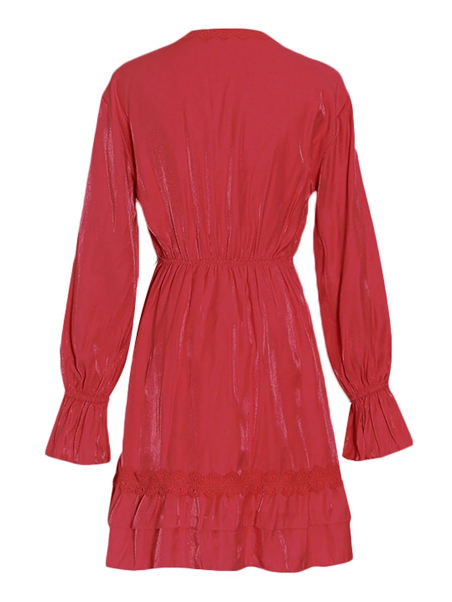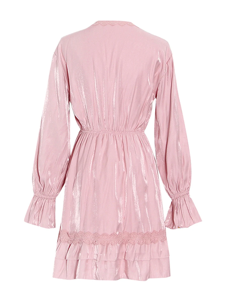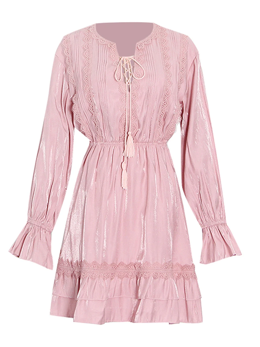 TWOTWINSTYLE Solid Loose Spliced Lace Fashion Dresses for Women V Neck Long Sleeves Patchwork Ruched Casual Dress Female Clothes