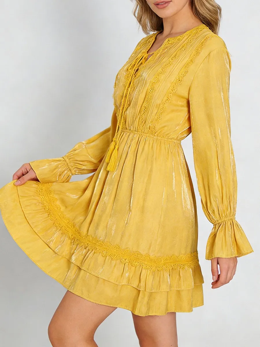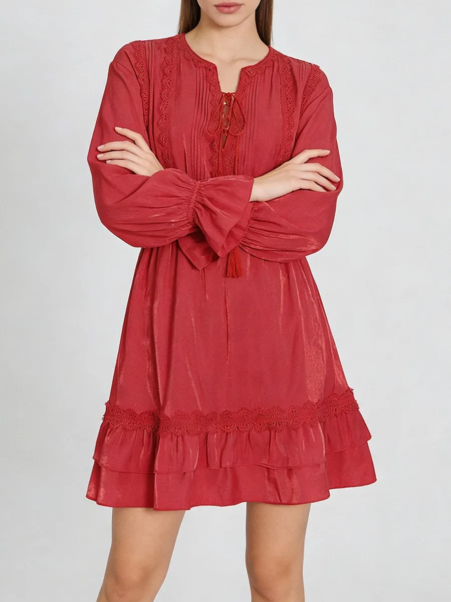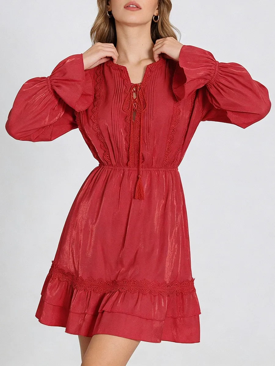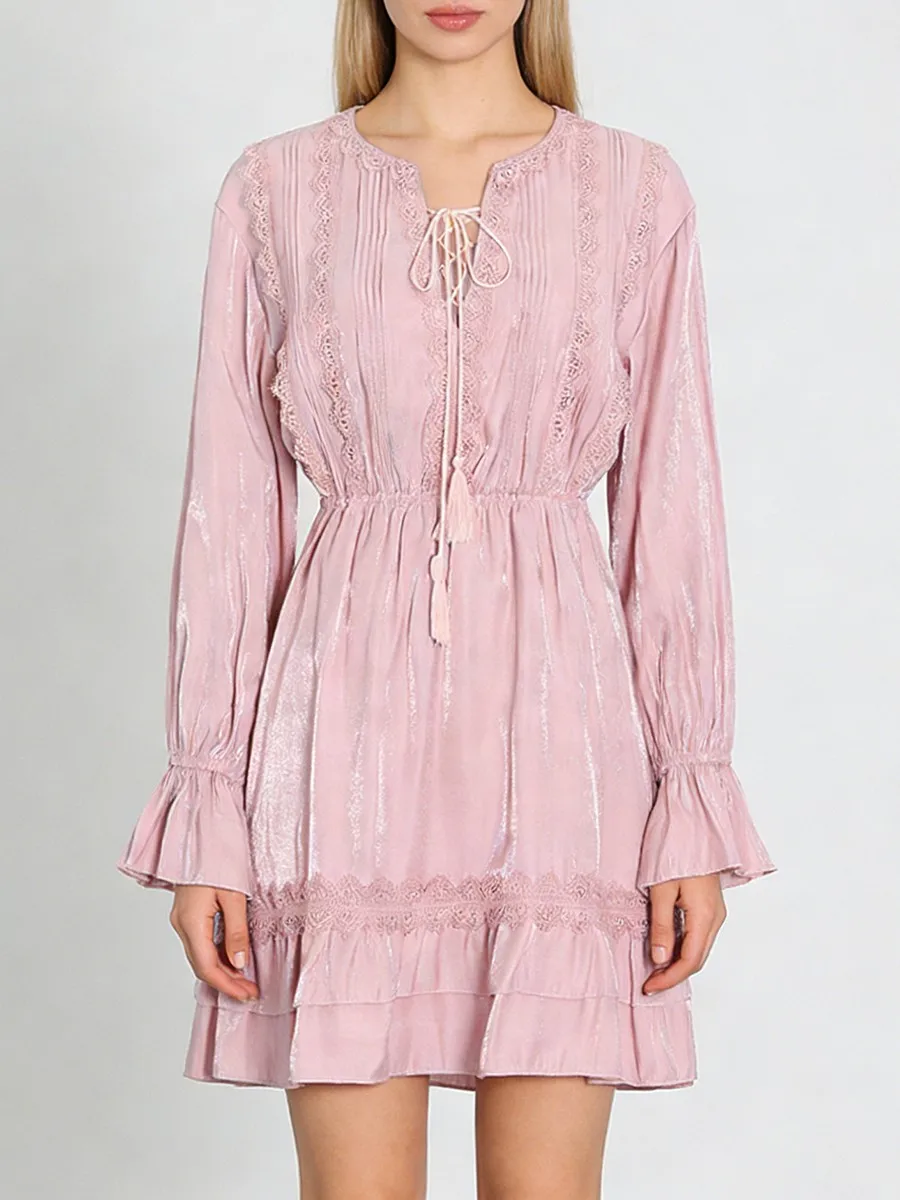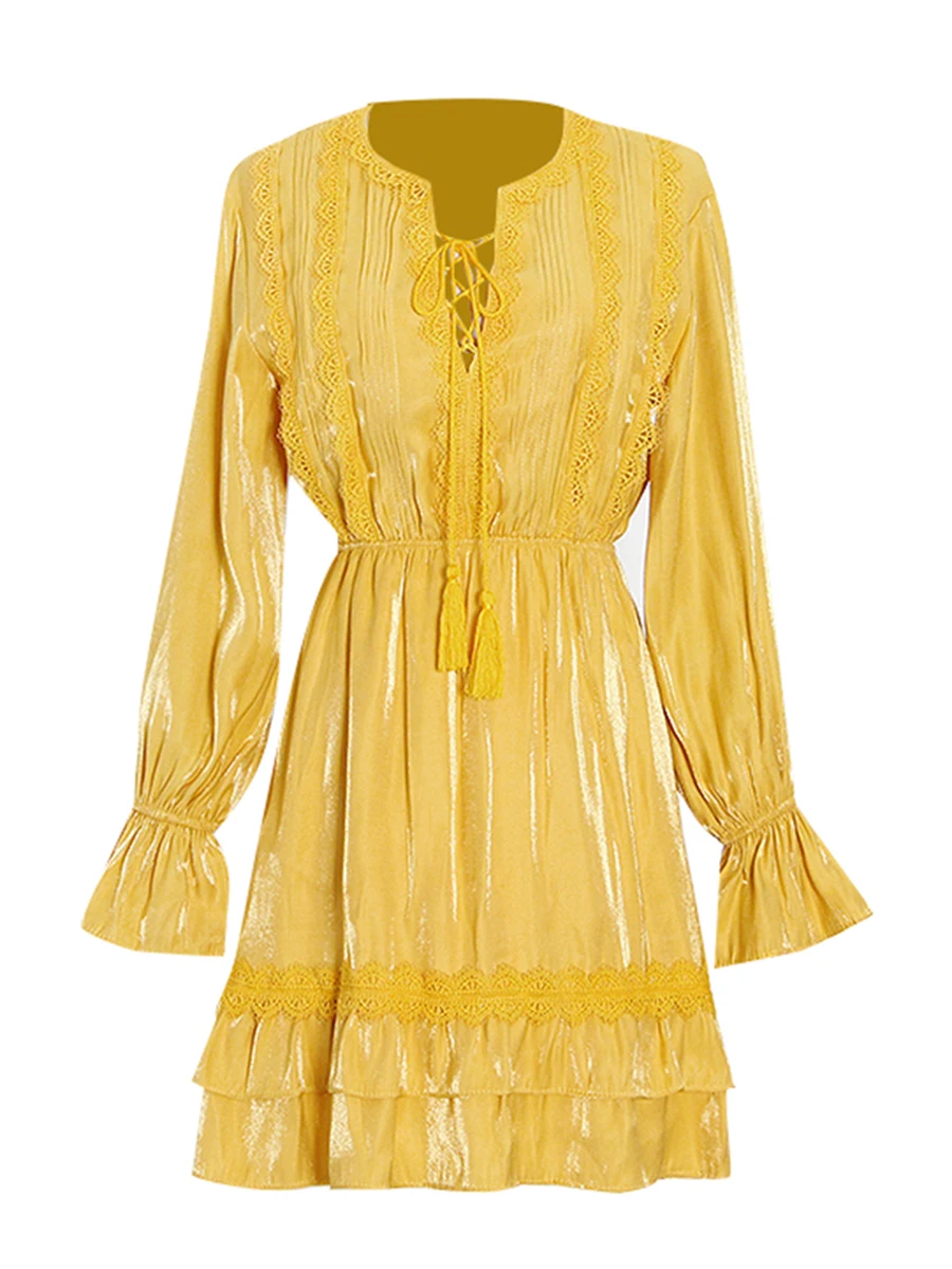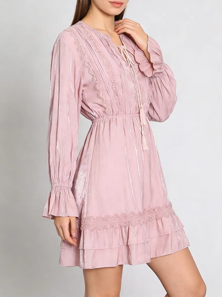 TWOTWINSTYLE Solid Loose Spliced Lace Fashion Dresses for Women V Neck Long Sleeves Patchwork Ruched Casual Dress Female Clothes