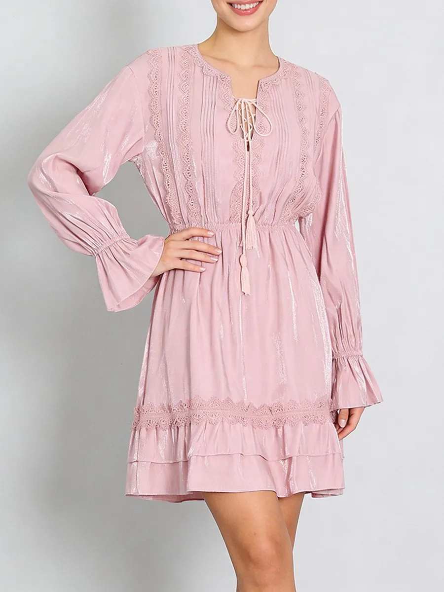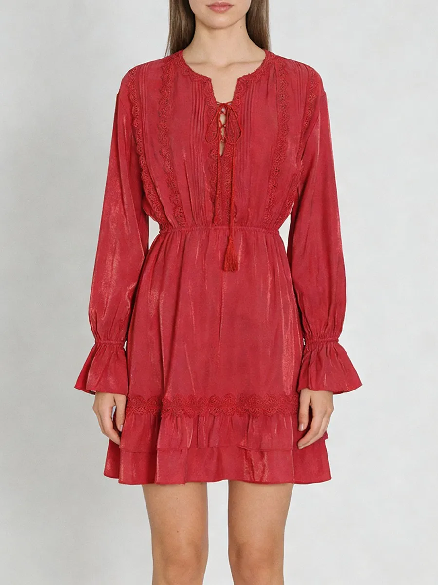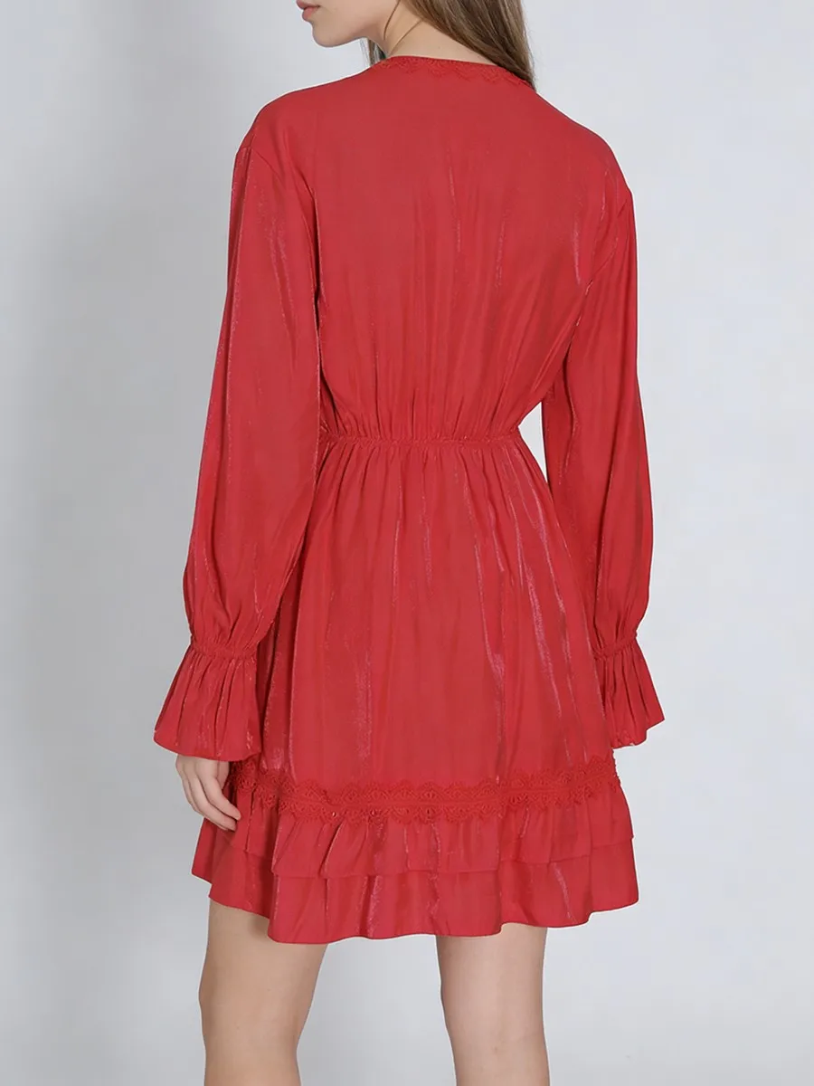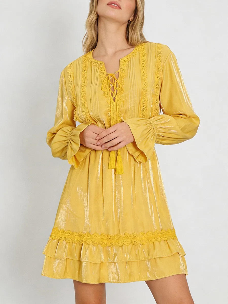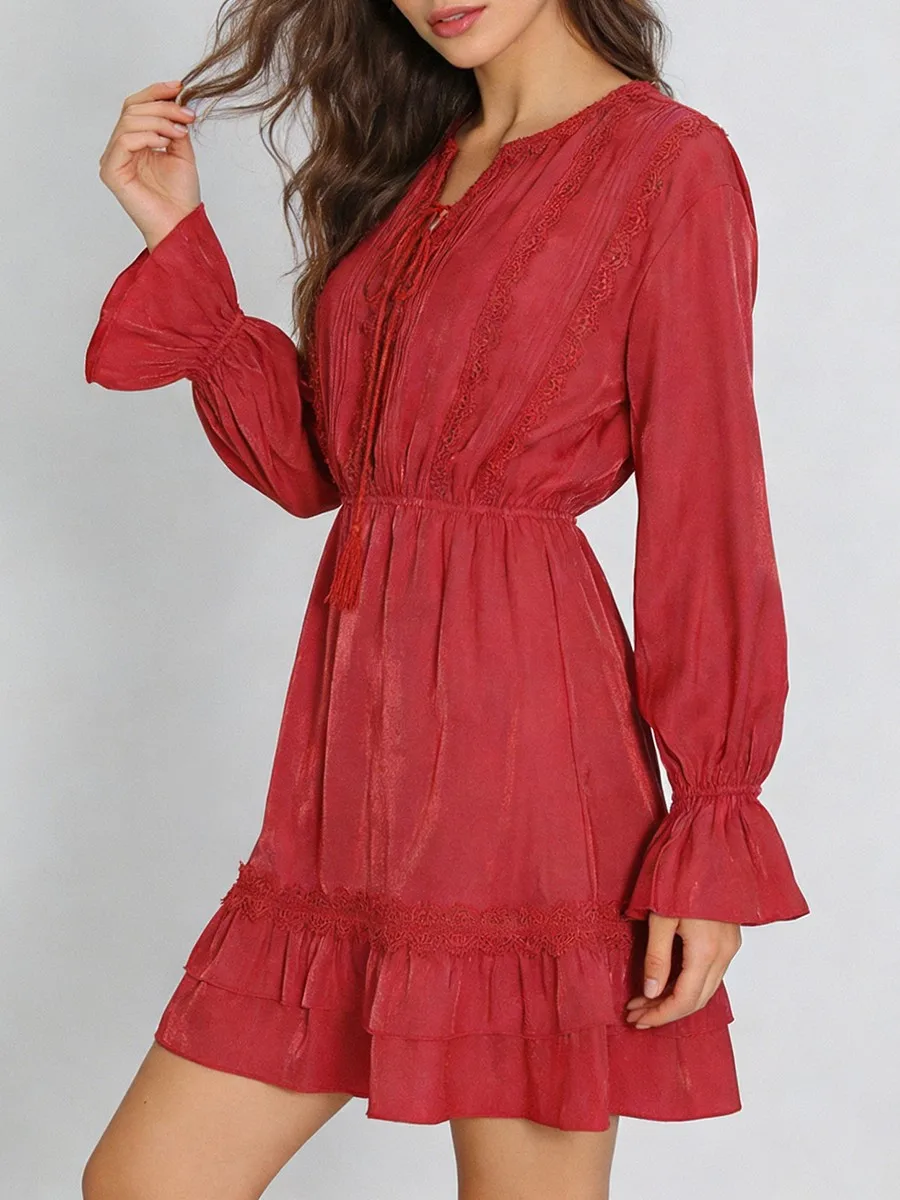 TWOTWINSTYLE Solid Loose Spliced Lace Fashion Dresses for Women V Neck Long Sleeves Patchwork Ruched Casual Dress Female Clothes