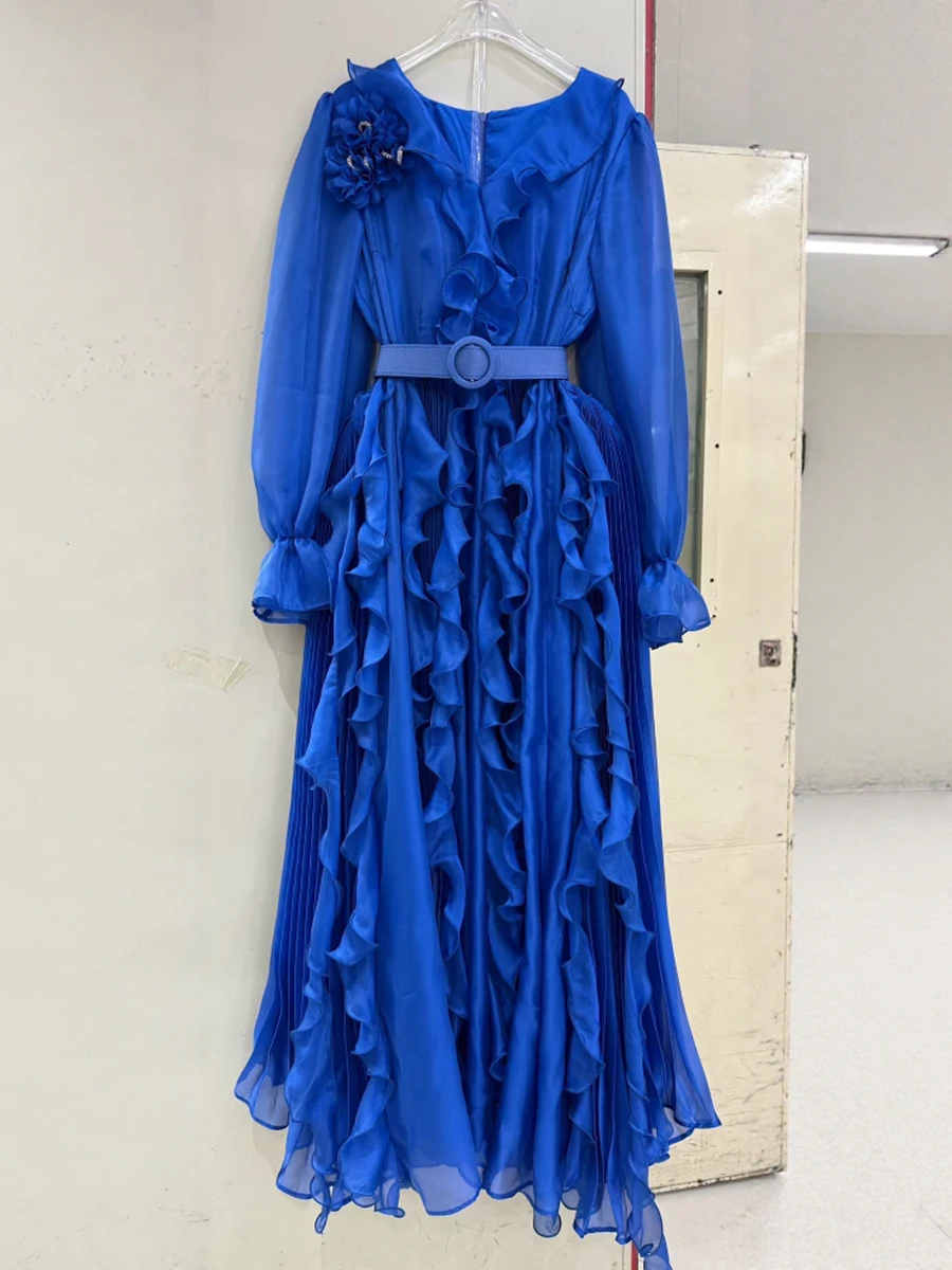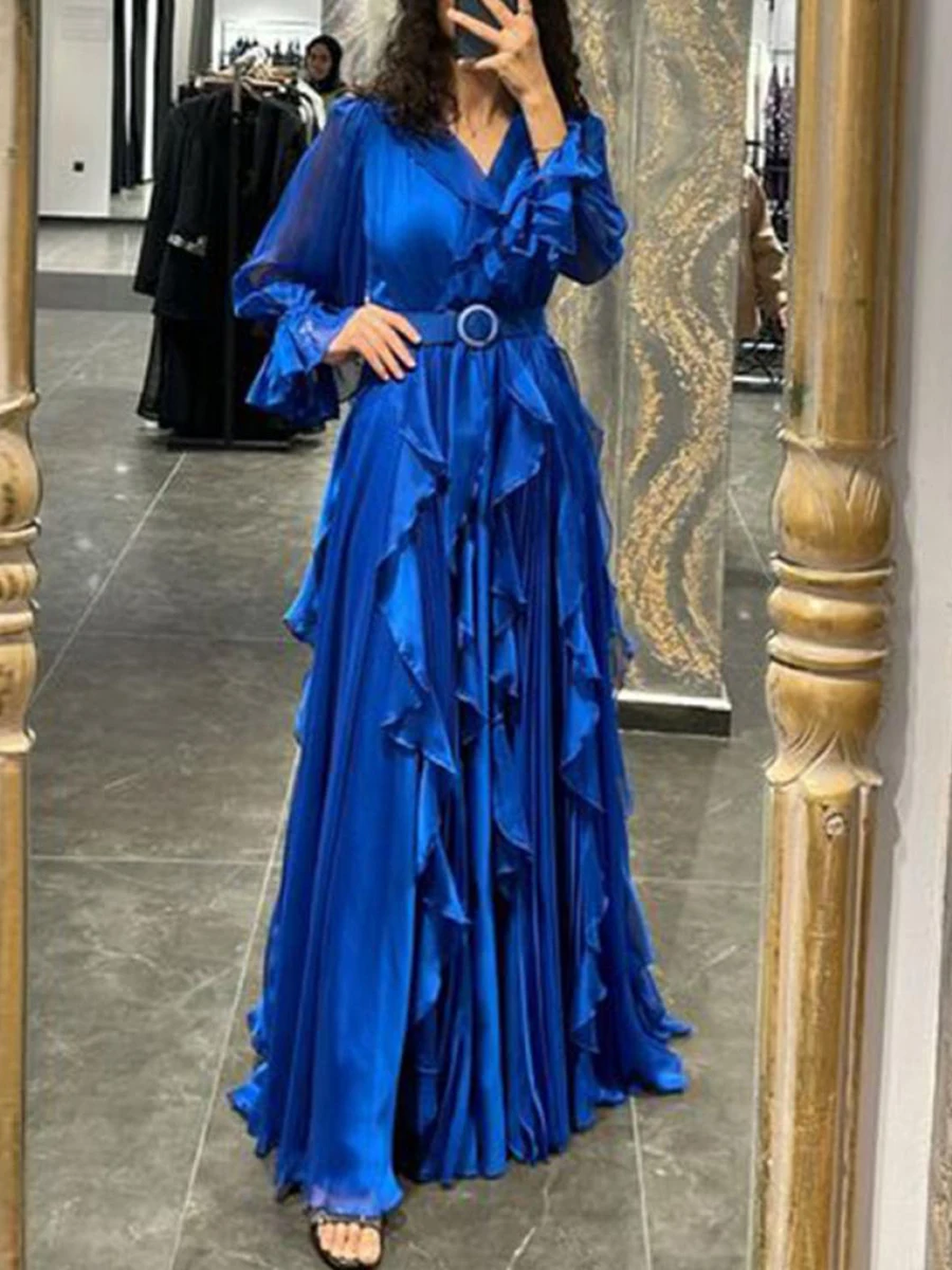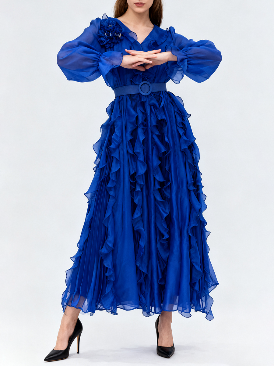 TWOTWINSTYLE Solid Sheer Spliced Fungus Folds Elegant Dresses for Women V Neck Long Sleeves Patchwork Belt Fashion Dress Female