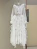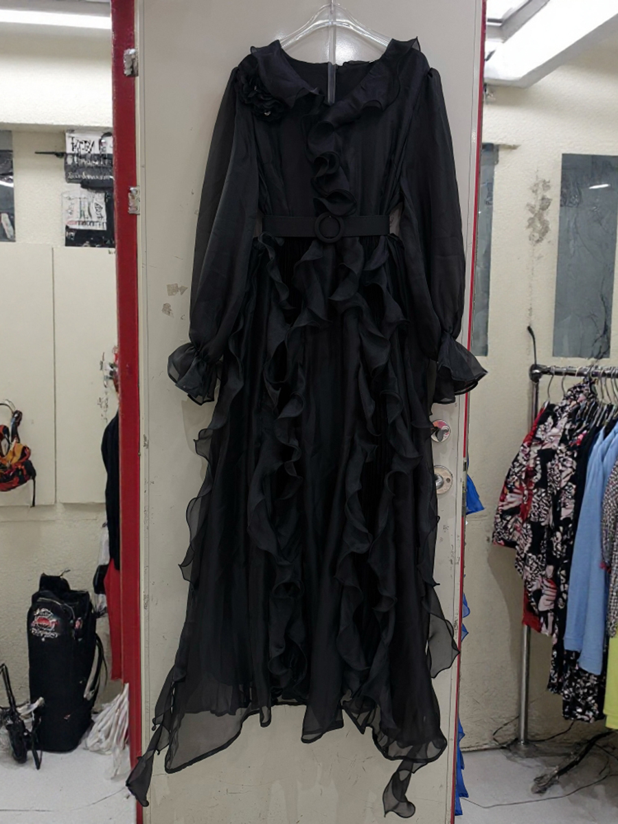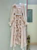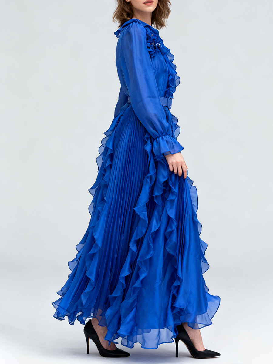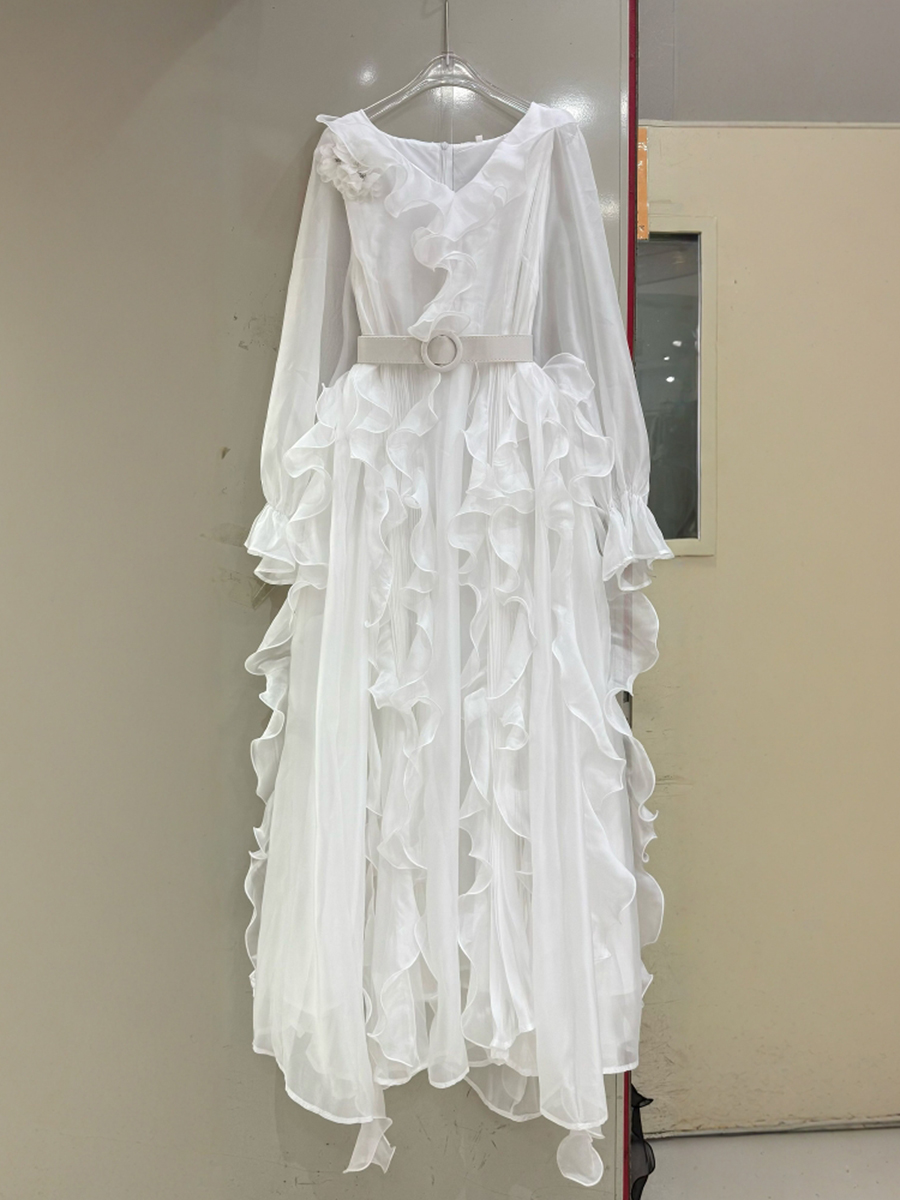 TWOTWINSTYLE Solid Sheer Spliced Fungus Folds Elegant Dresses for Women V Neck Long Sleeves Patchwork Belt Fashion Dress Female
