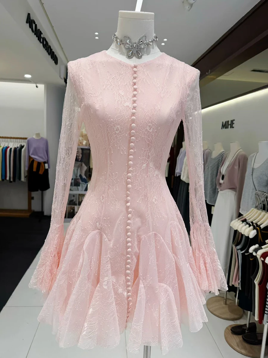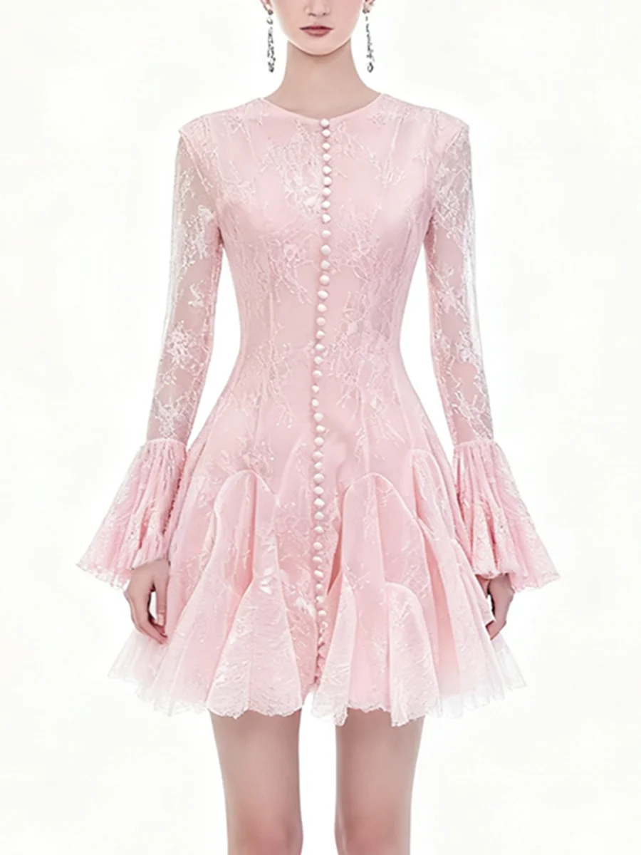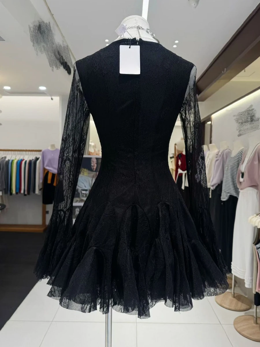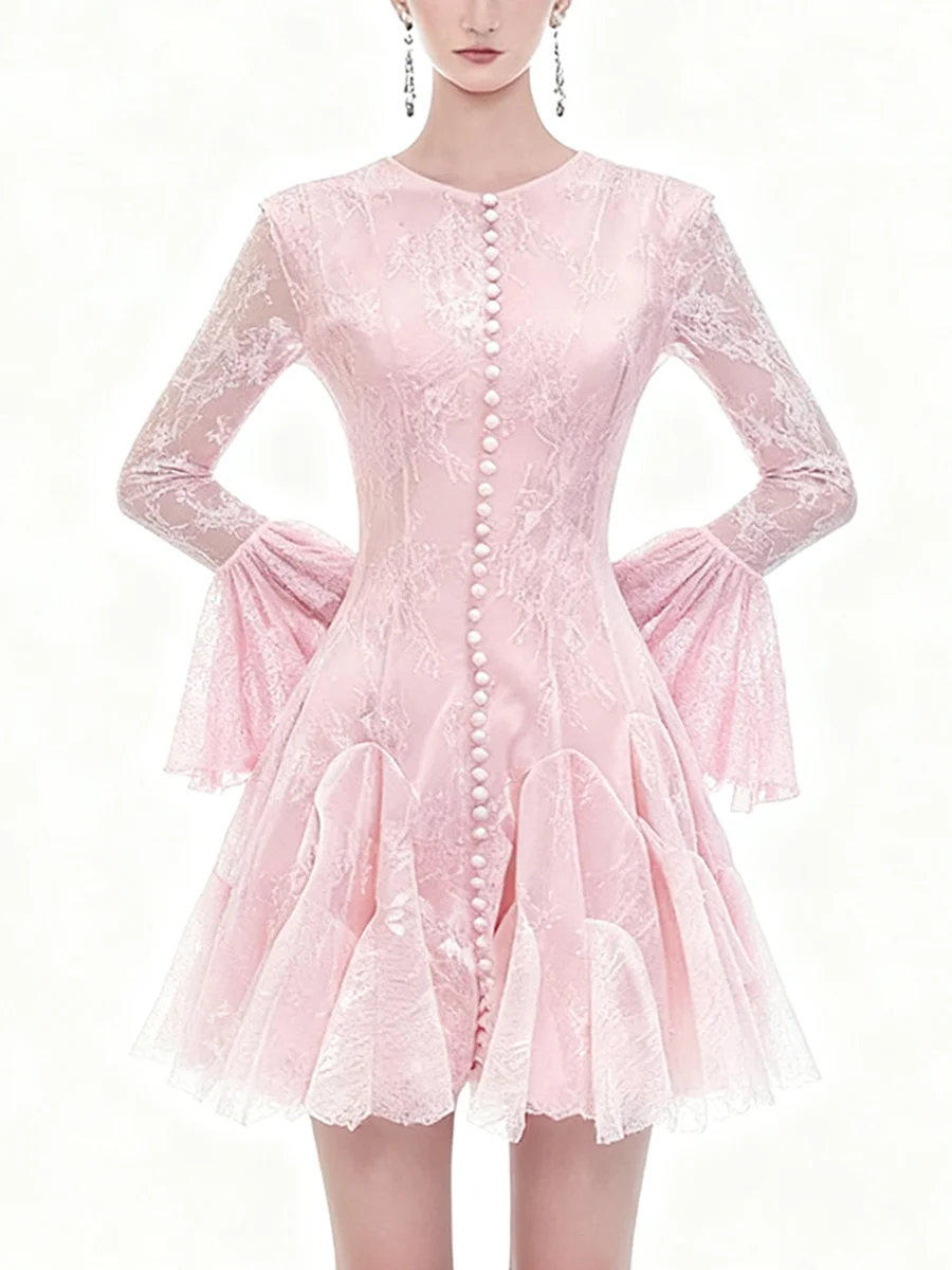 TWOTWINSTYLE Solid Sheer Spliced Lace Sweet Dresses for Women Round Neck Long Sleeves Patchwork Ruffles Elegant Dress Female New
