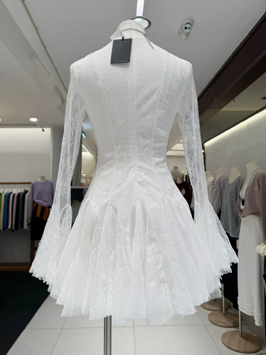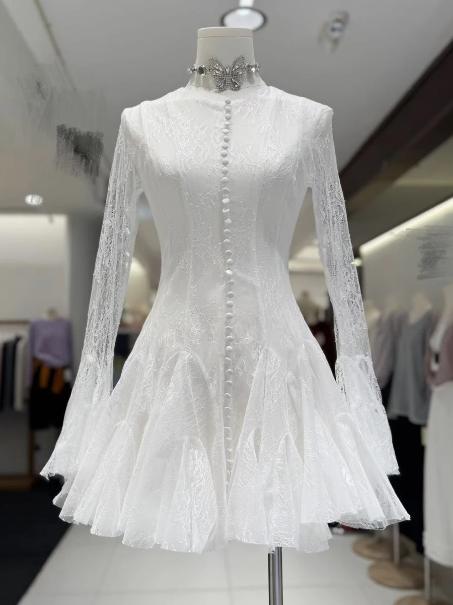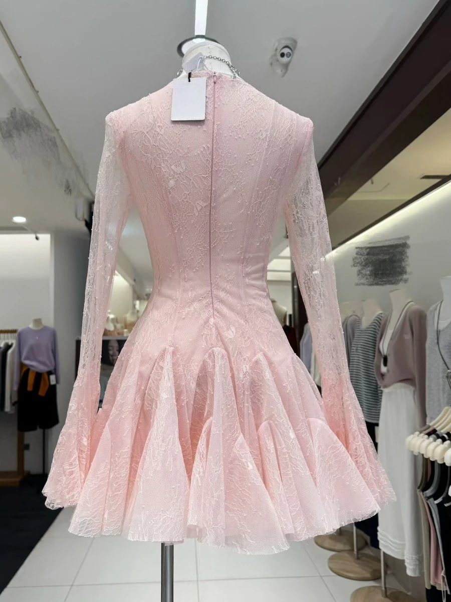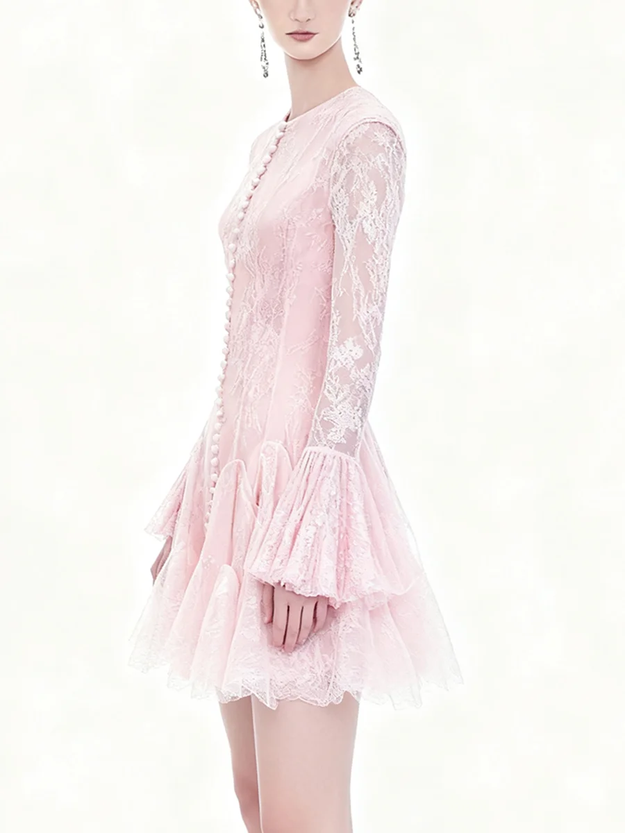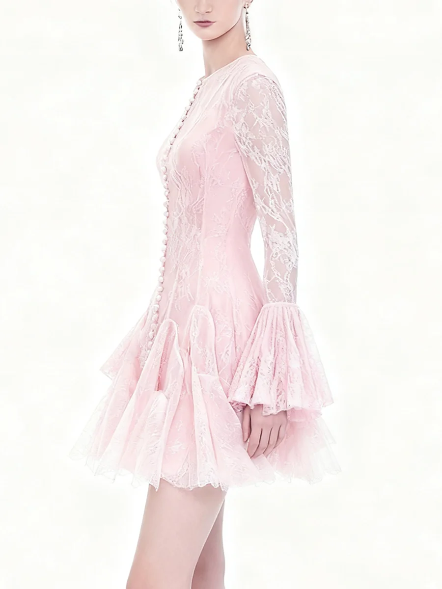 TWOTWINSTYLE Solid Sheer Spliced Lace Sweet Dresses for Women Round Neck Long Sleeves Patchwork Ruffles Elegant Dress Female New