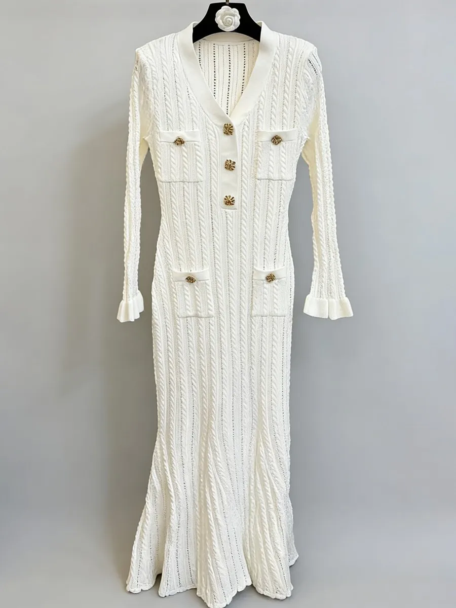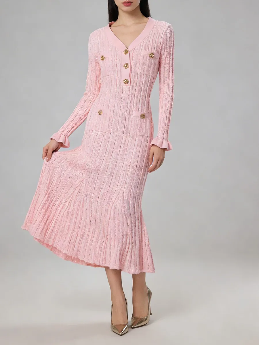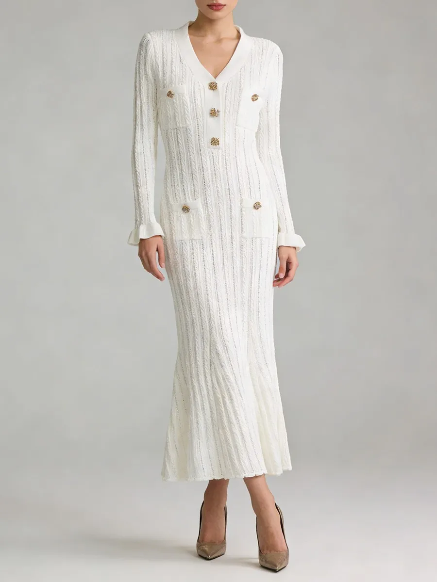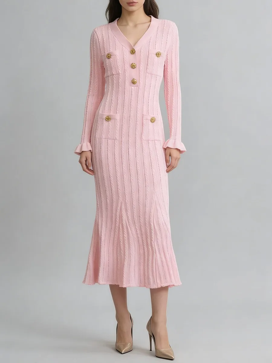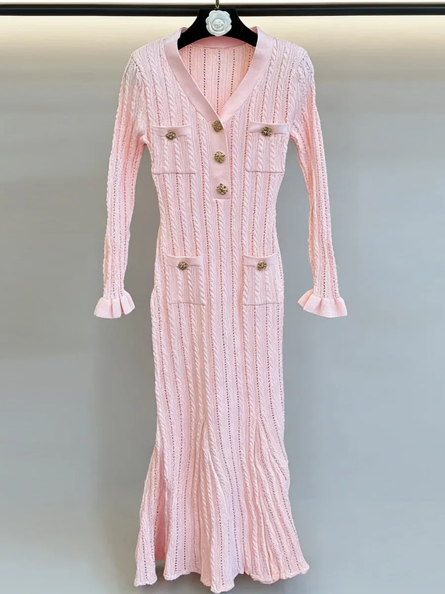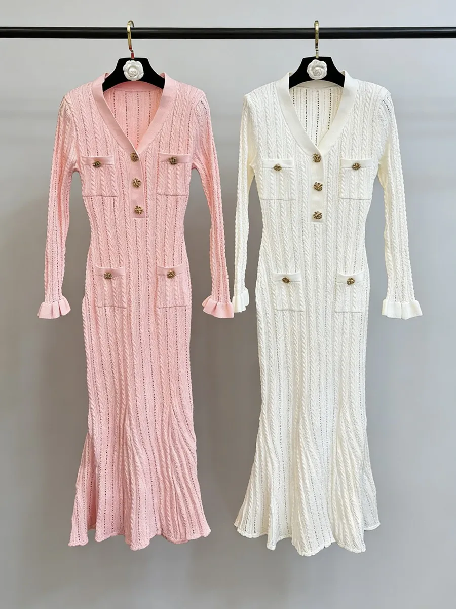 TWOTWINSTYLE Solid Sheer Spliced Striped Elegant Dresses for Women V Neck Long Sleeves Patchwork Pockets Basics Dress Female New