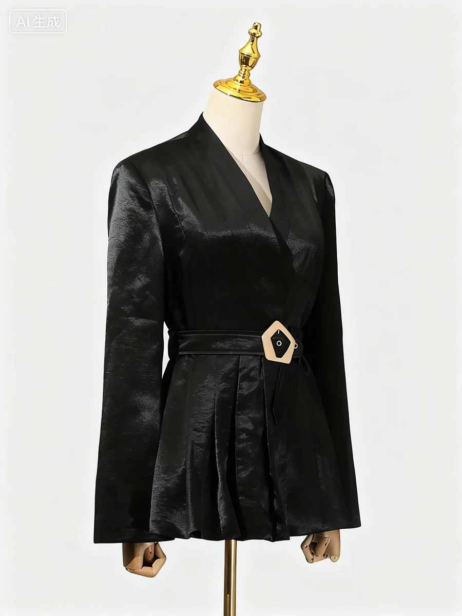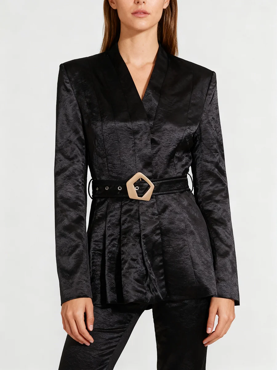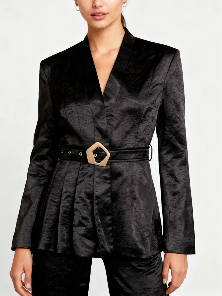 TWOTWINSTYLE Solid Slimming Spliced Belt Minimalist Blazer for Women V Neck Long Sleeves Patchwork Pleating Blazers Female New