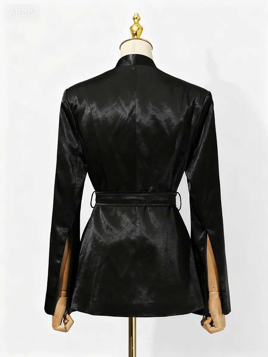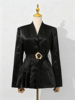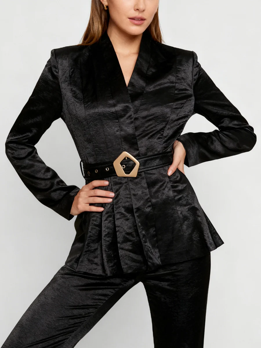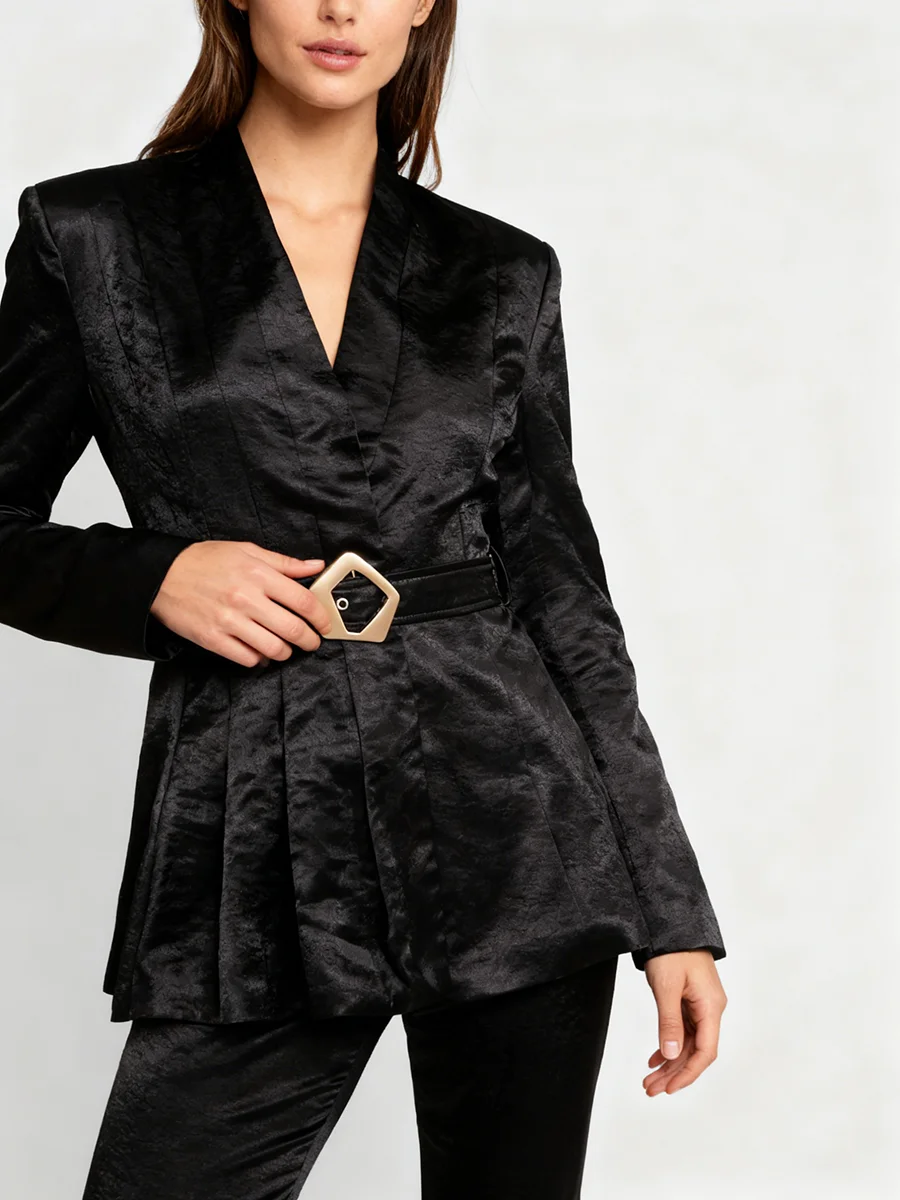 TWOTWINSTYLE Solid Slimming Spliced Belt Minimalist Blazer for Women V Neck Long Sleeves Patchwork Pleating Blazers Female New