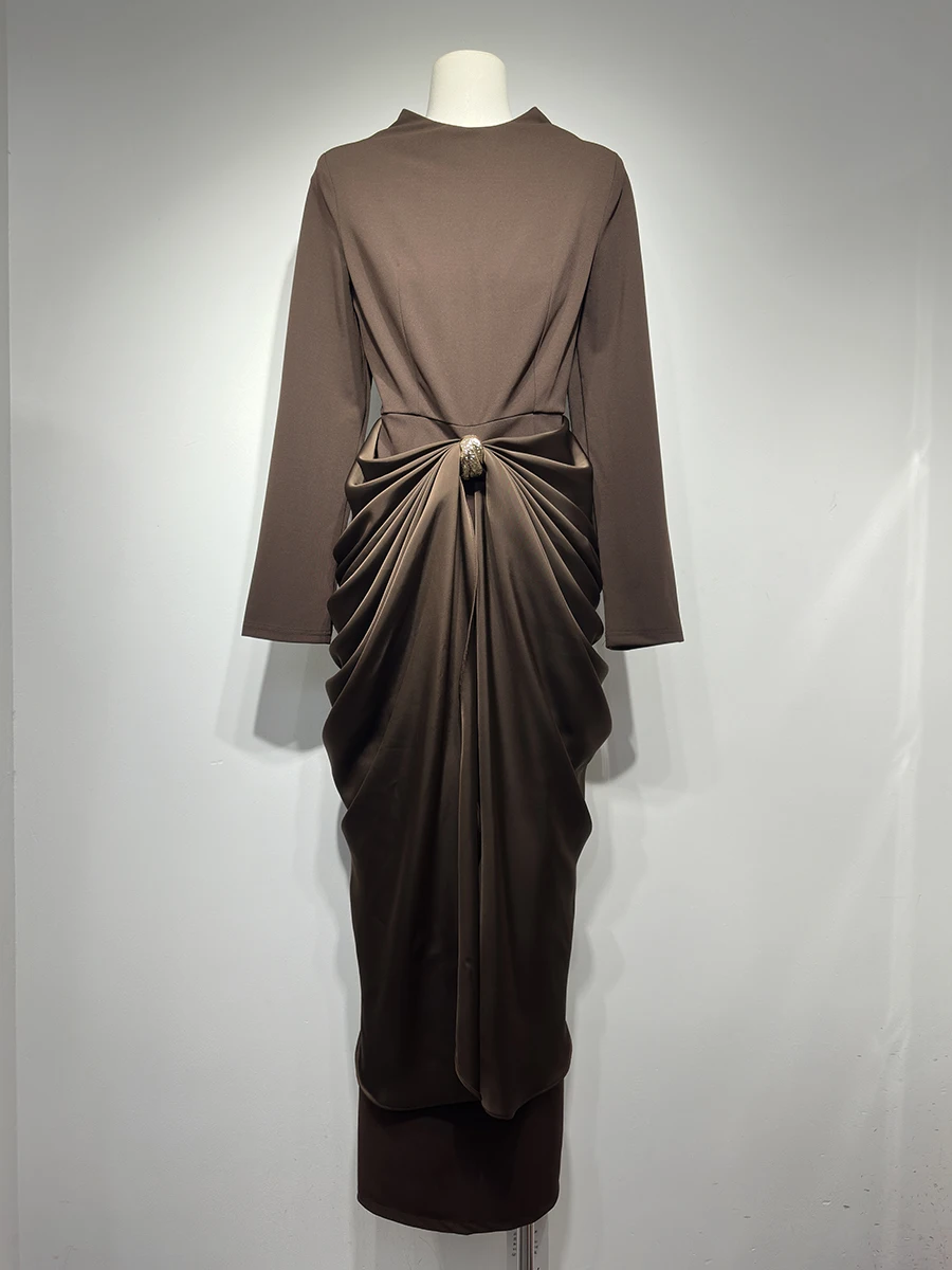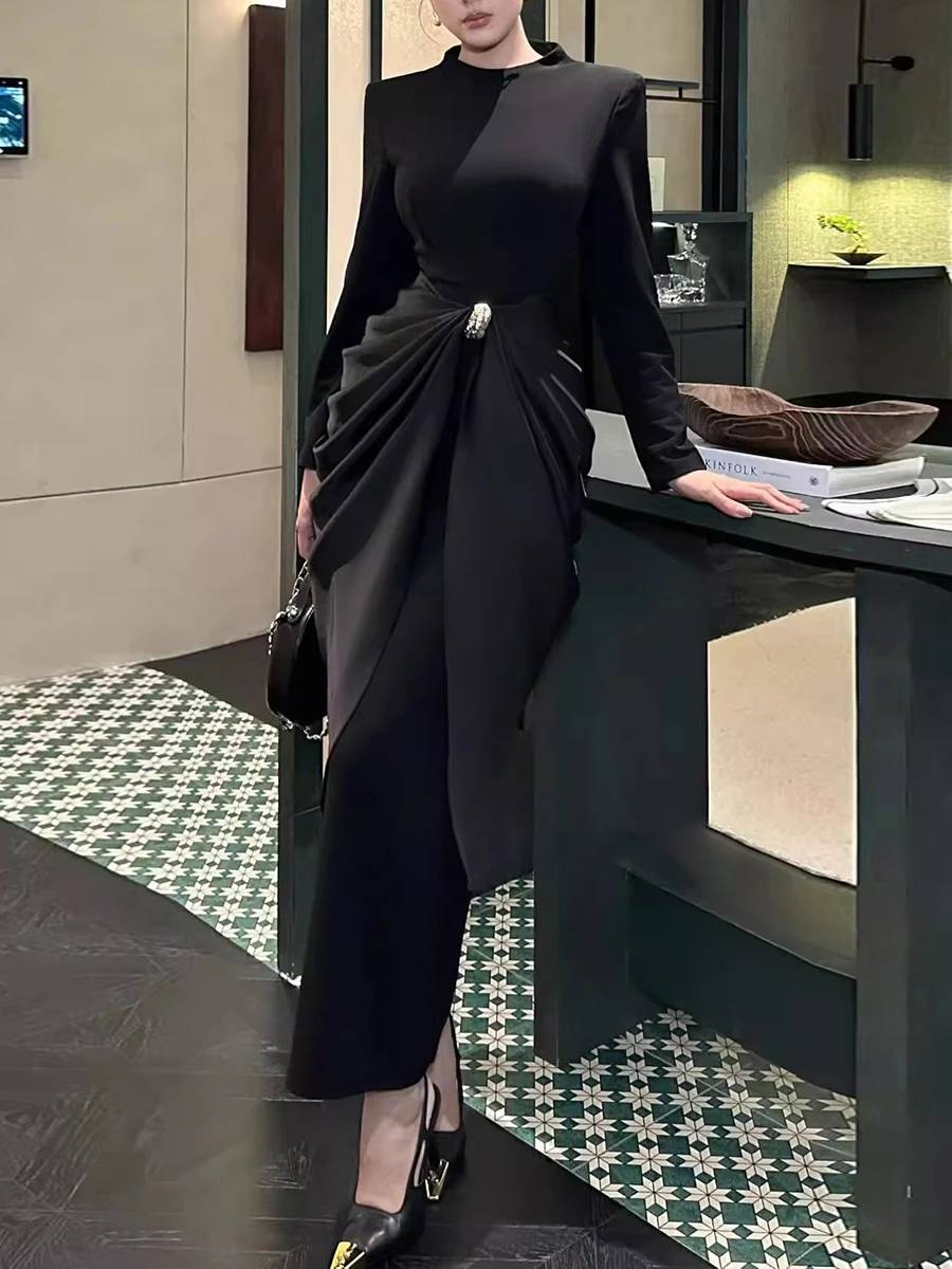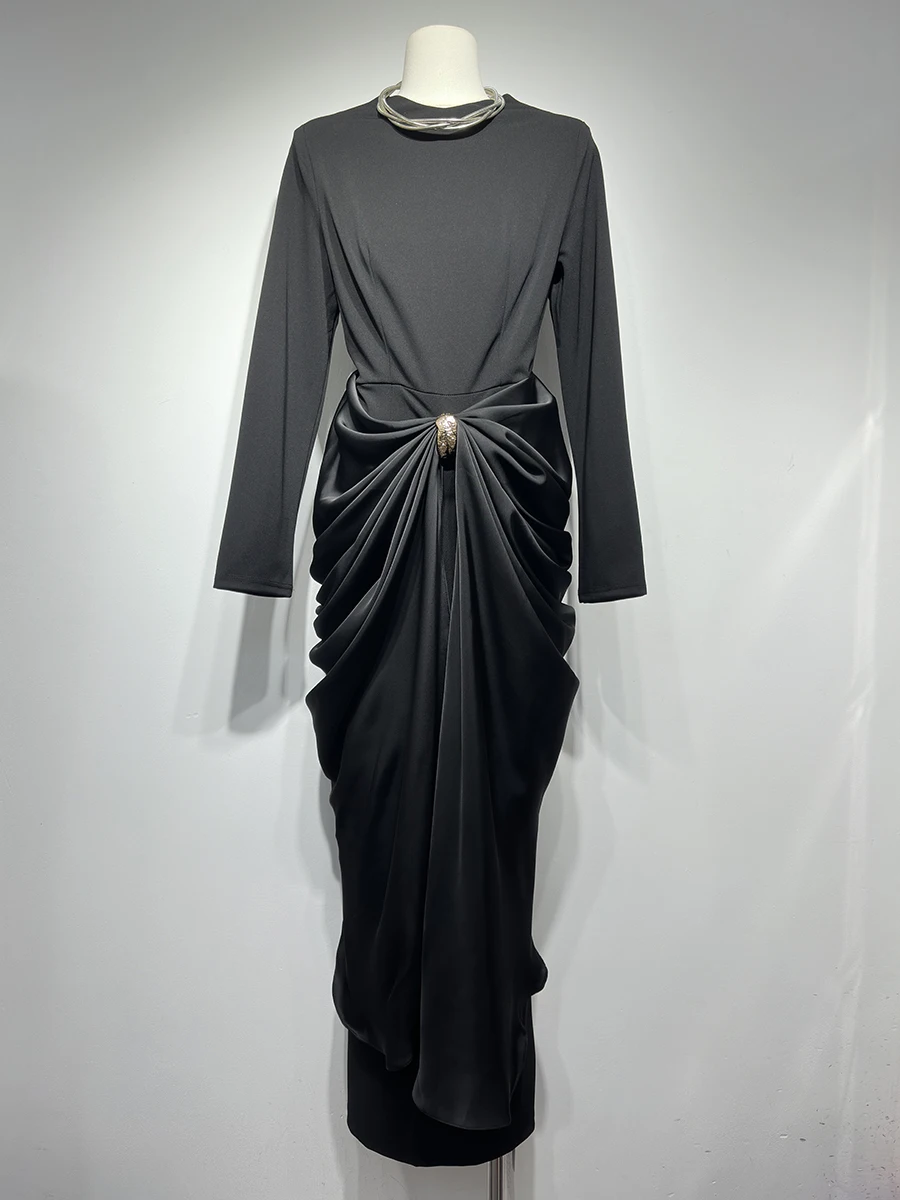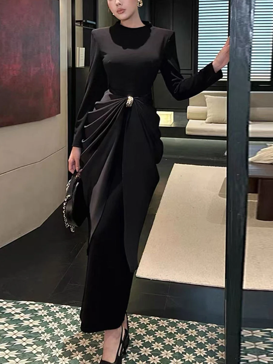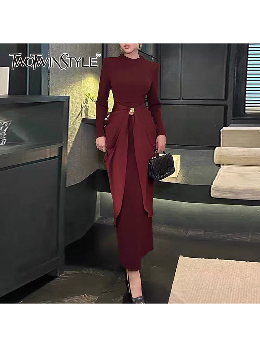 TWOTWINSTYLE Solid Slimming Spliced Folds Elegant Dresses for Women Round Neck Long Sleeves High Waist Dress Female Clothing New