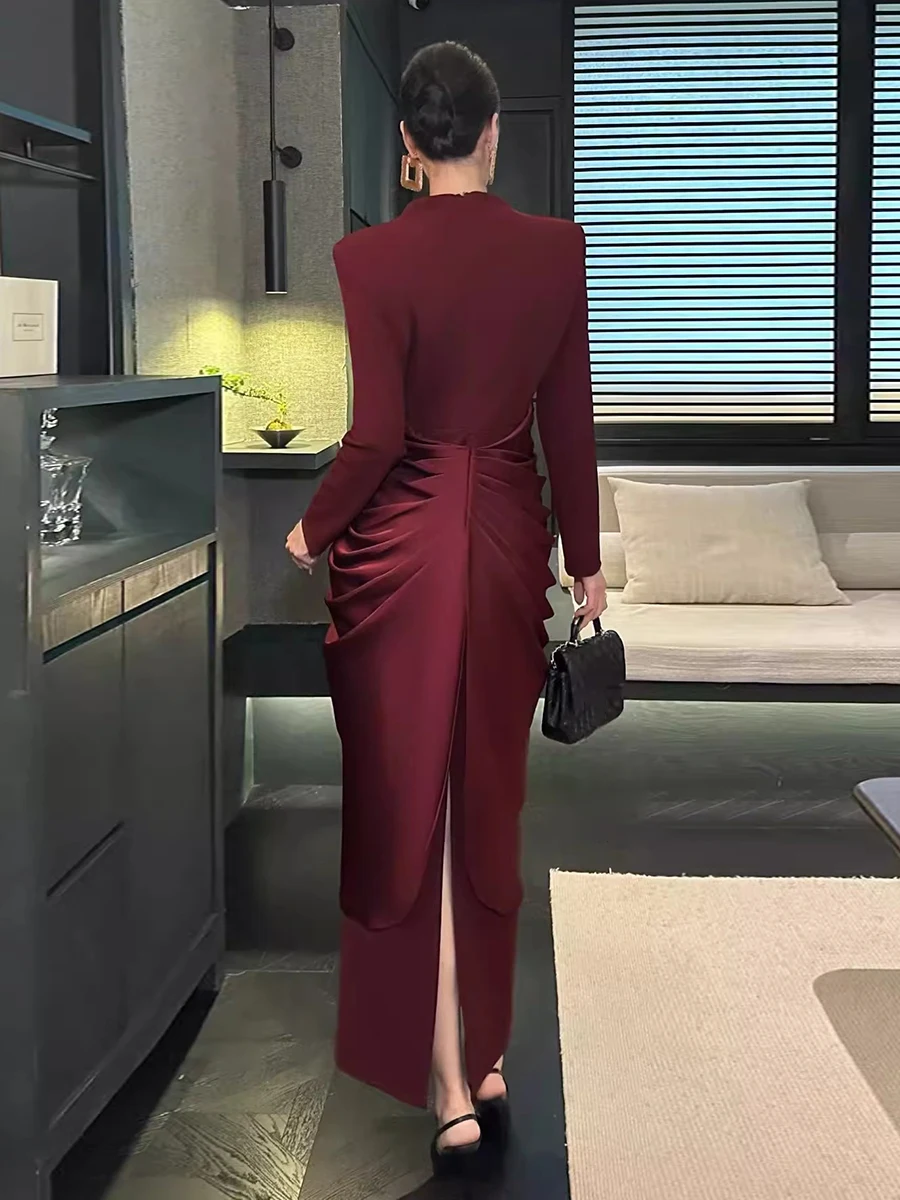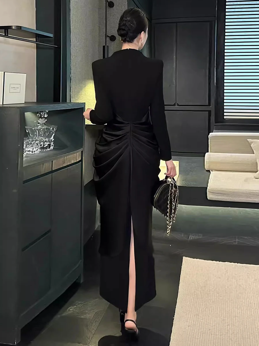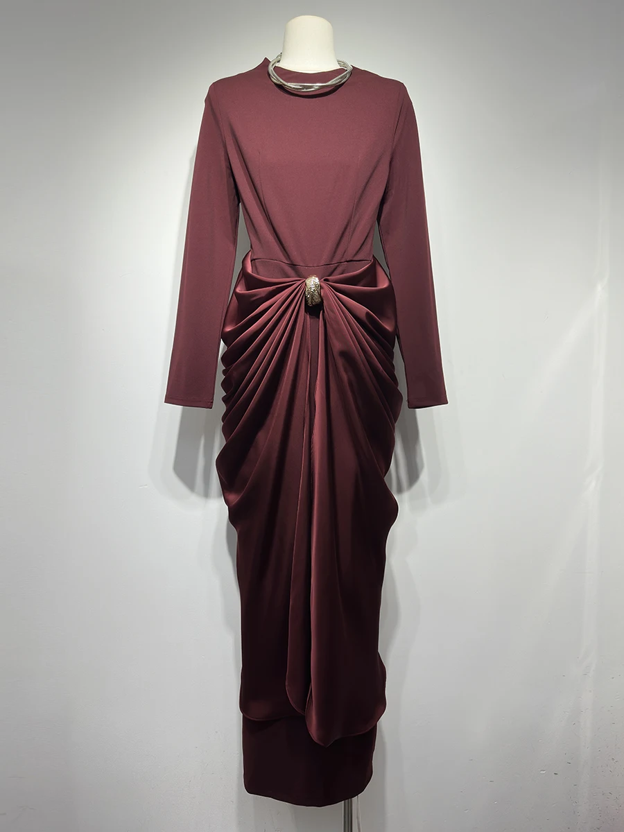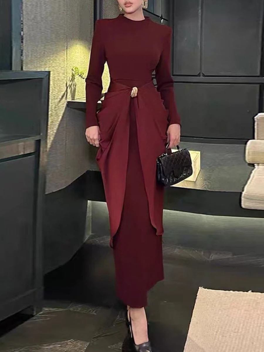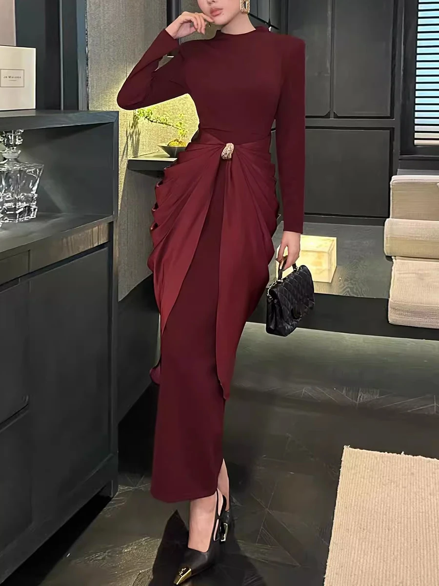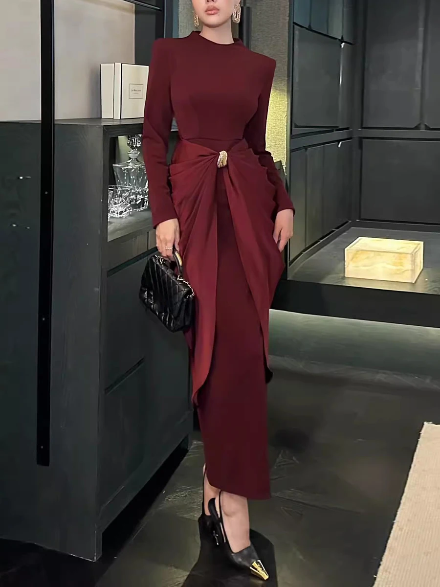 TWOTWINSTYLE Solid Slimming Spliced Folds Elegant Dresses for Women Round Neck Long Sleeves High Waist Dress Female Clothing New