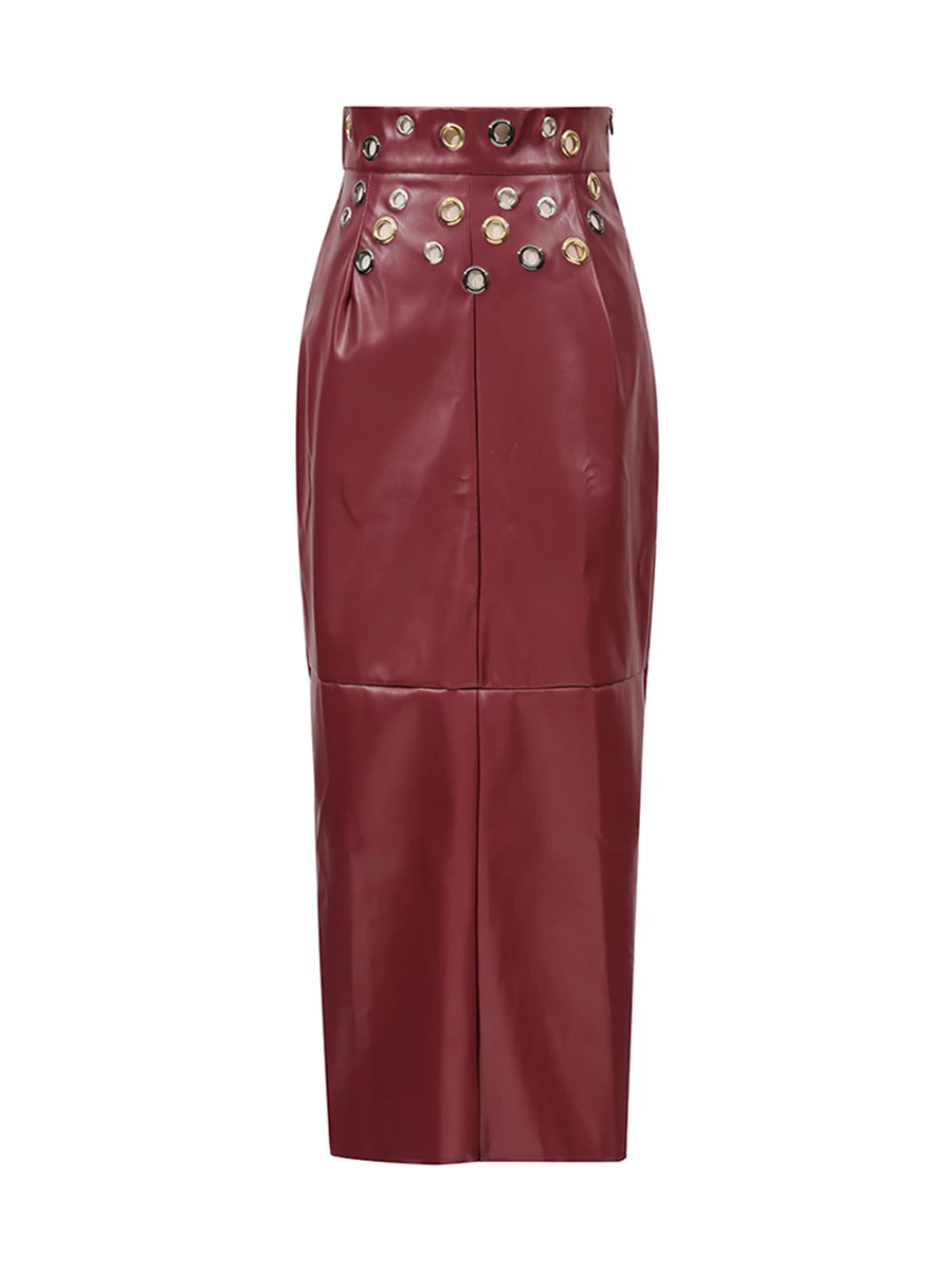 TWOTWINSTYLE Solid Slimming Spliced Metal Ring Elegant Long Skirts for Women High Waist Fashion Leather Skirt Female Clothing