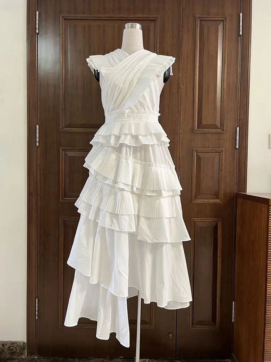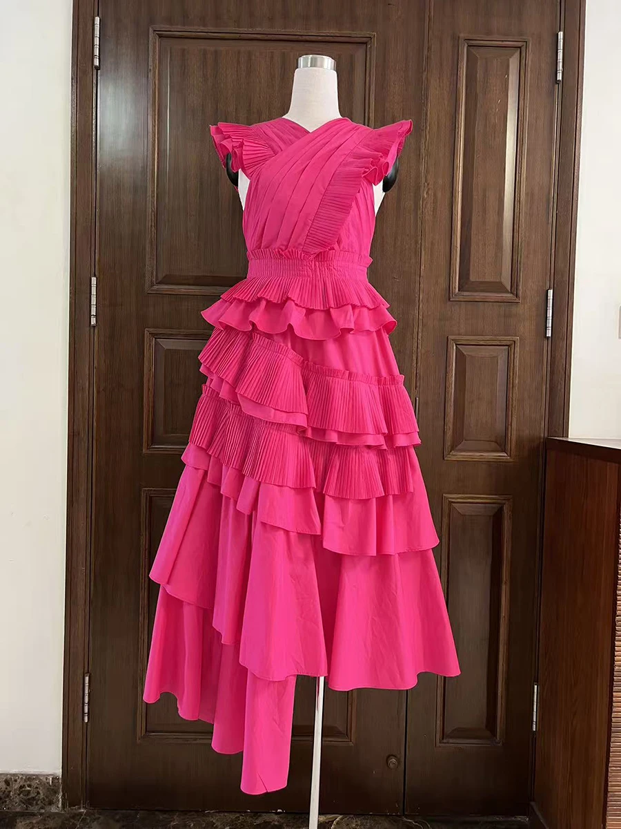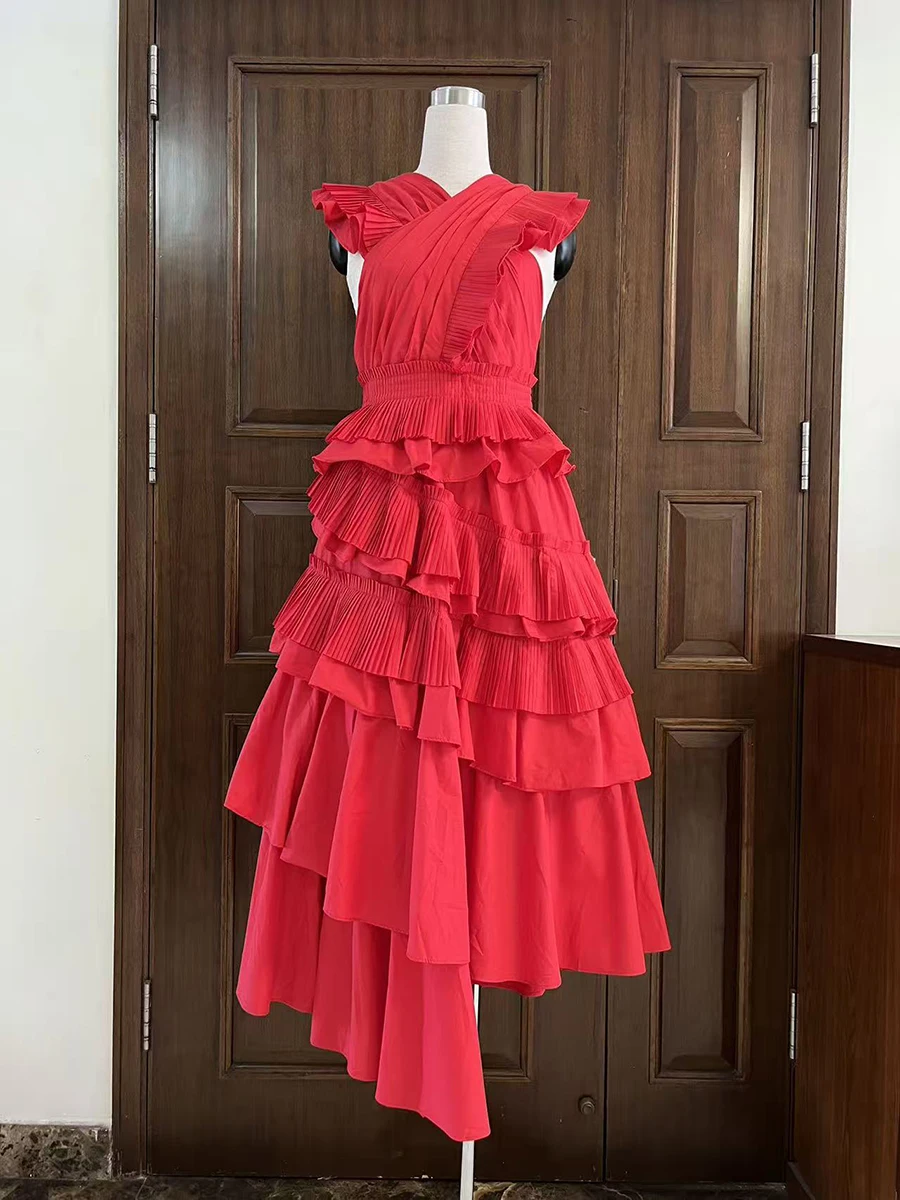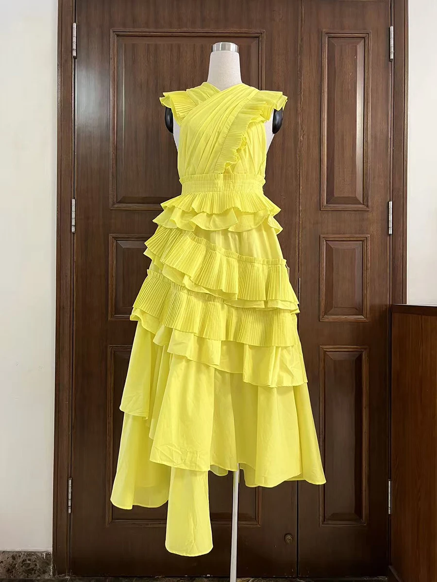 TWOTWINSTYLE Solid Slimming Spliced Ruffles Folds Irregular Dresses for Women V Neck Sleeveless High Waist Fashion Dress Female