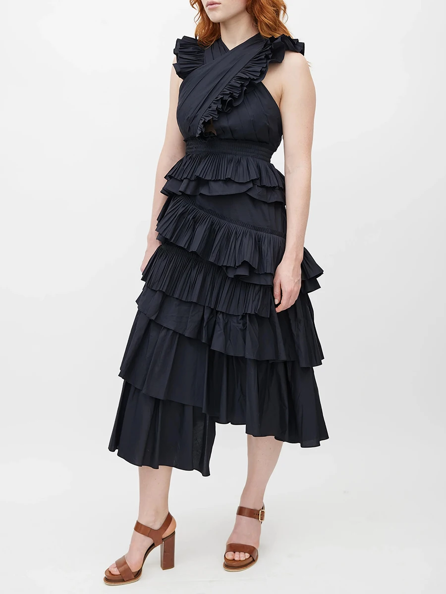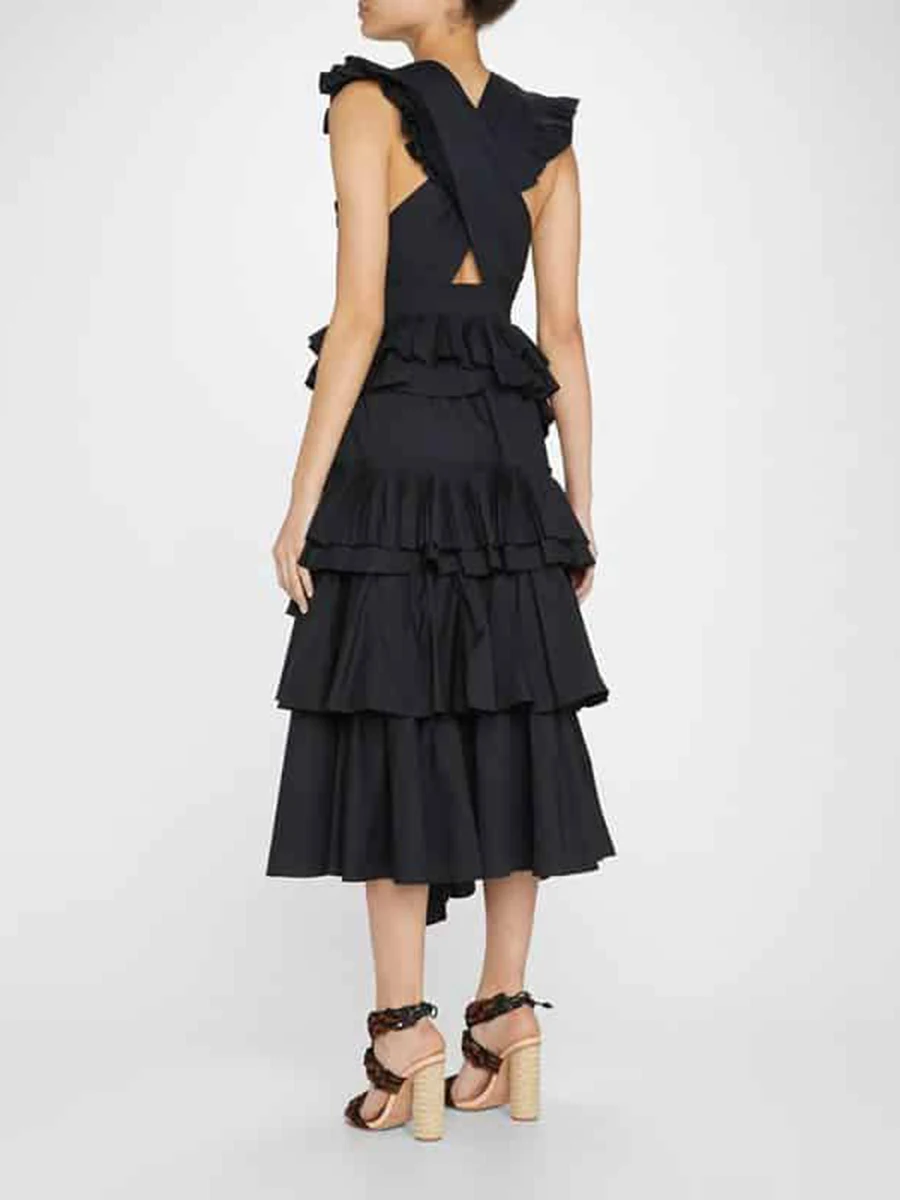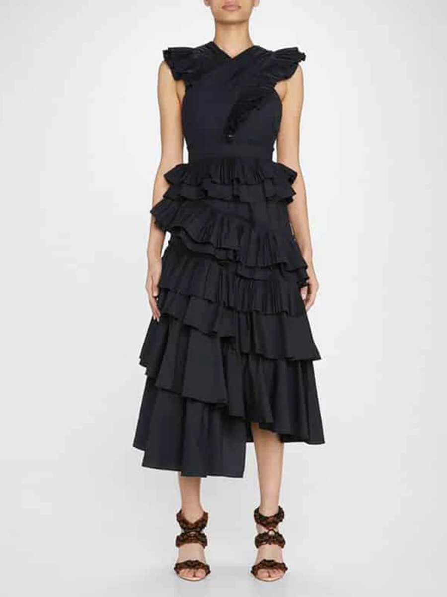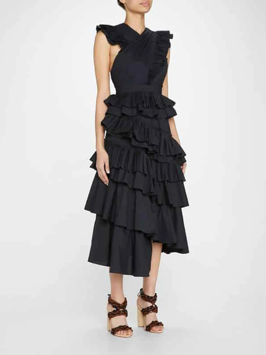 TWOTWINSTYLE Solid Slimming Spliced Ruffles Folds Irregular Dresses for Women V Neck Sleeveless High Waist Fashion Dress Female
