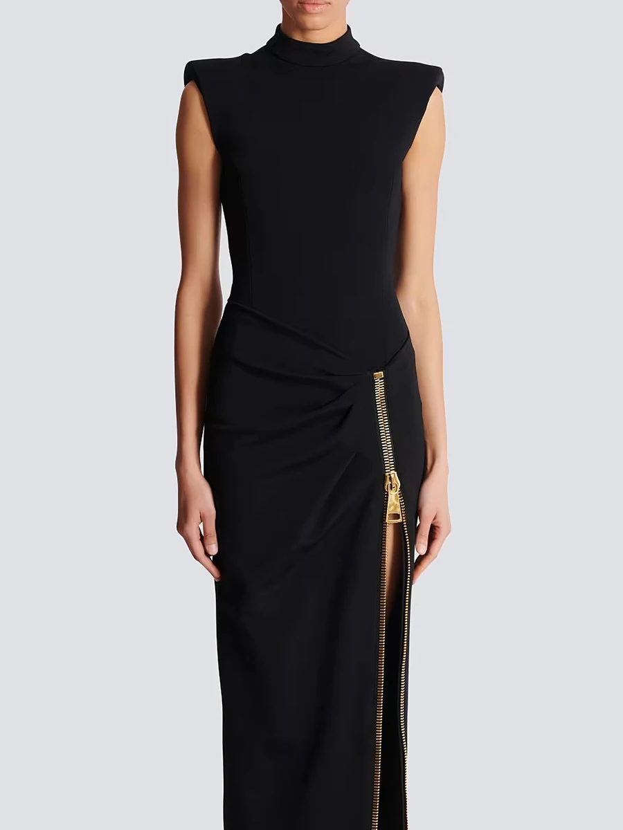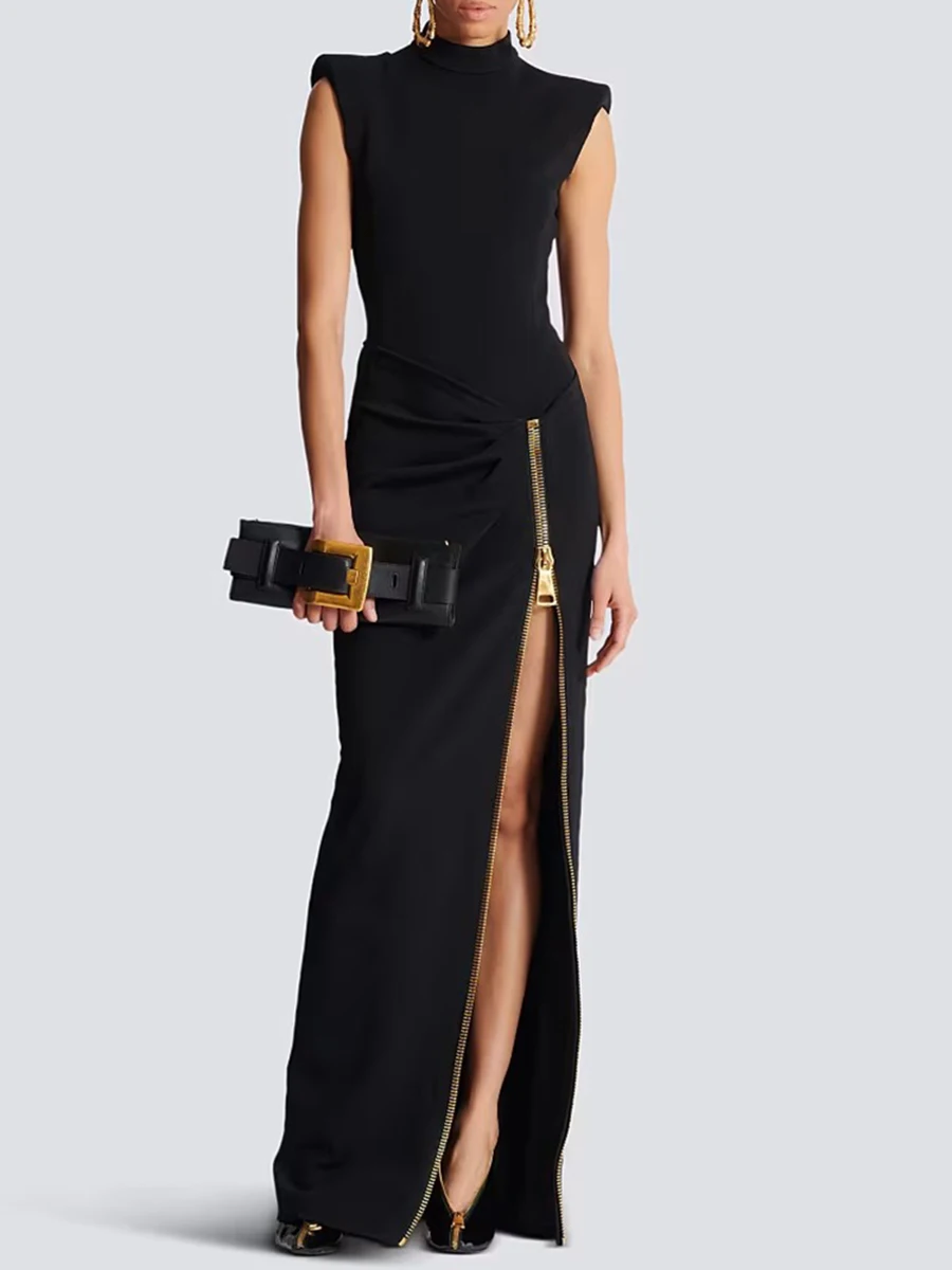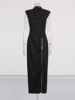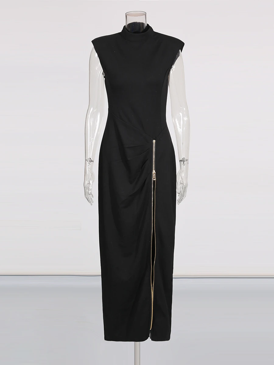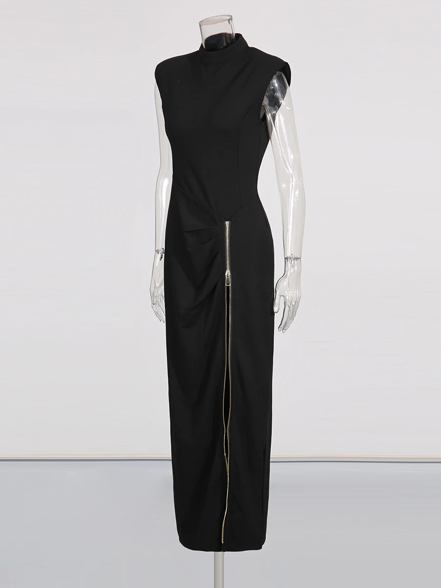 TWOTWINSTYLE Solid Slimming Spliced Zipper Temperament Dresses for Women Stand Neck Sleeveless Patchwork Folds Dress Female New