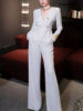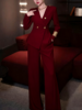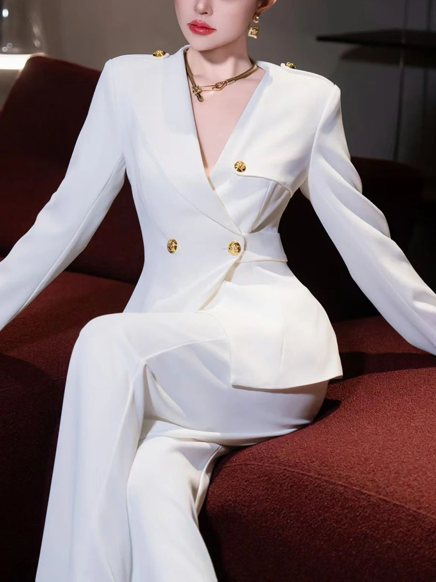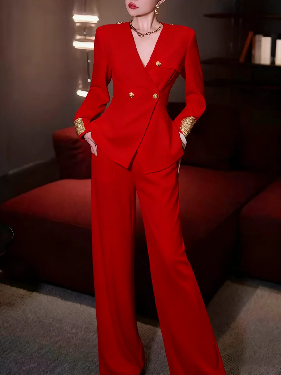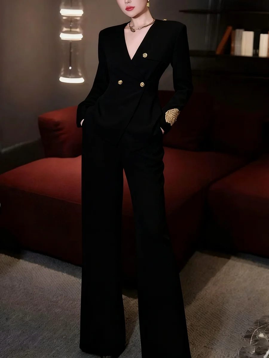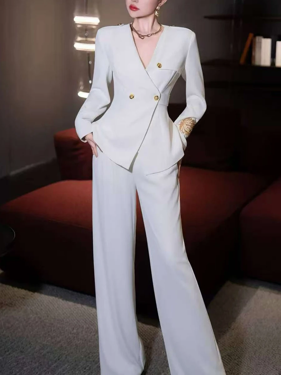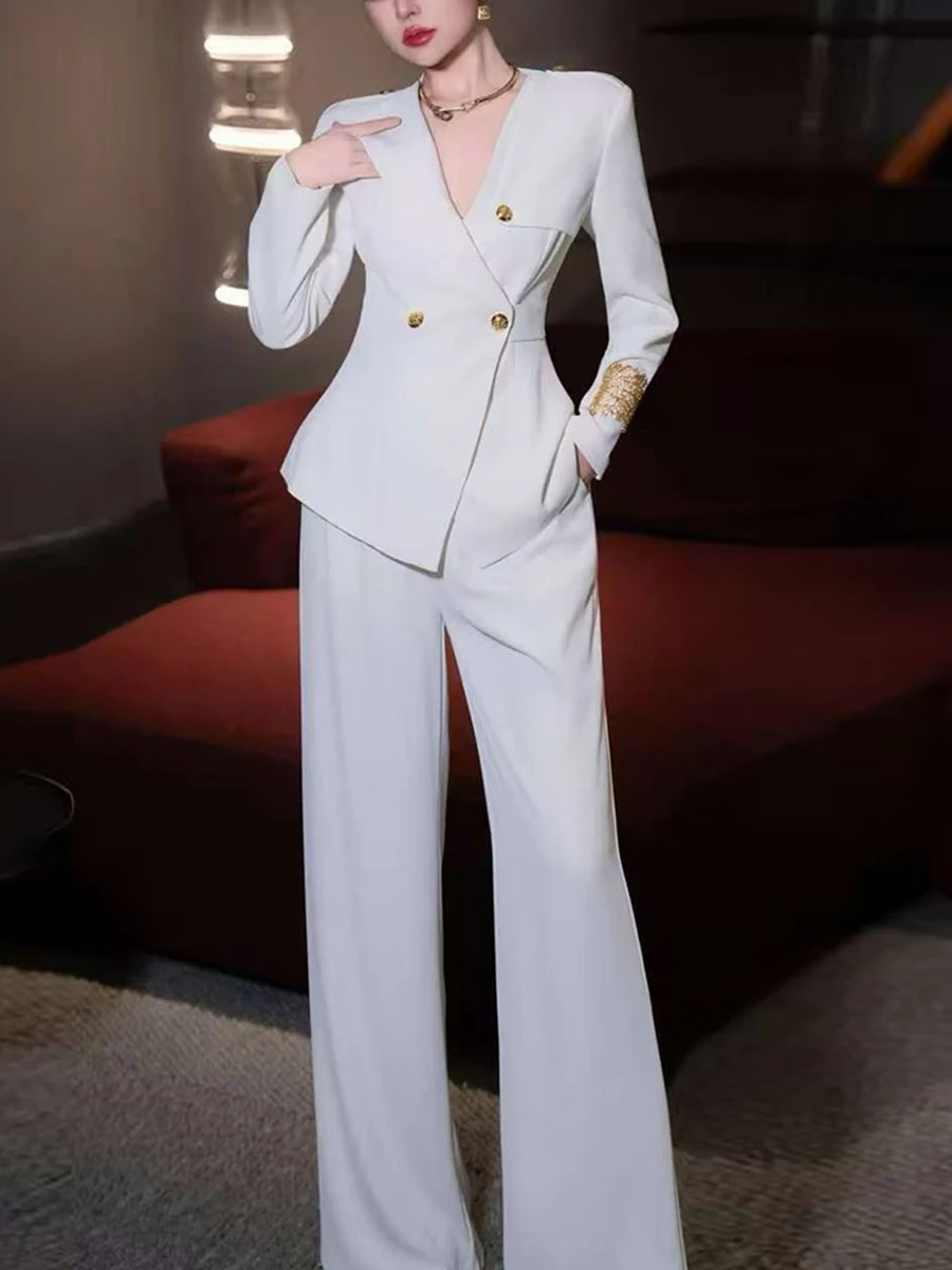 TWOTWINSTYLE Solid Slimming Two Piece Sets for Women V Neck Long Sleeves Spliced Buttons Top High Waist Pant Elegant Set Female