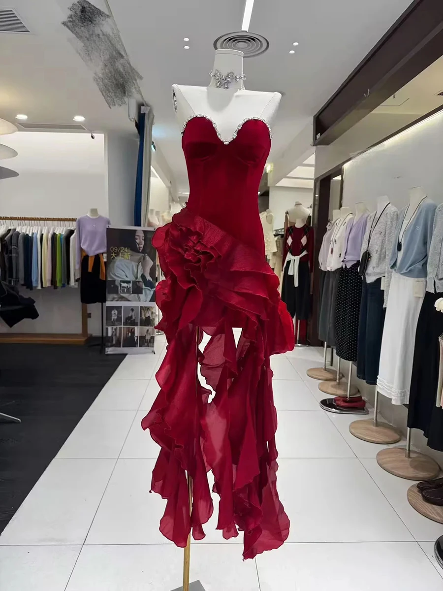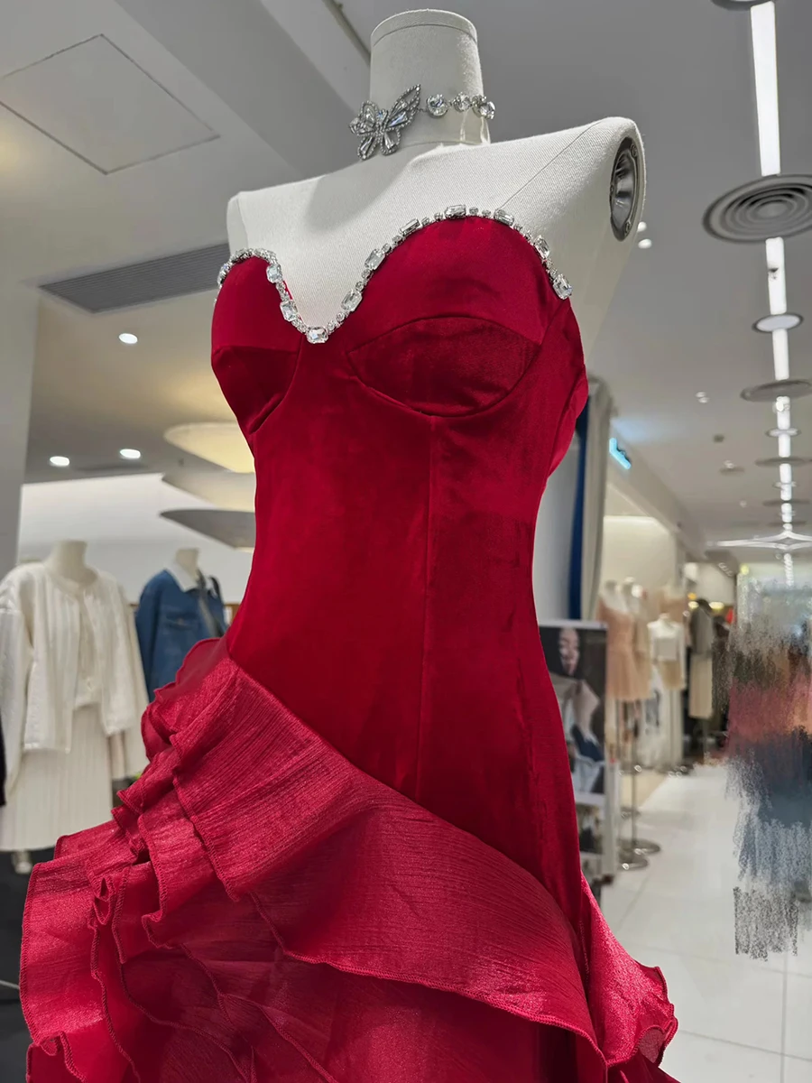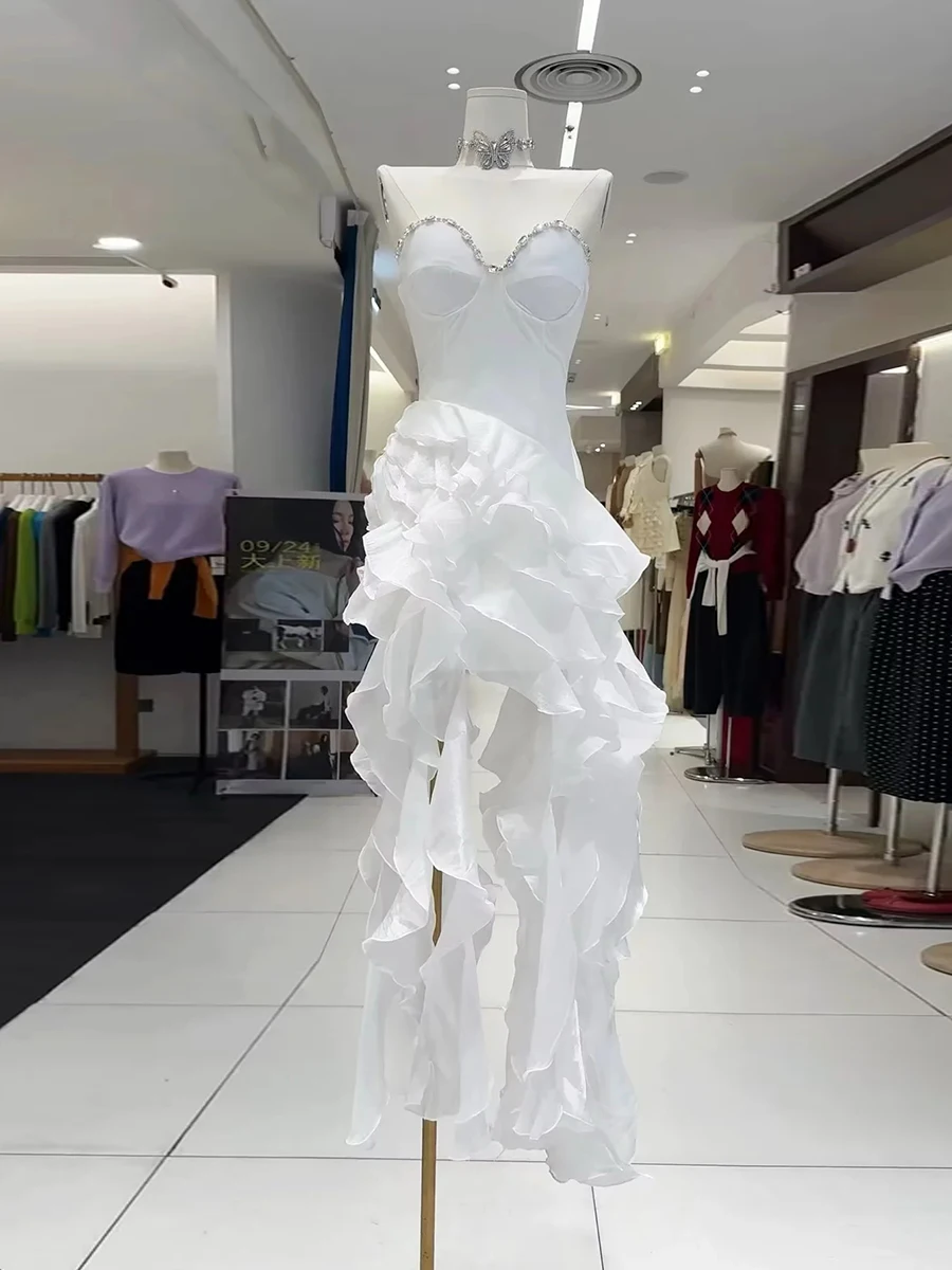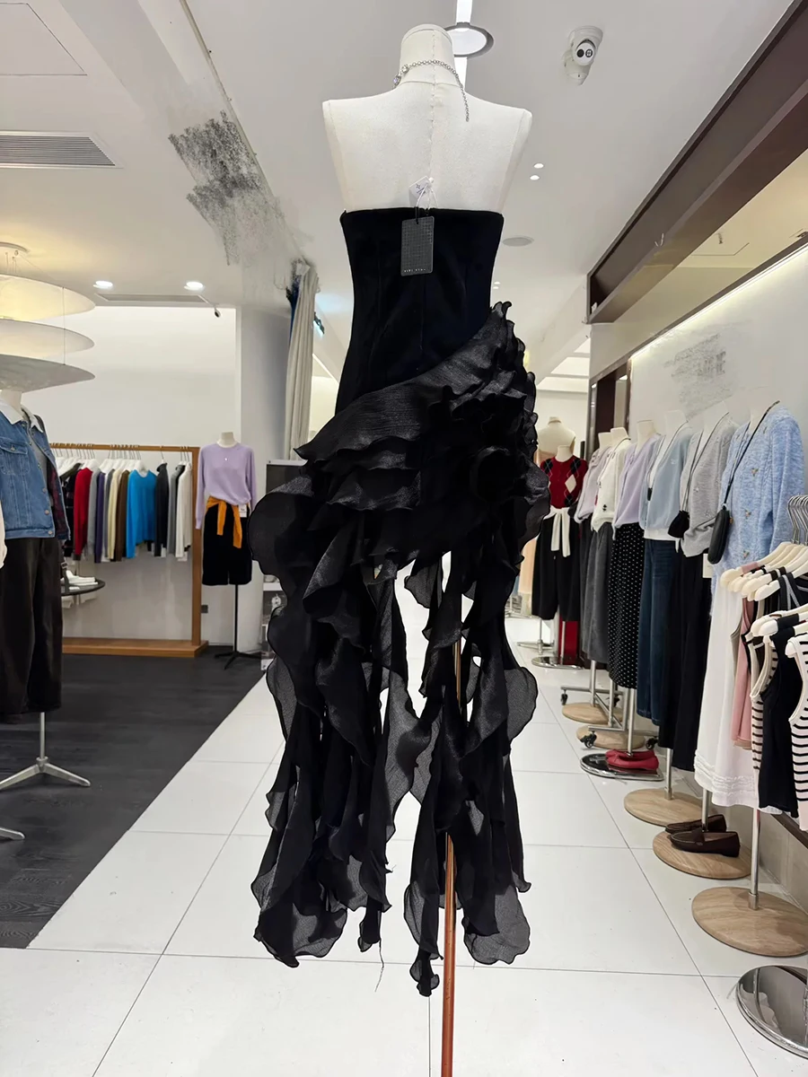 TWOTWINSTYLE Solid Slimmingspliced Ruffles Folds Irregular Dresses for Women Strapless Sleeveless Patchwork Ribbon Dress Female