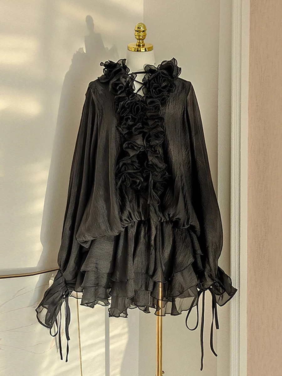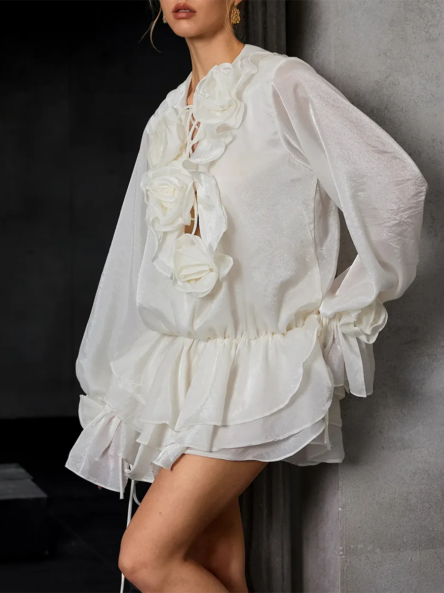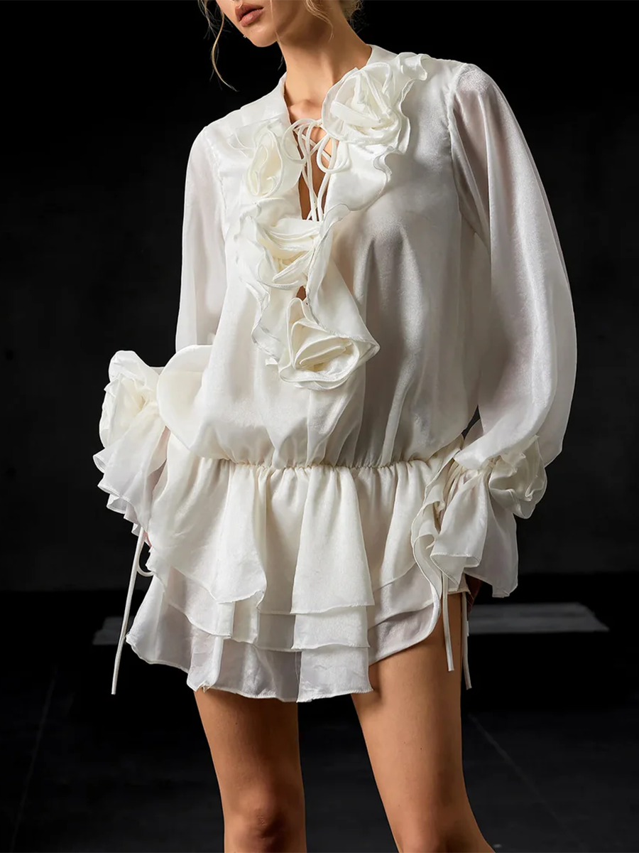 TWOTWINSTYLE Solid Spliced 3D Flower Elegant Dresses for Women V Neck Long Sleeves Patchwork Ruffles Folds Mini Dress Female New