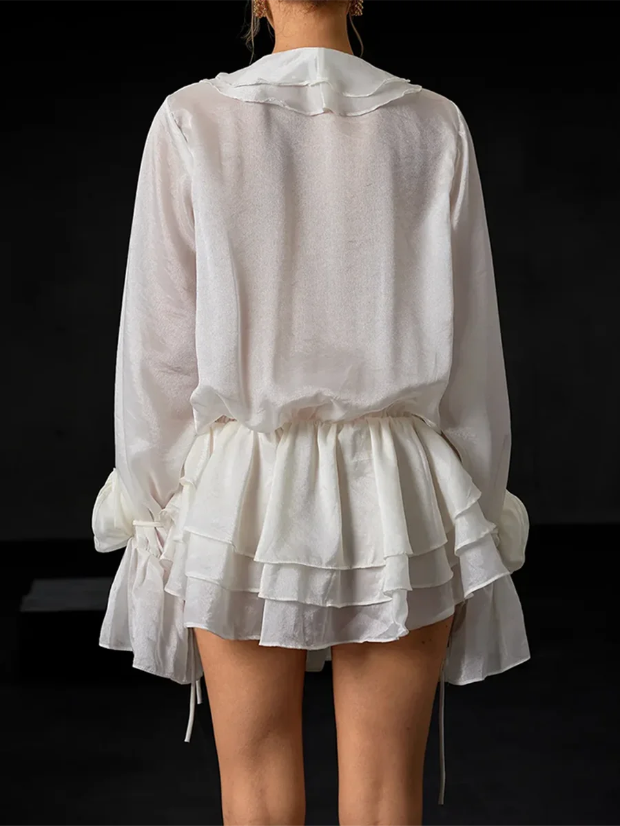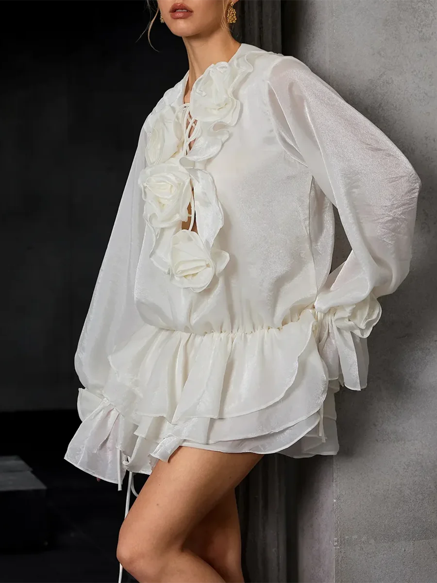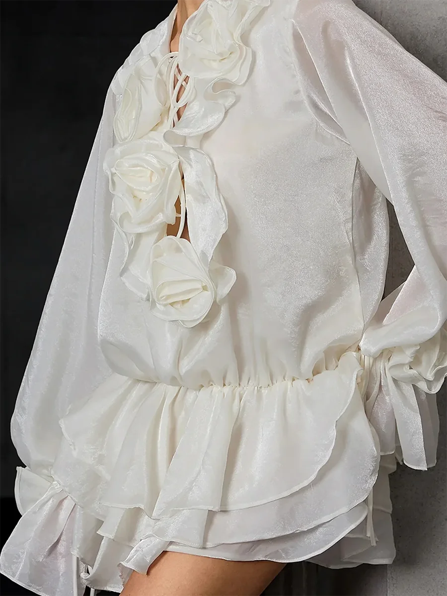 TWOTWINSTYLE Solid Spliced 3D Flower Elegant Dresses for Women V Neck Long Sleeves Patchwork Ruffles Folds Mini Dress Female New