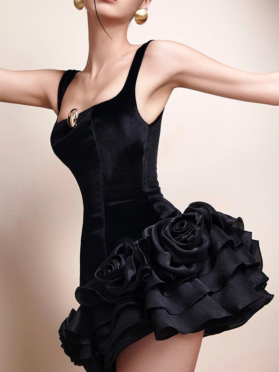 TWOTWINSTYLE Solid Spliced 3D Flower Temperament Dresses for Women Square Neck Sleeveless Patchwork Ruffles Folds Dress Female