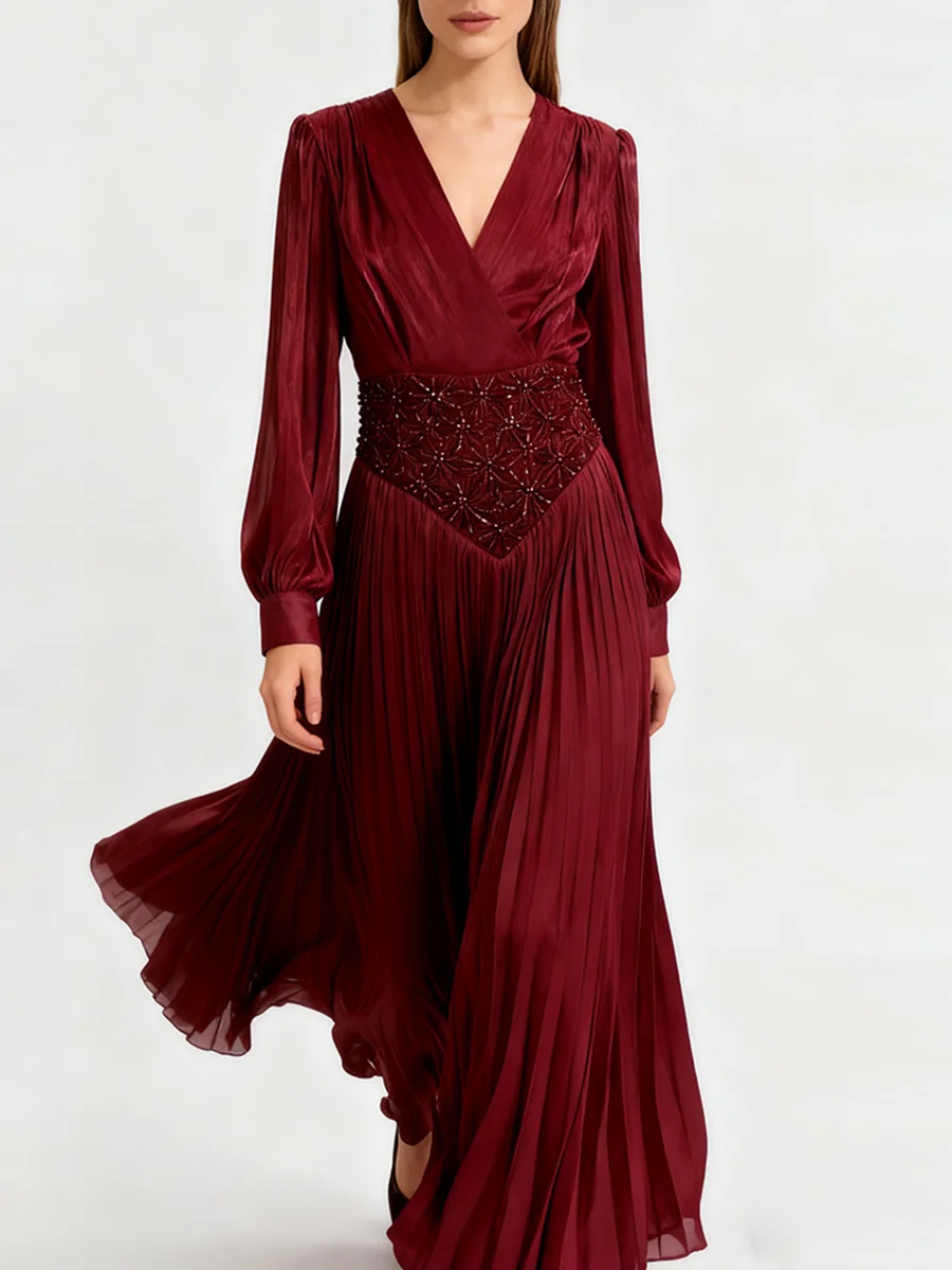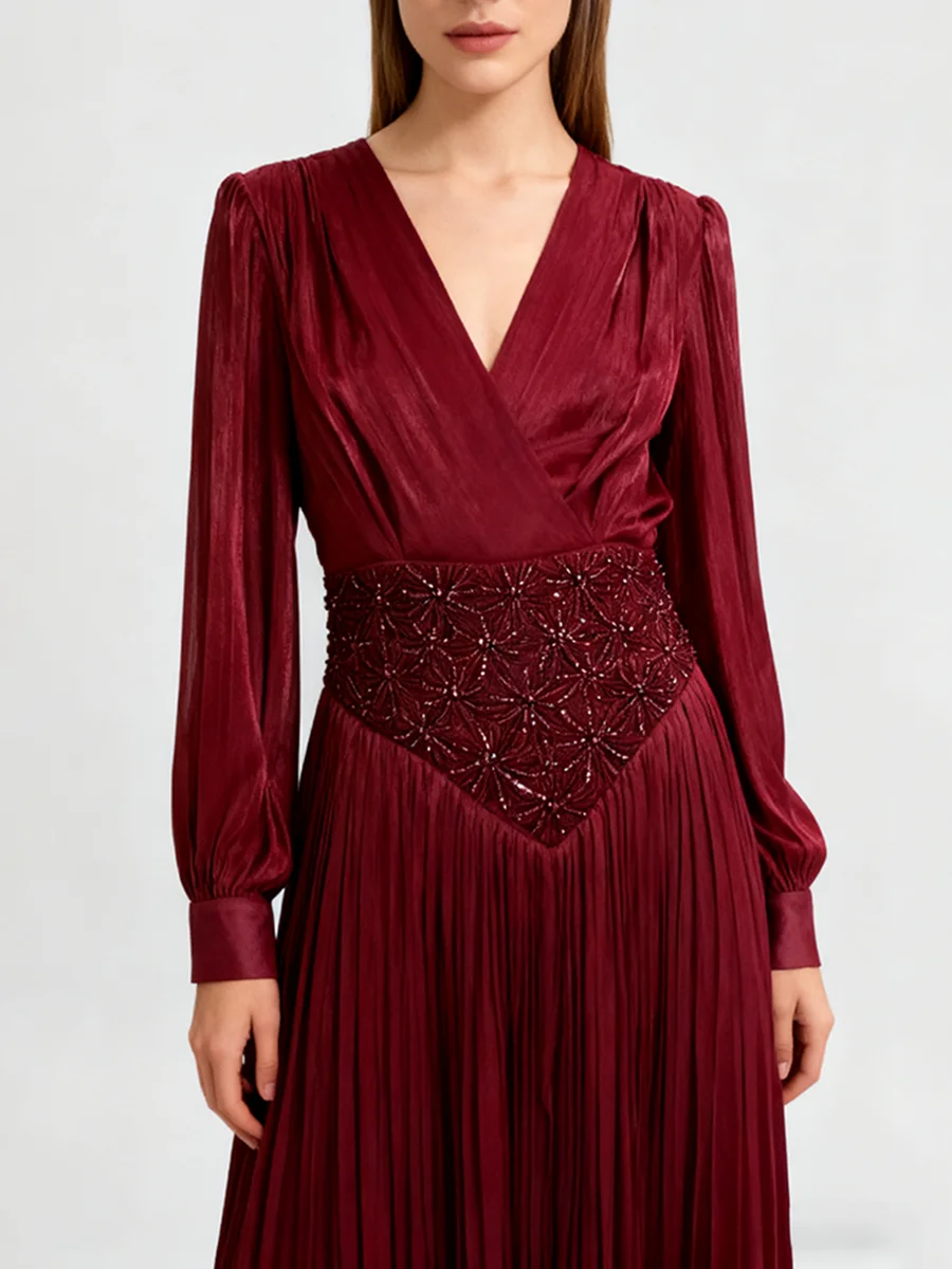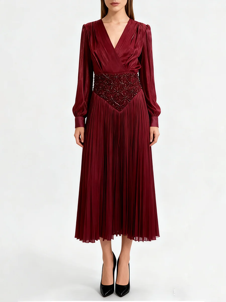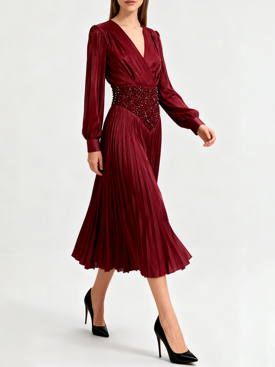 TWOTWINSTYLE Solid Spliced Bead Casual Dresses for Women V Neck Long Sleeves Tunic Patchwork Folds Dress Female Fashion Clothing