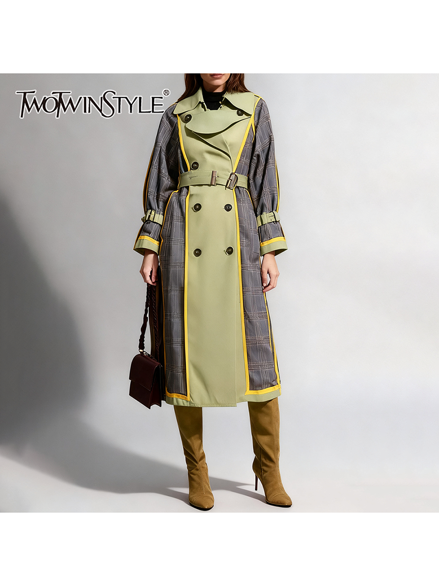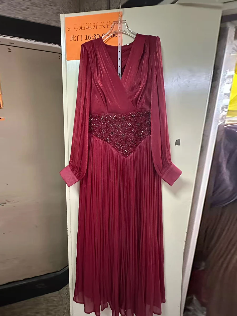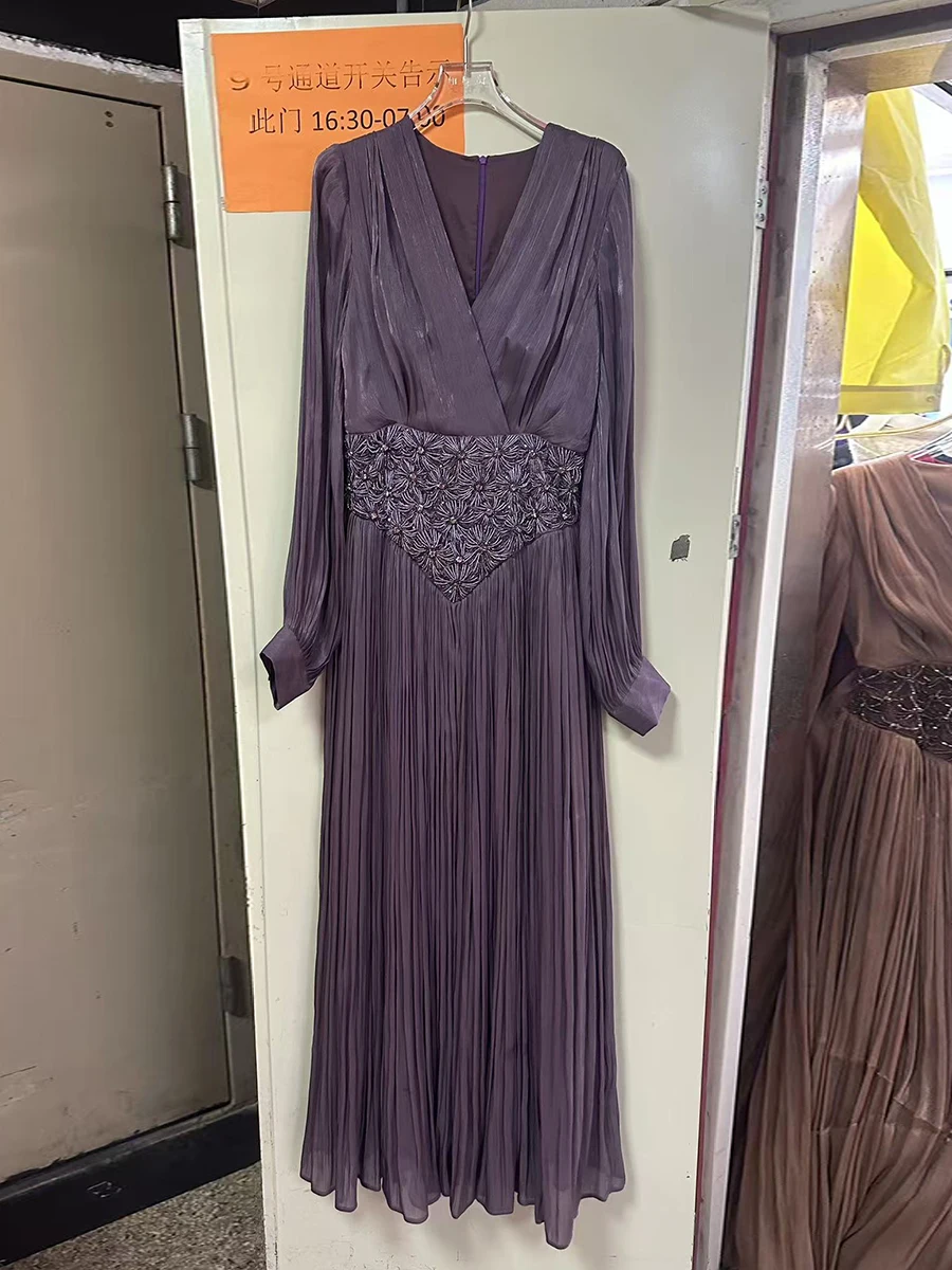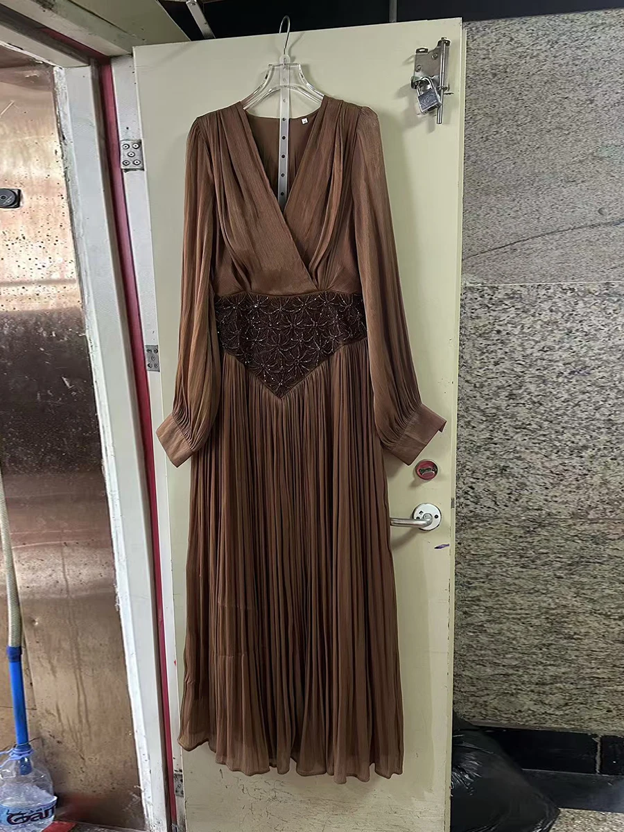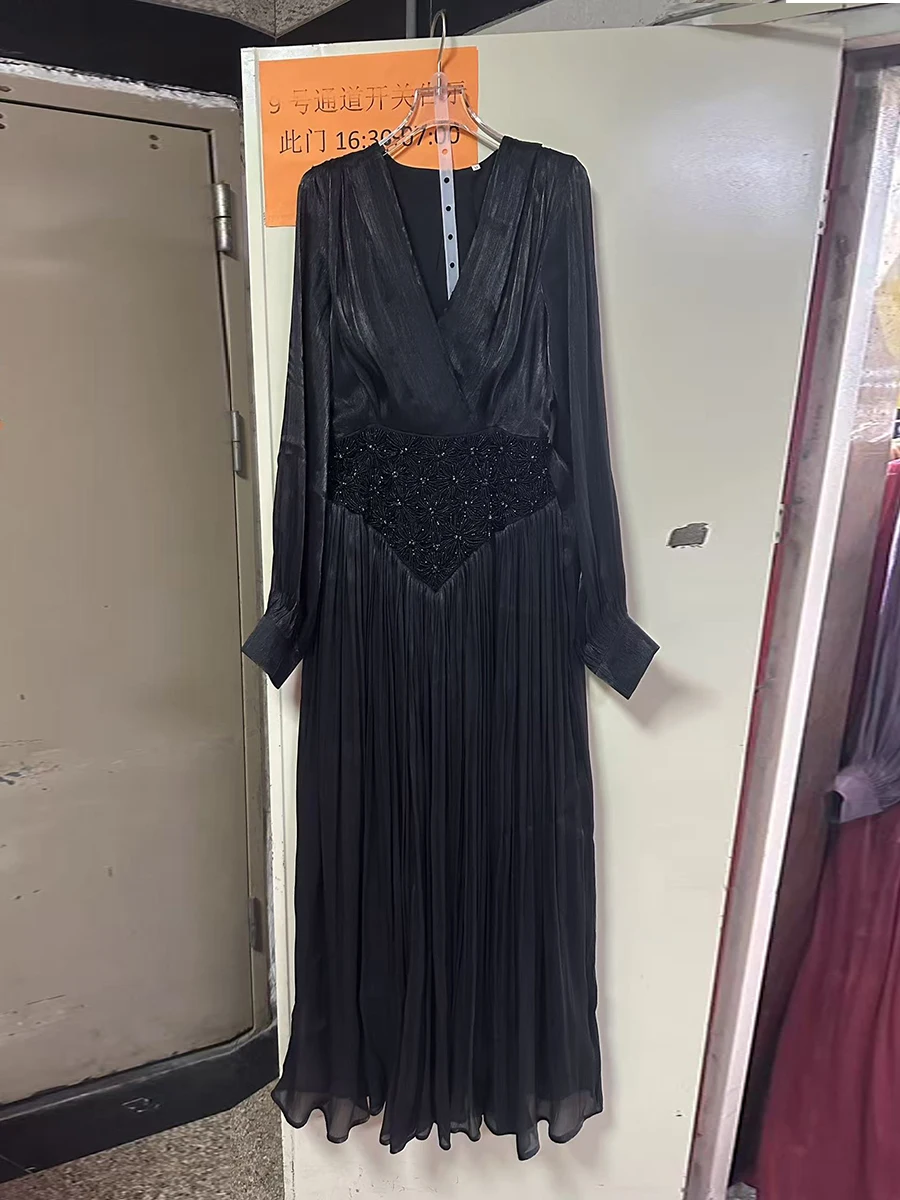 TWOTWINSTYLE Solid Spliced Bead Casual Dresses for Women V Neck Long Sleeves Tunic Patchwork Folds Dress Female Fashion Clothing