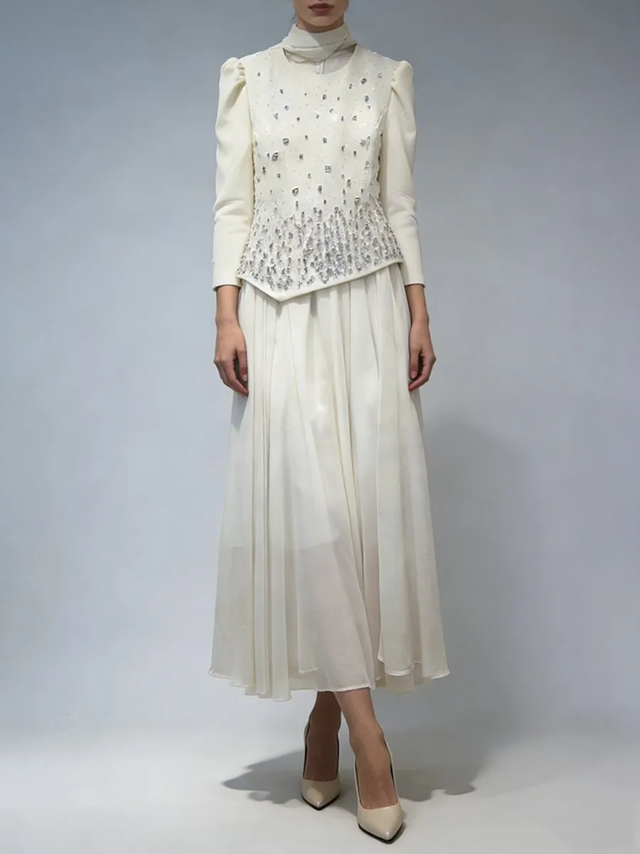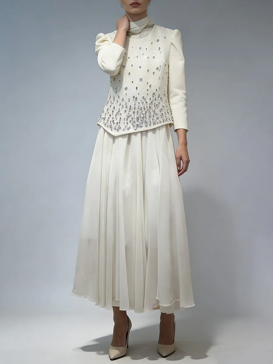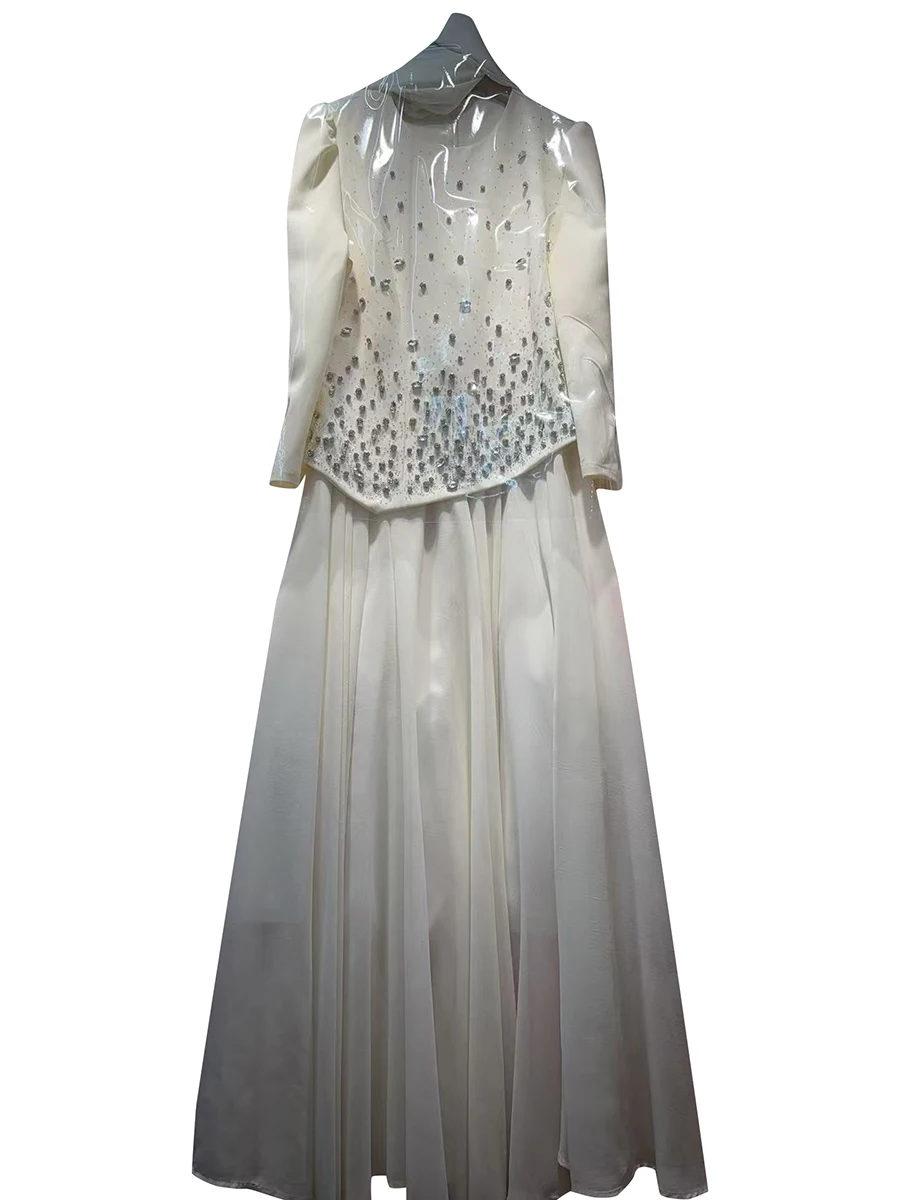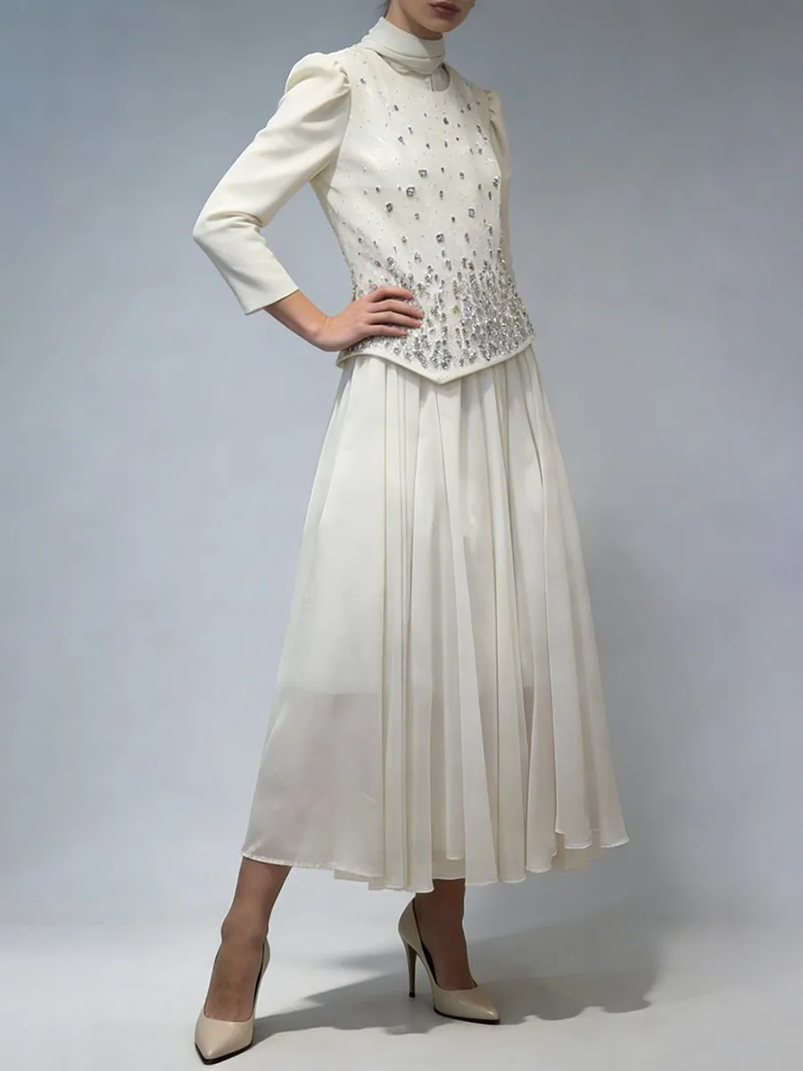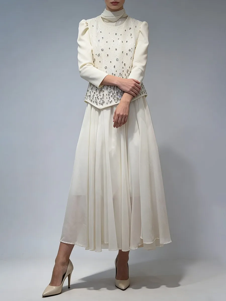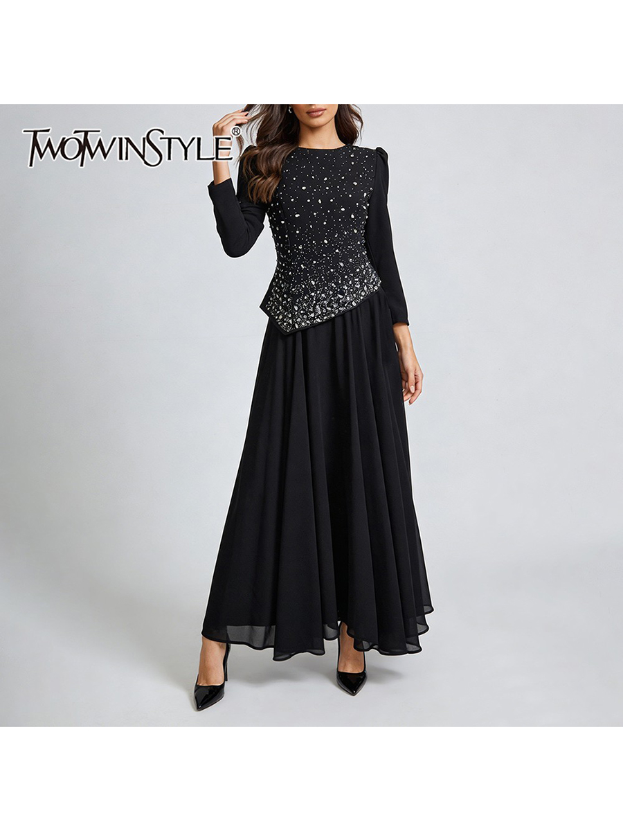 TWOTWINSTYLE Solid Spliced Diamonds Temperament Dress for Women Round Neck Long Sleeves Tunic Patchwork Folds Dresses Female New
