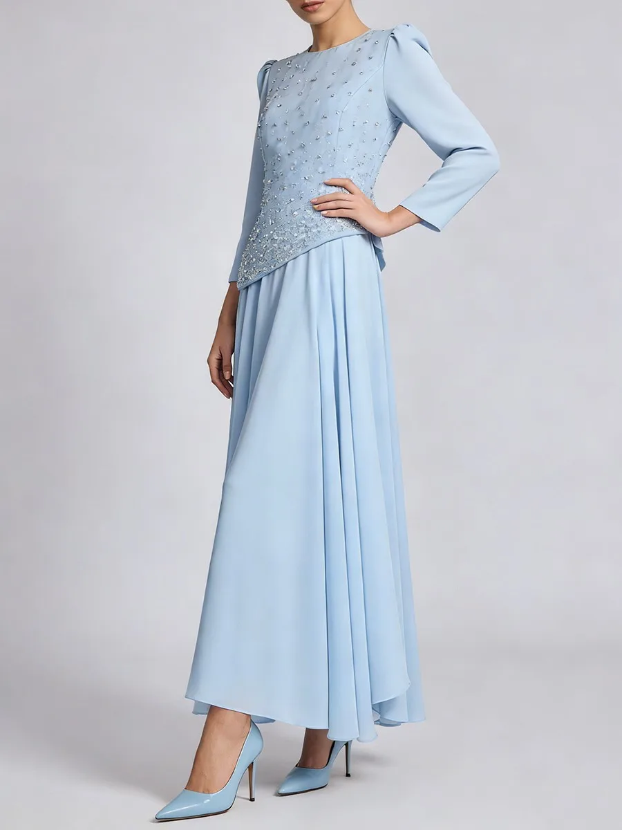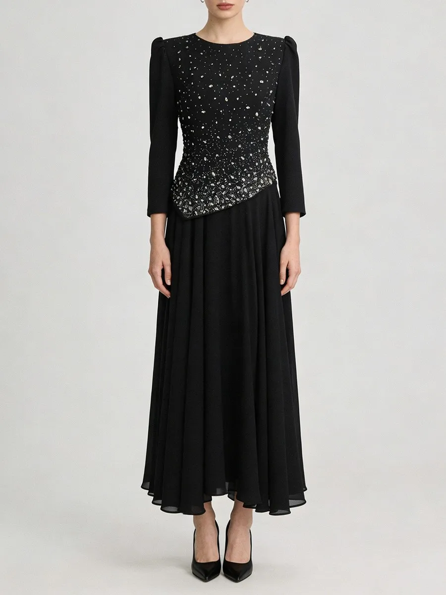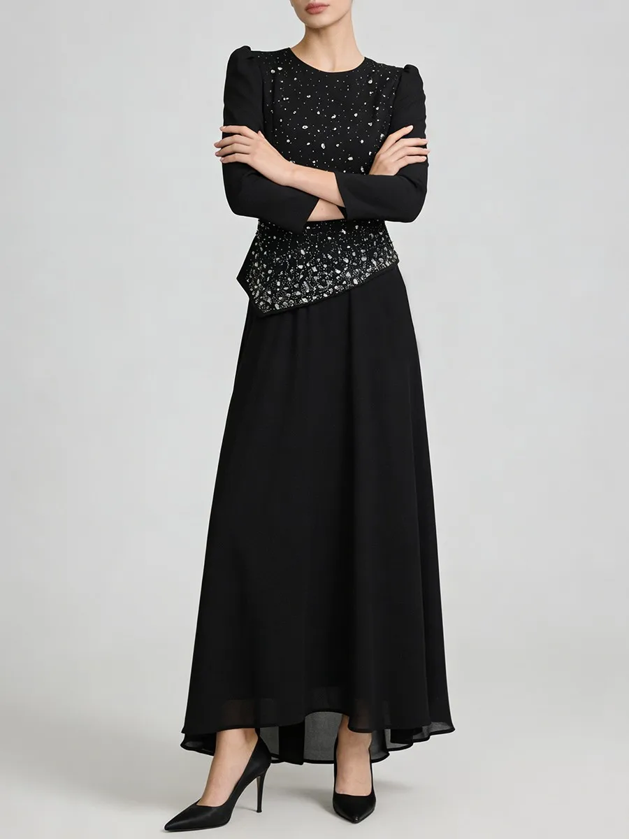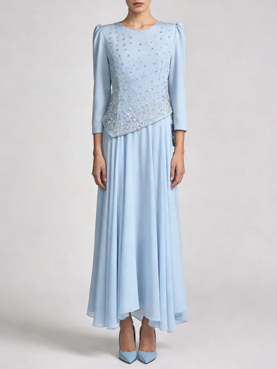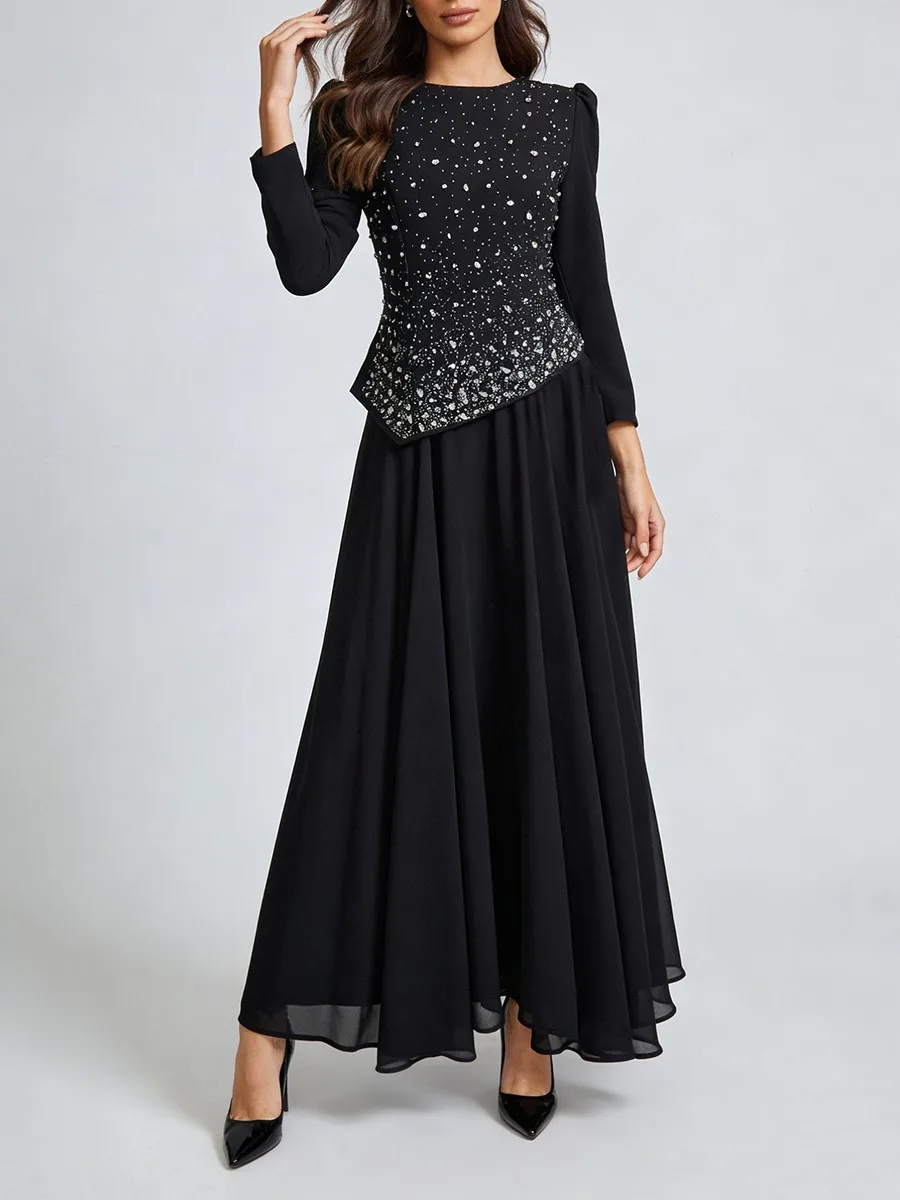 TWOTWINSTYLE Solid Spliced Diamonds Temperament Dress for Women Round Neck Long Sleeves Tunic Patchwork Folds Dresses Female New