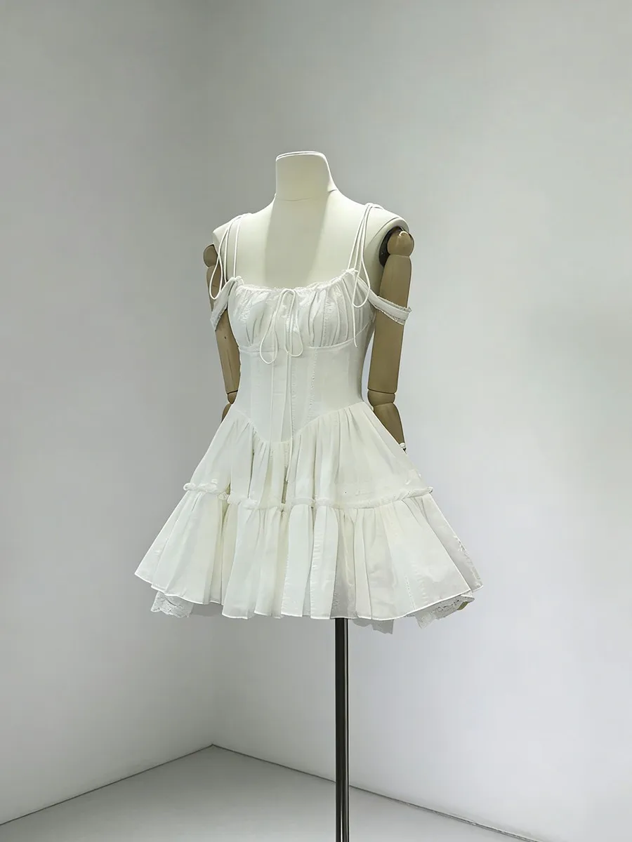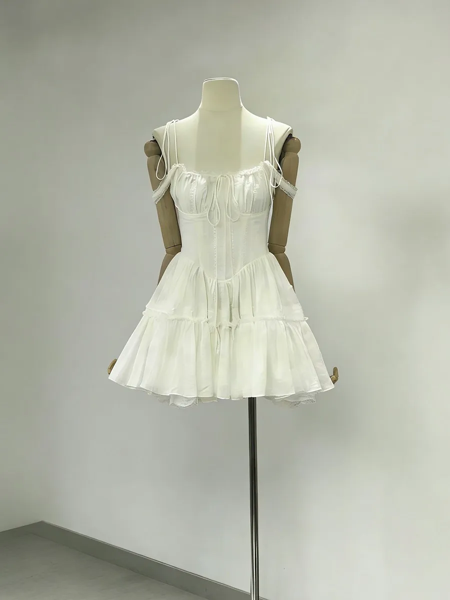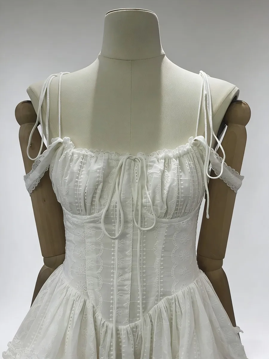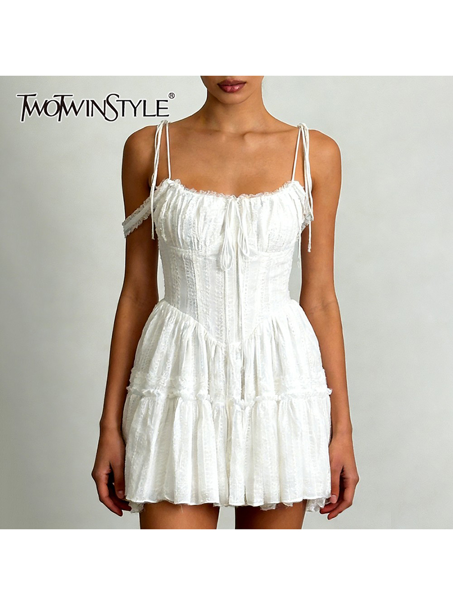 TWOTWINSTYLE Solid Spliced Embroidery Sweet Dresses for Women Square Neck Sleeveless High Waist Patchwork Strap Dress Female New