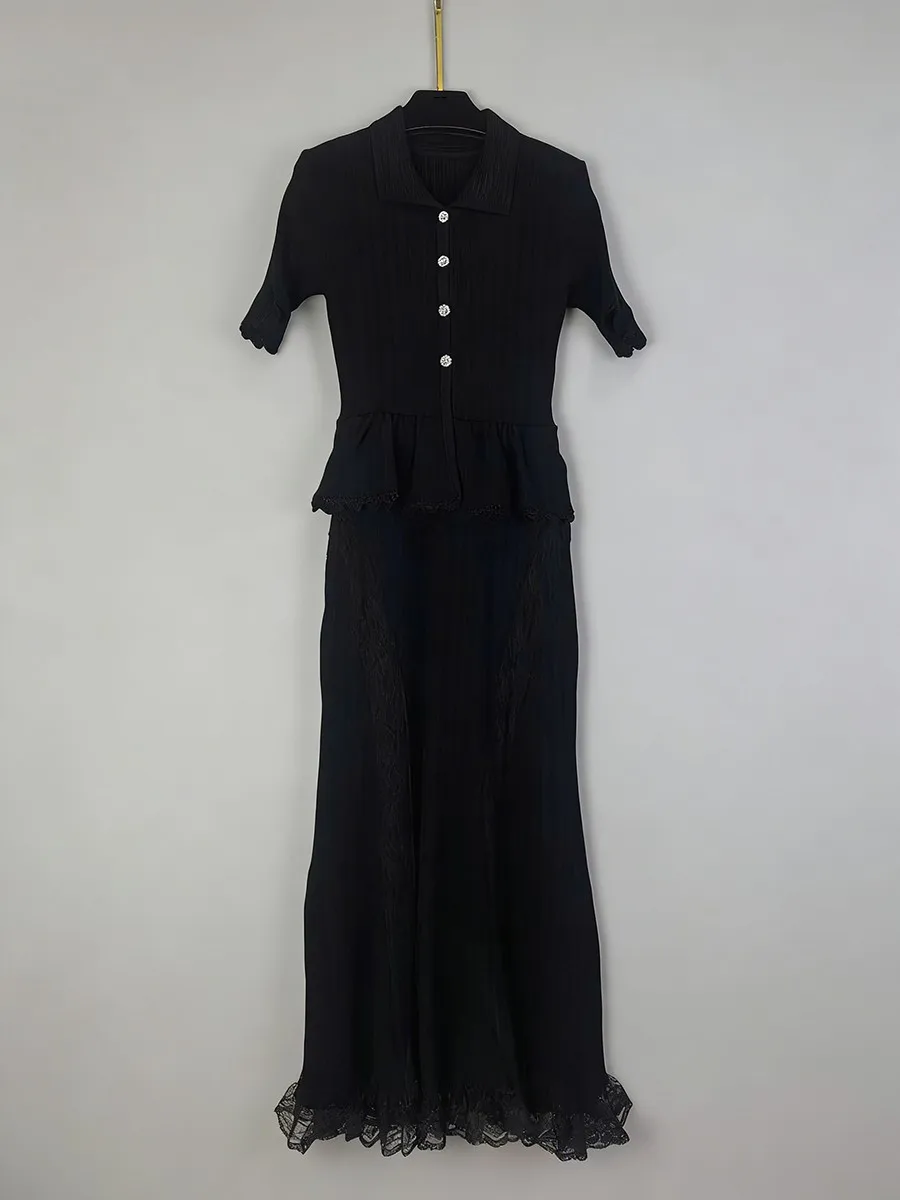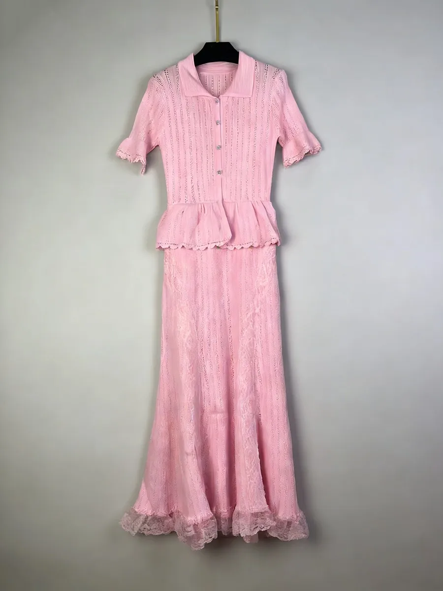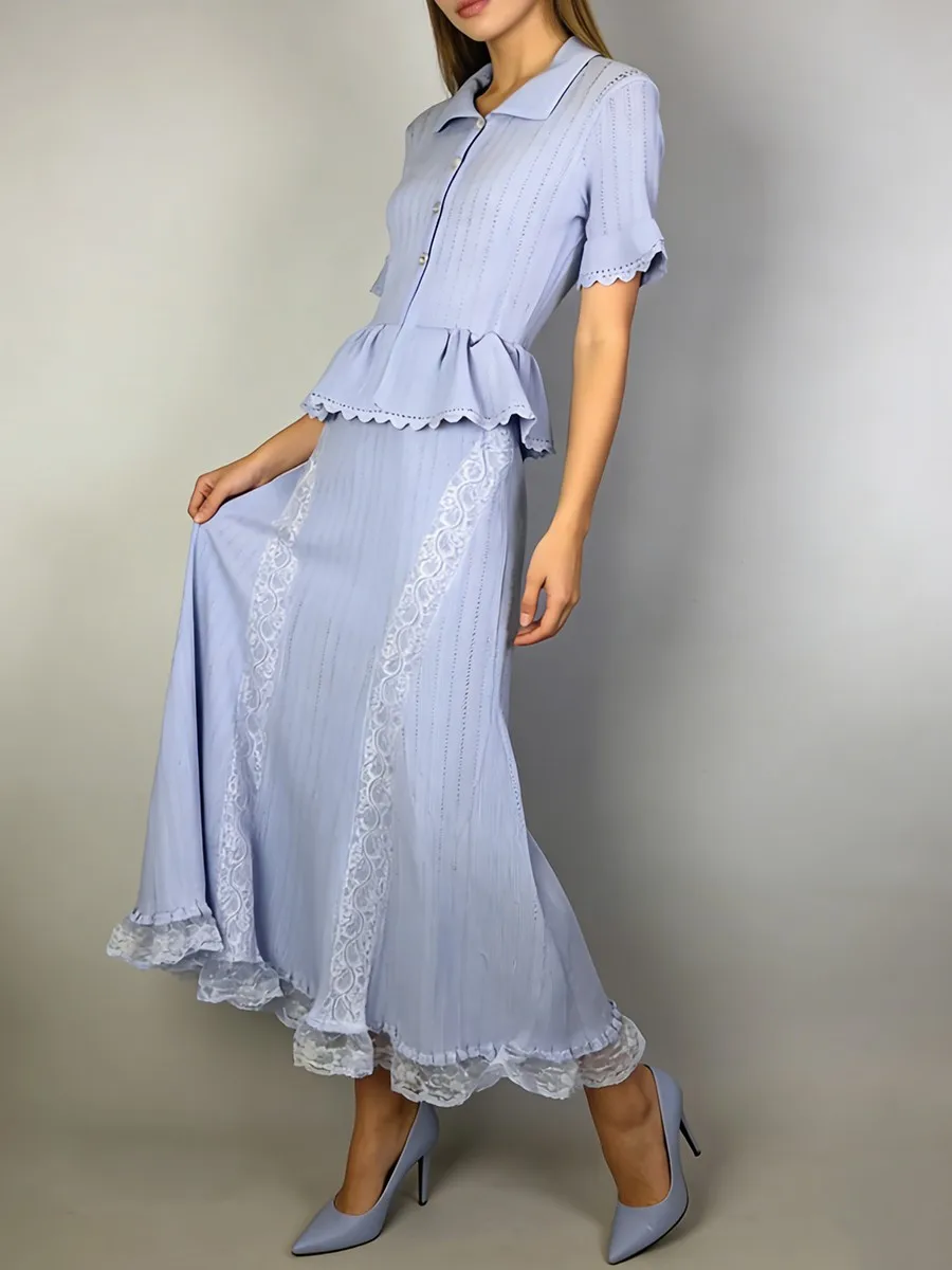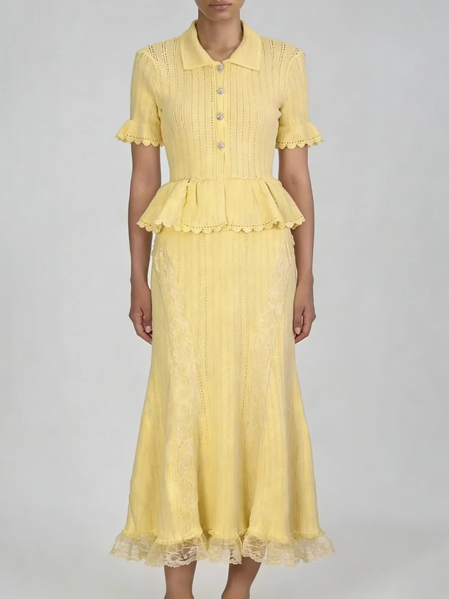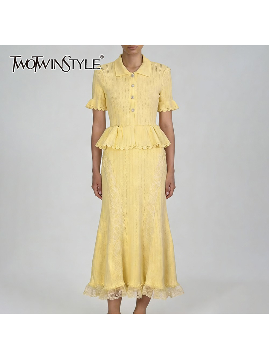 TWOTWINSTYLE Solid Spliced Lace Elegant Long Dresses for Women Lapel Short Sleeves Patchwork Ruffles Basics Dress Female Clothes