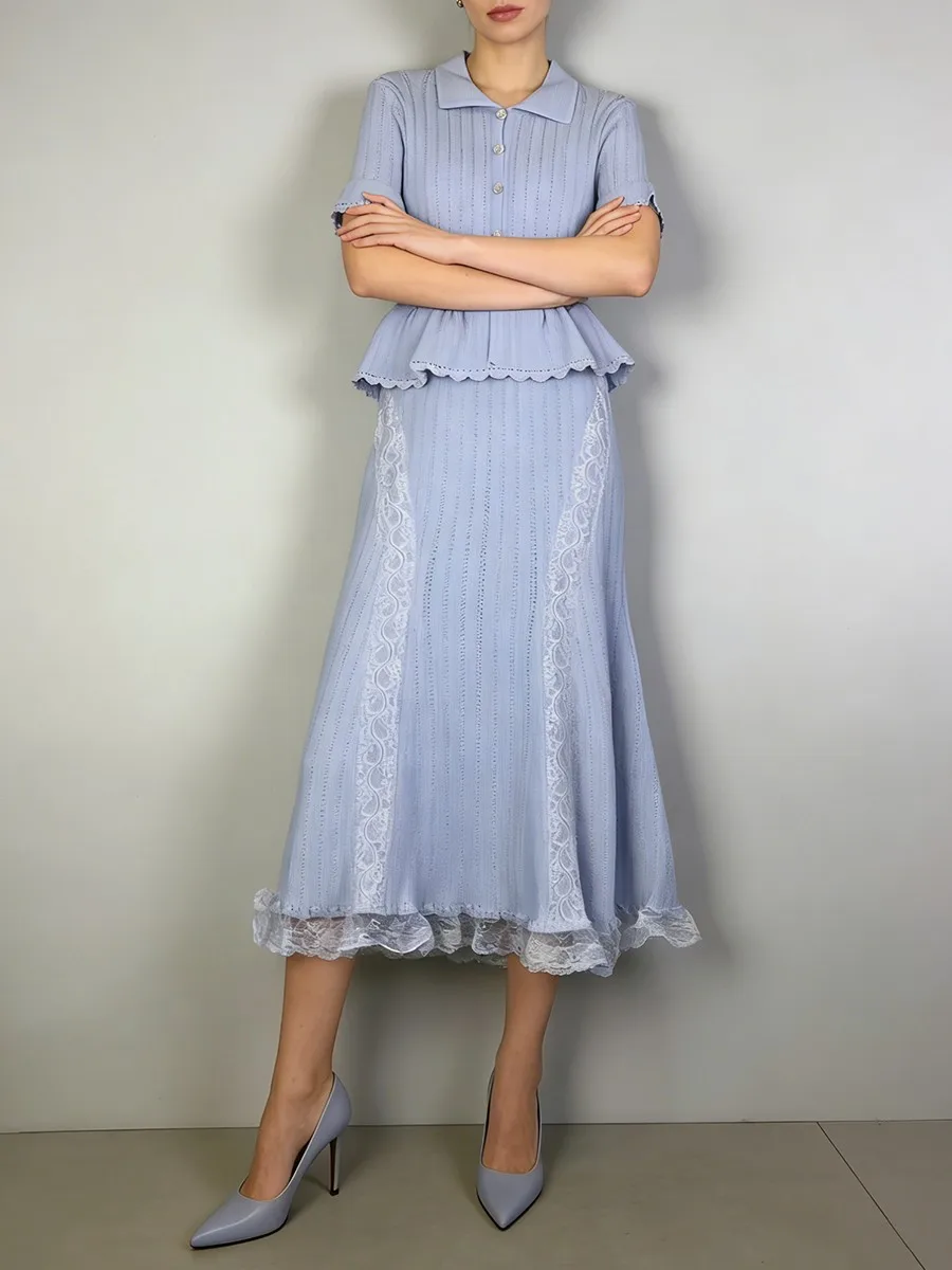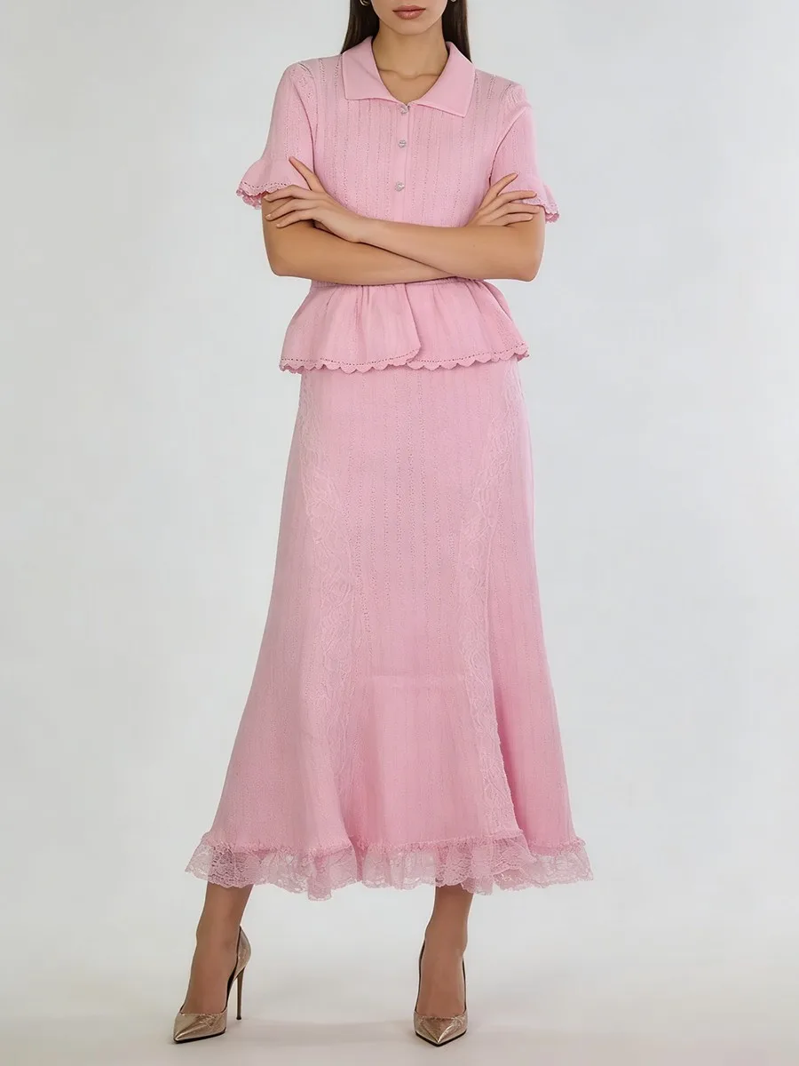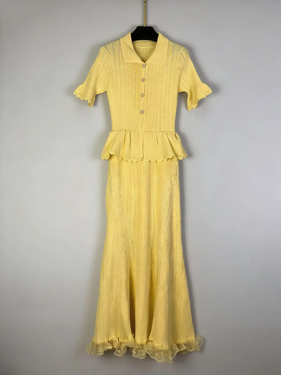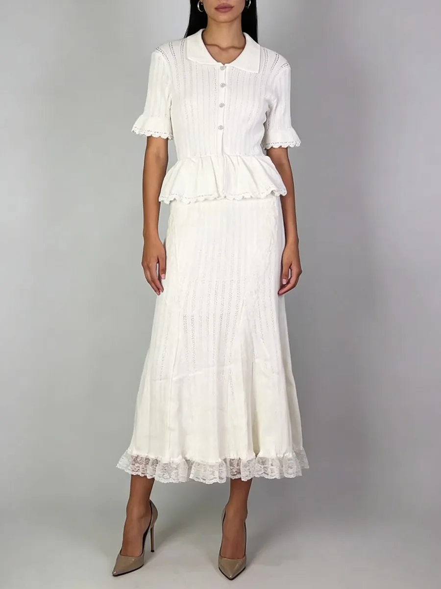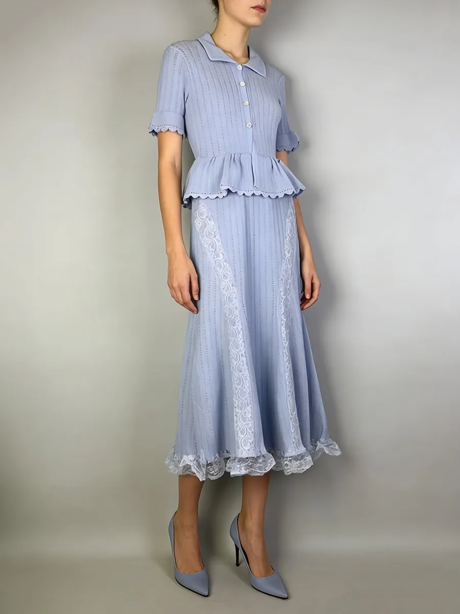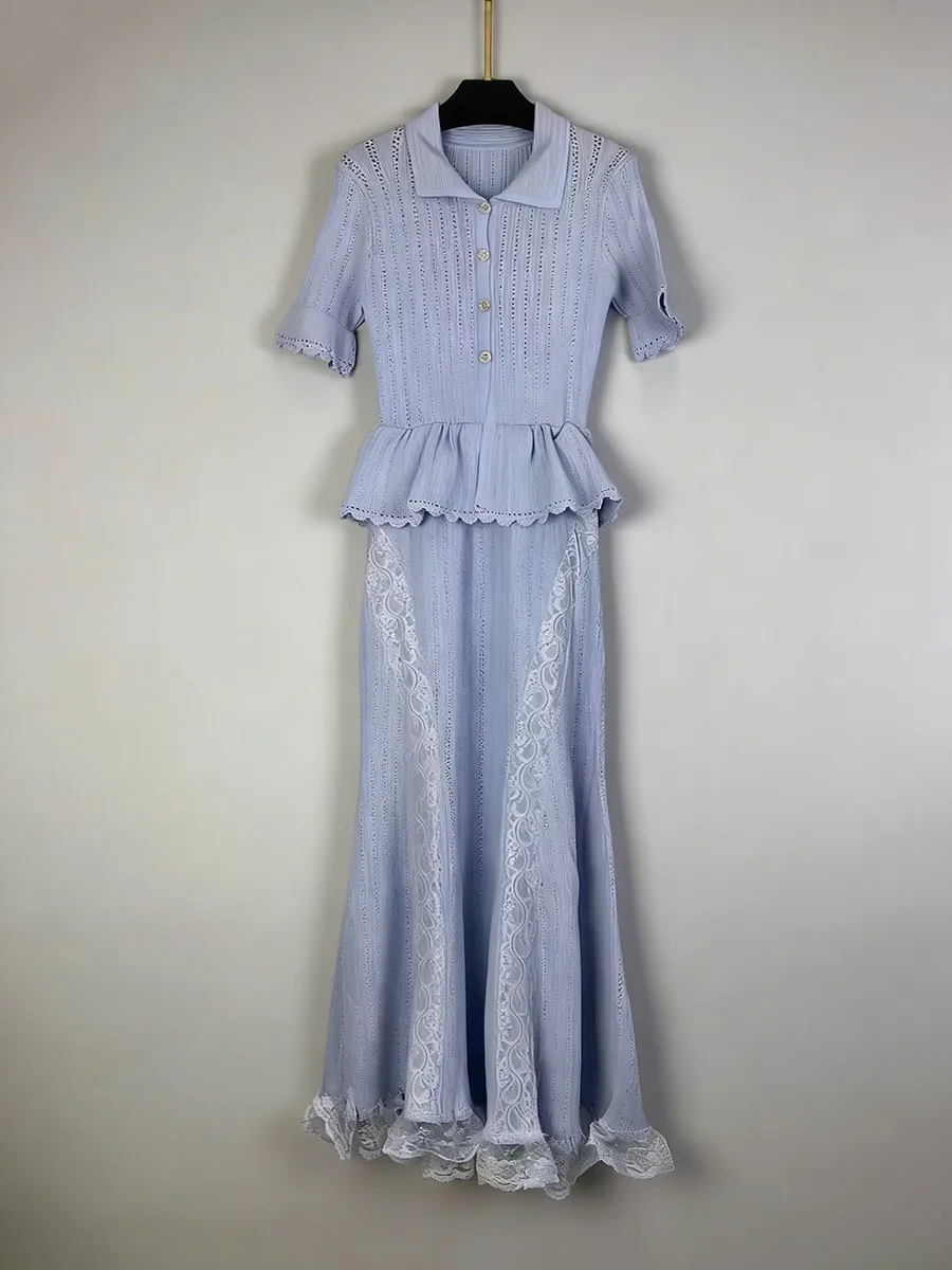 TWOTWINSTYLE Solid Spliced Lace Elegant Long Dresses for Women Lapel Short Sleeves Patchwork Ruffles Basics Dress Female Clothes