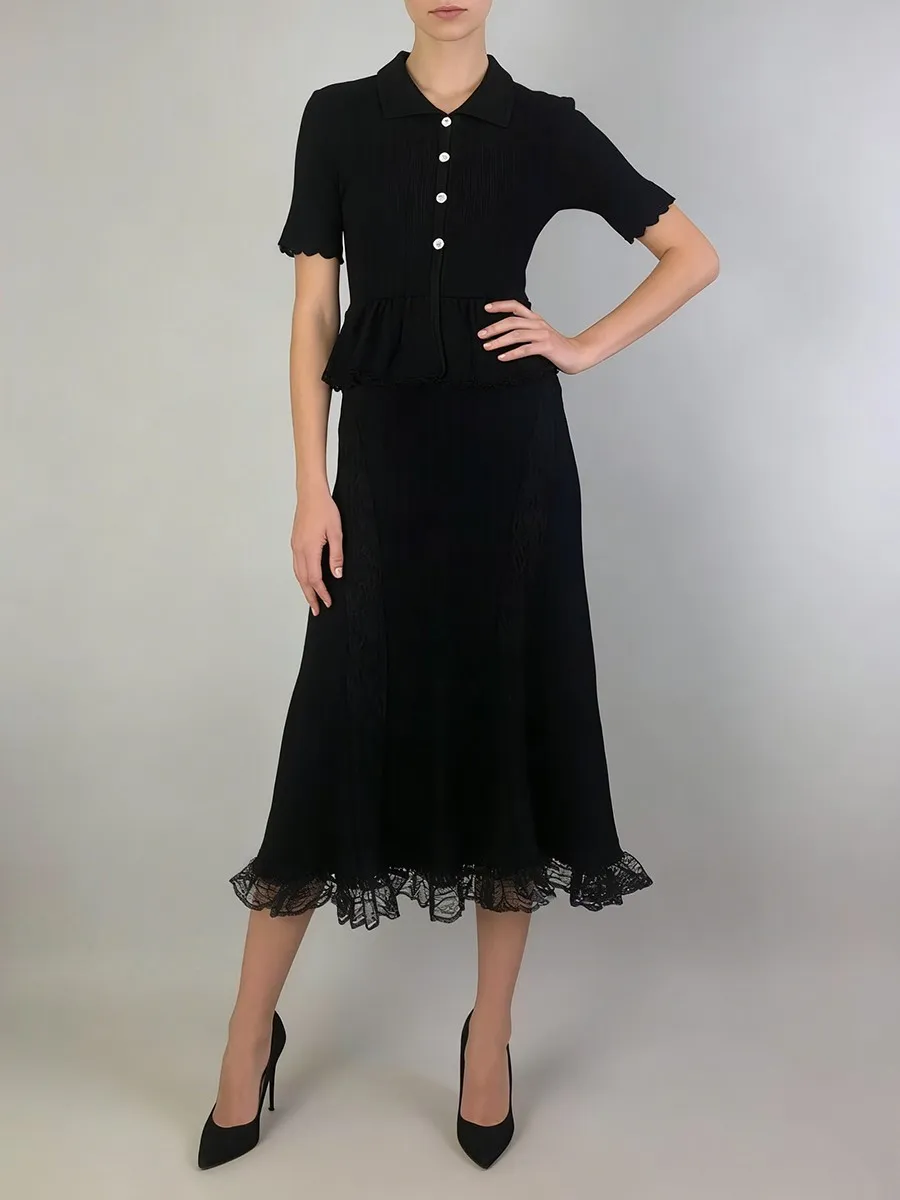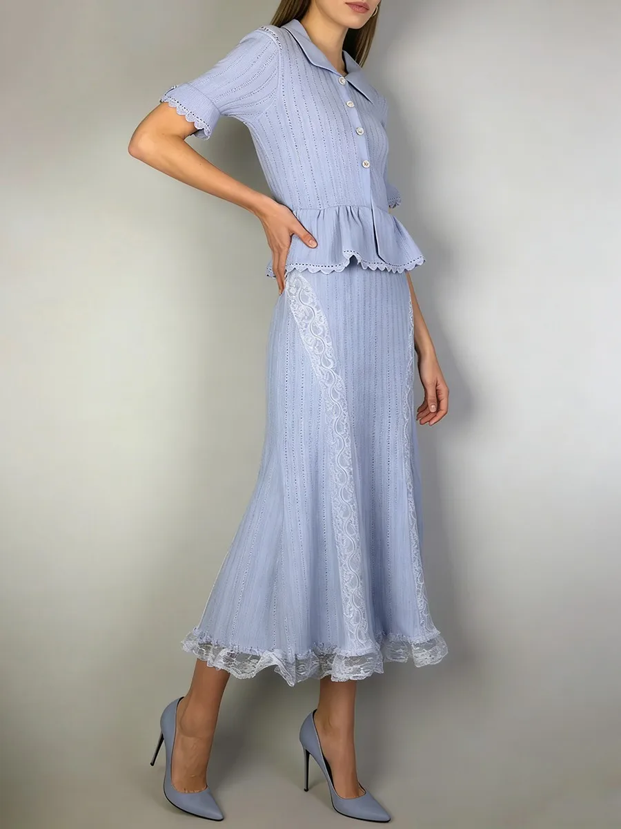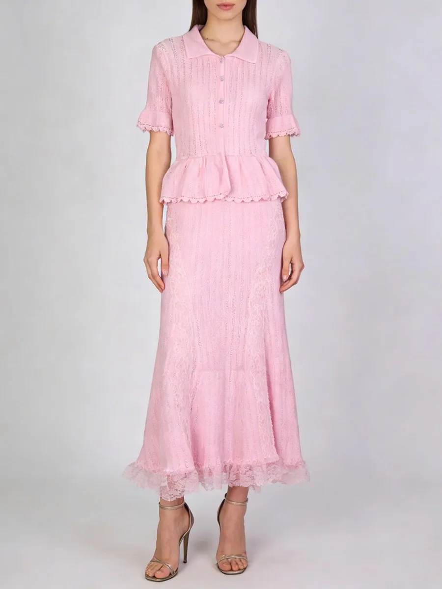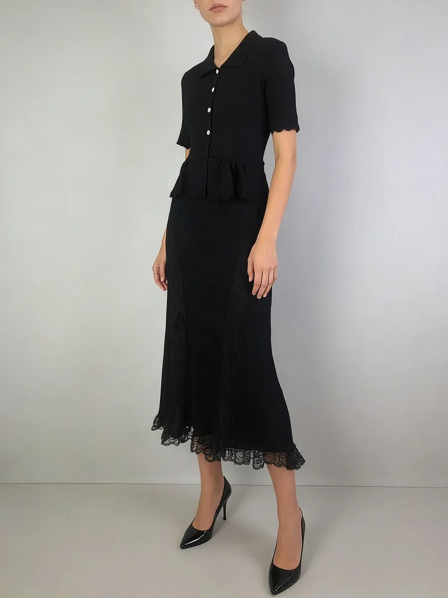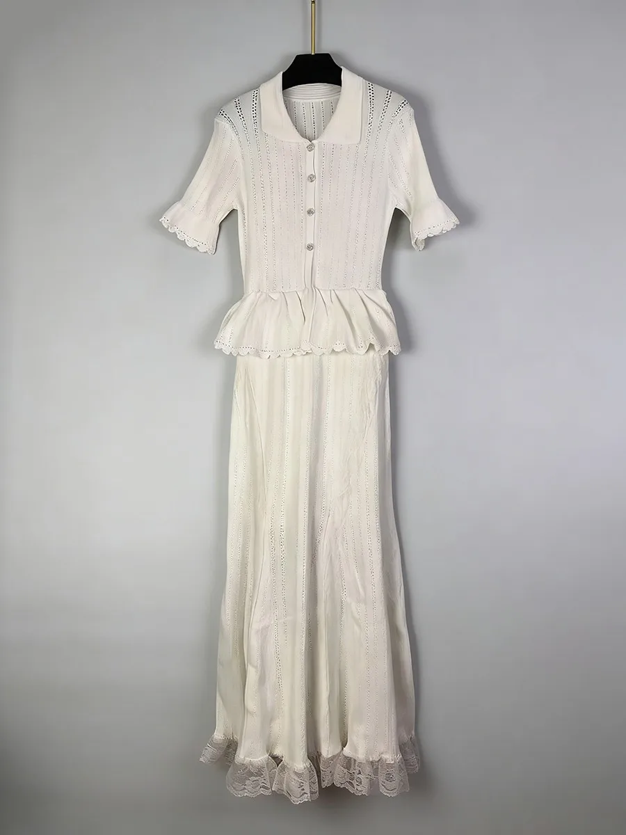 TWOTWINSTYLE Solid Spliced Lace Elegant Long Dresses for Women Lapel Short Sleeves Patchwork Ruffles Basics Dress Female Clothes