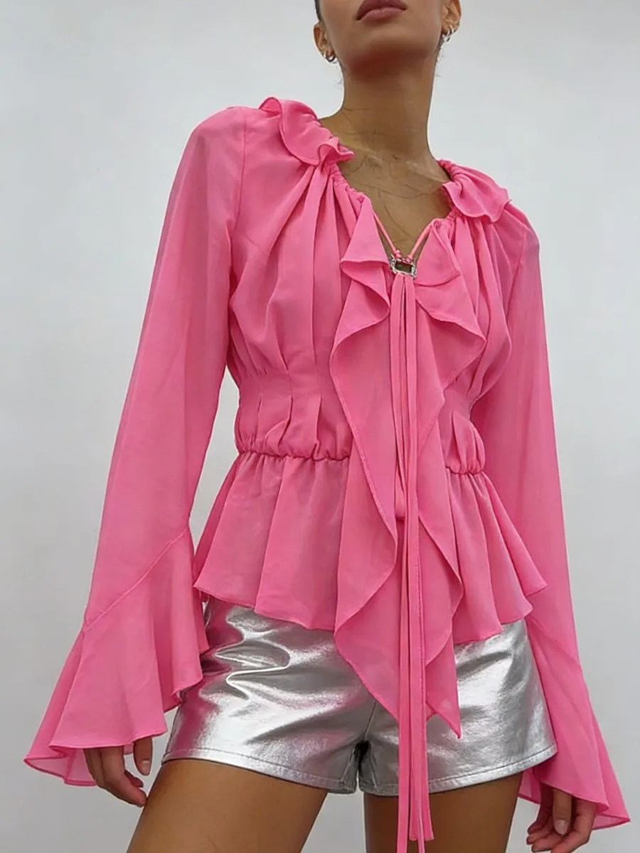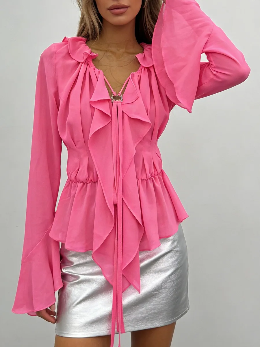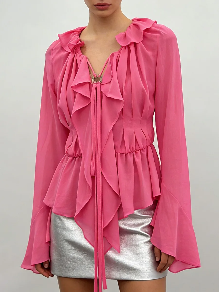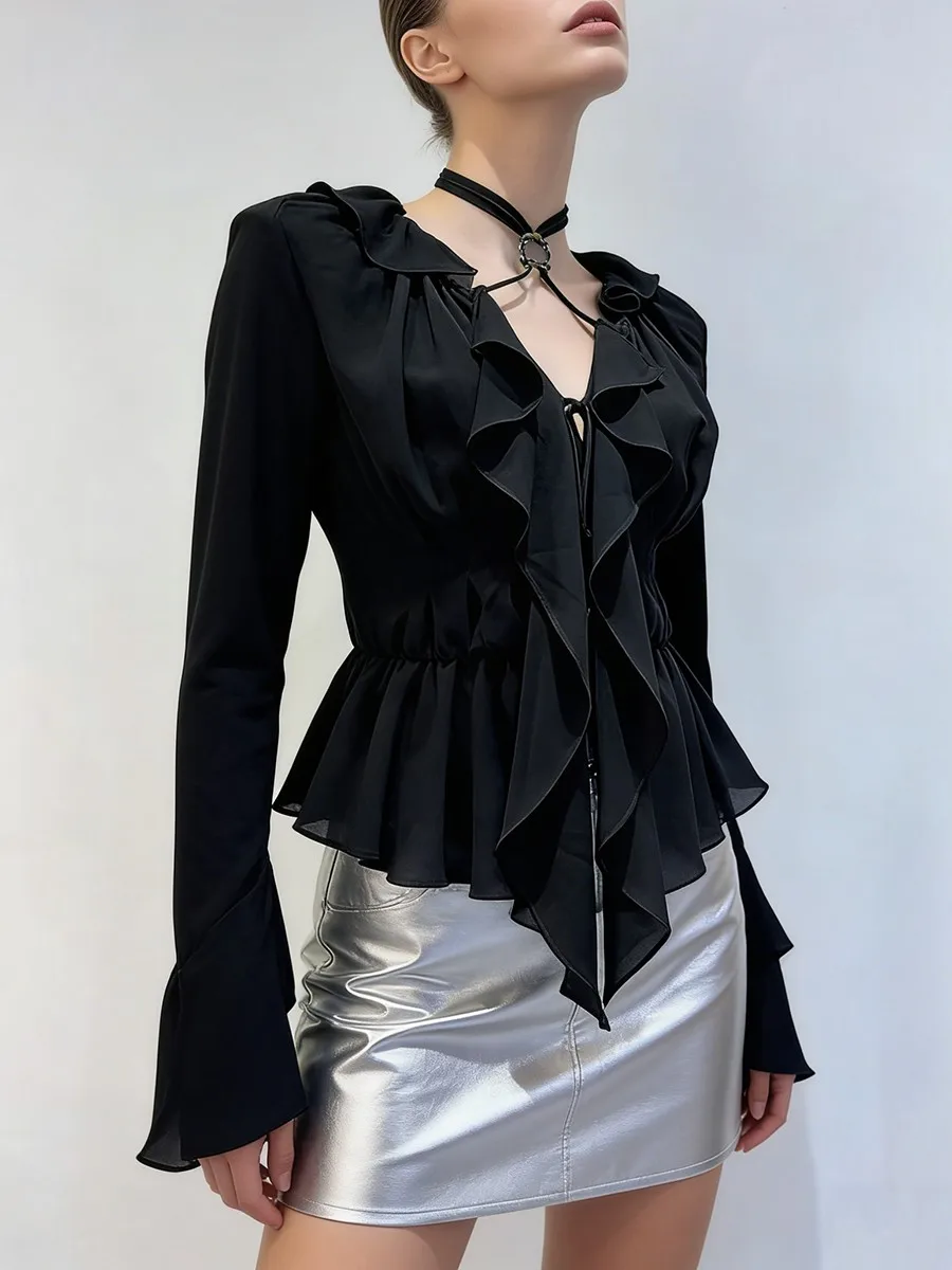 TWOTWINSTYLE Solid Spliced Ruffles Folds Fashion Blouses for Women V Neck Long Sleeves Tunic Patchwork Lace Up Blouse Female New