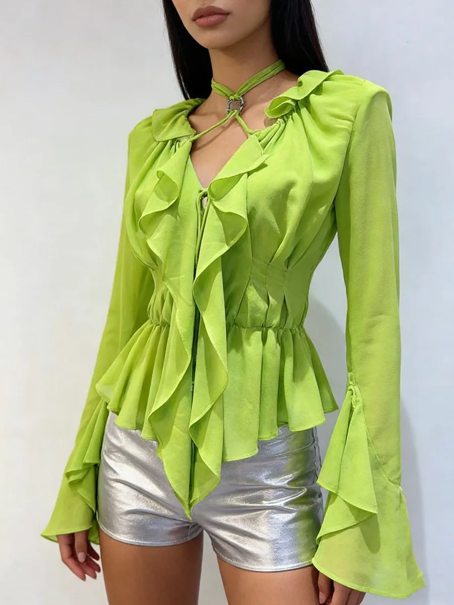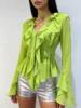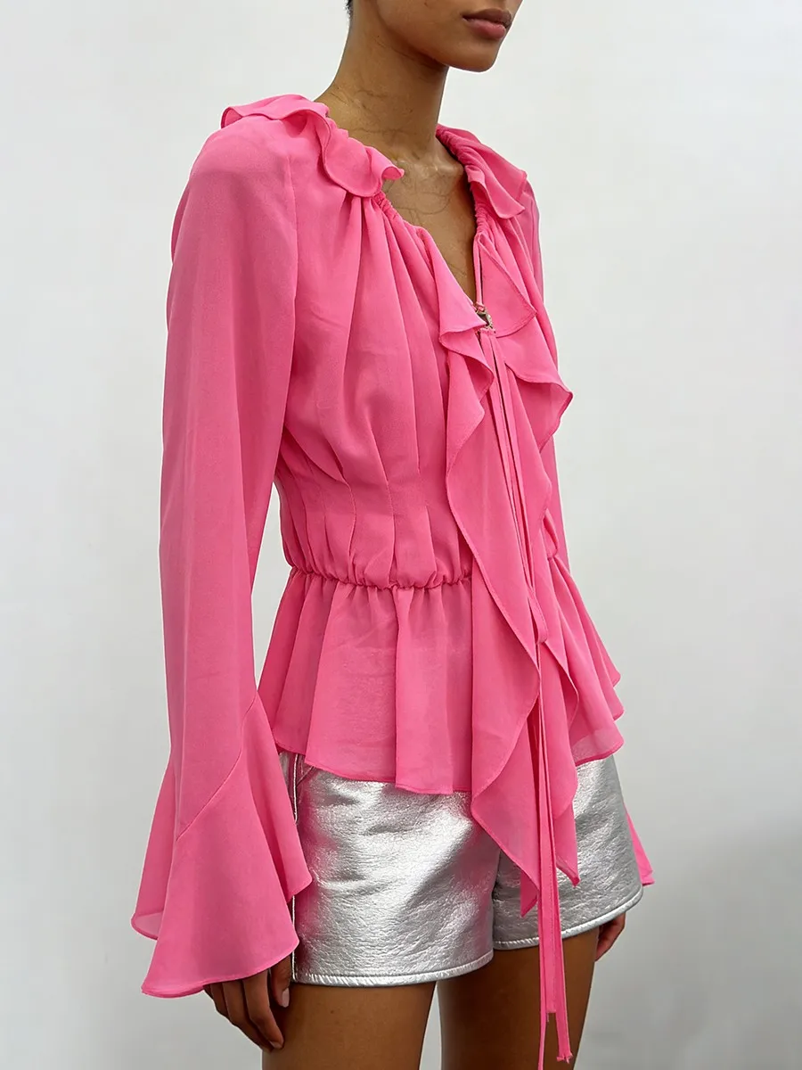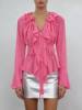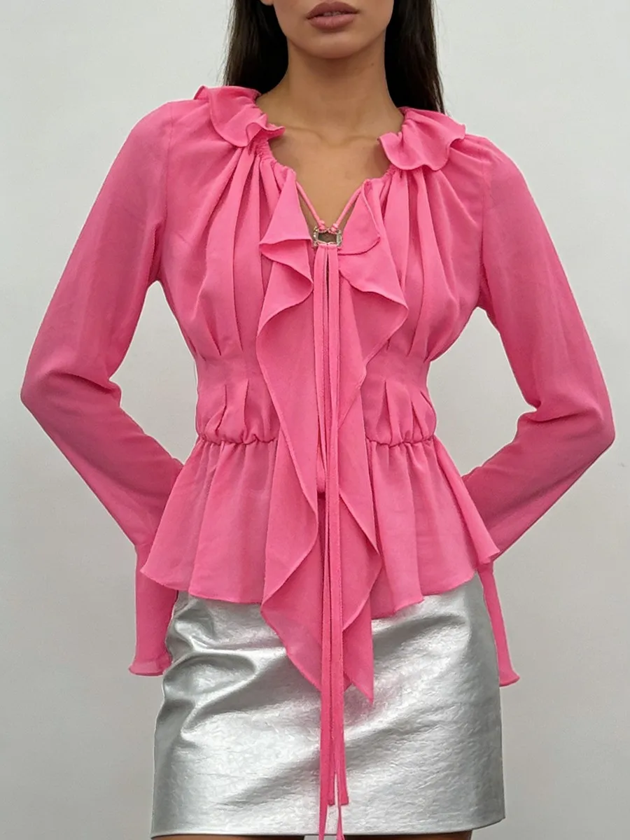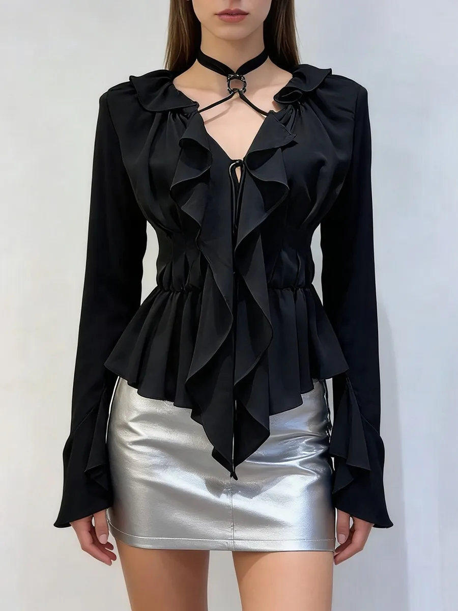 TWOTWINSTYLE Solid Spliced Ruffles Folds Fashion Blouses for Women V Neck Long Sleeves Tunic Patchwork Lace Up Blouse Female New