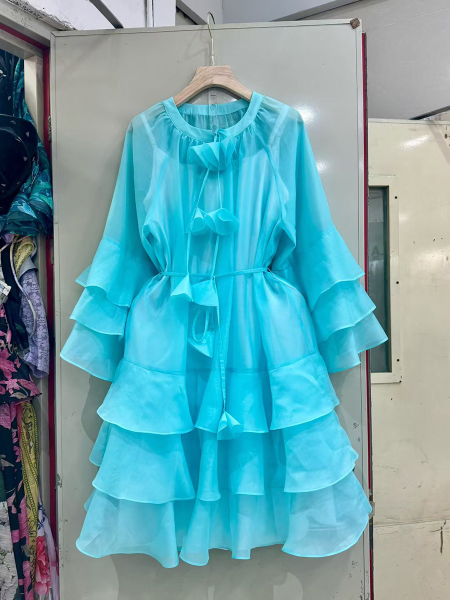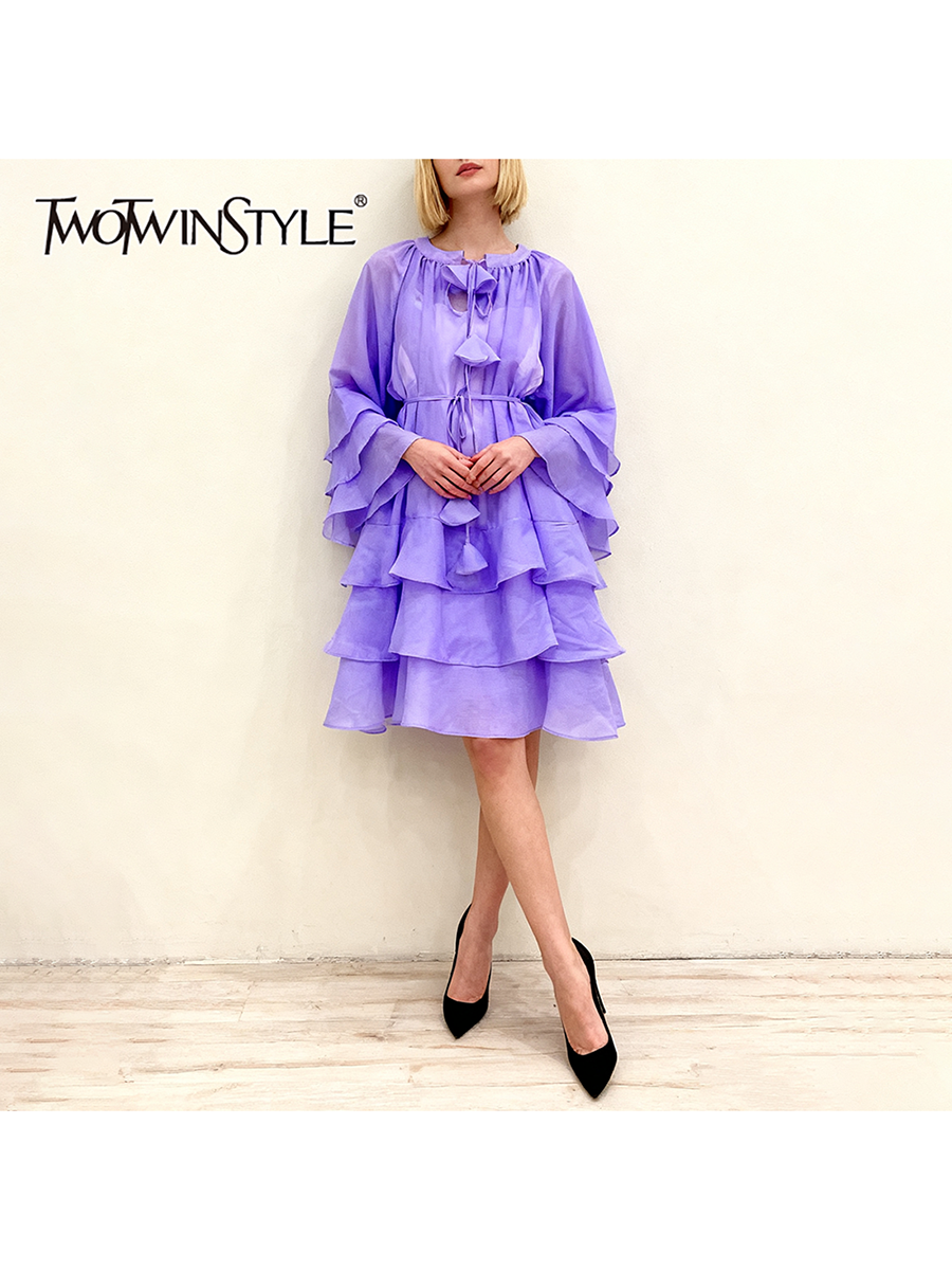 TWOTWINSTYLE Solid Spliced Ruffles Folds Fashion Dresses for Women Round Neck Long Sleeves Patchwork Lace Up Dress Female New