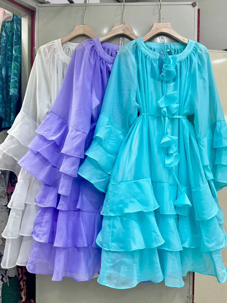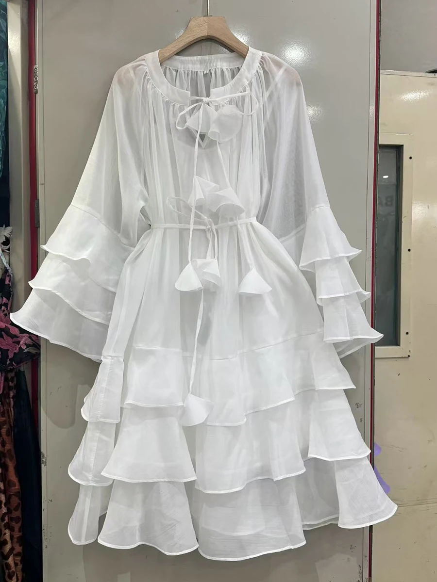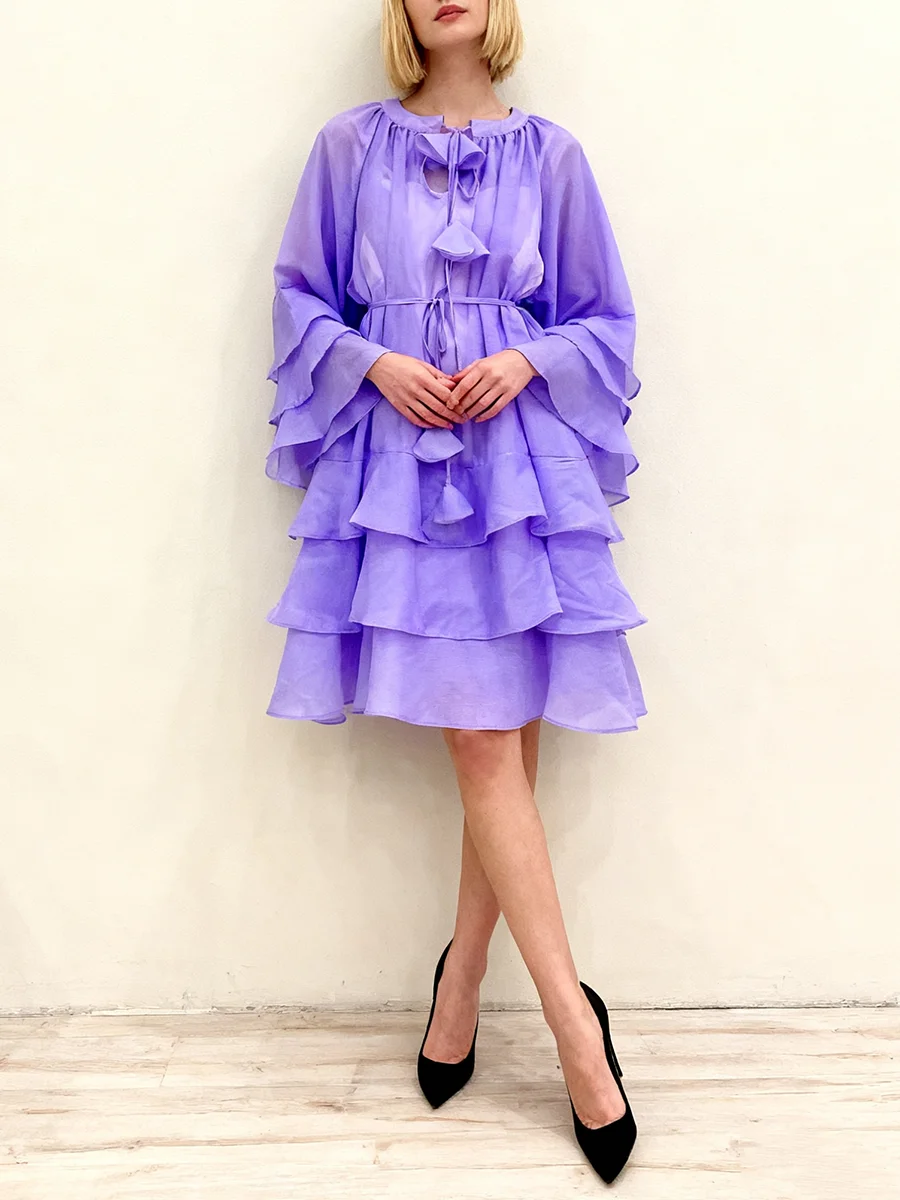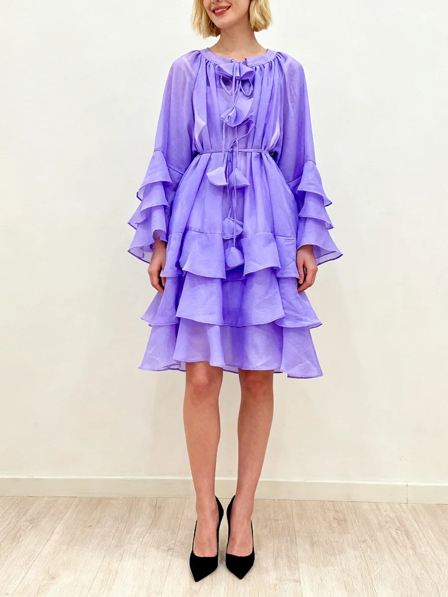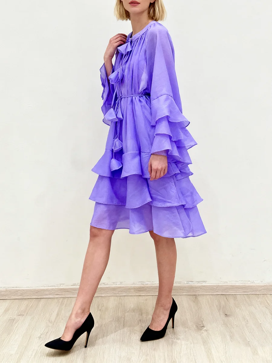 TWOTWINSTYLE Solid Spliced Ruffles Folds Fashion Dresses for Women Round Neck Long Sleeves Patchwork Lace Up Dress Female New