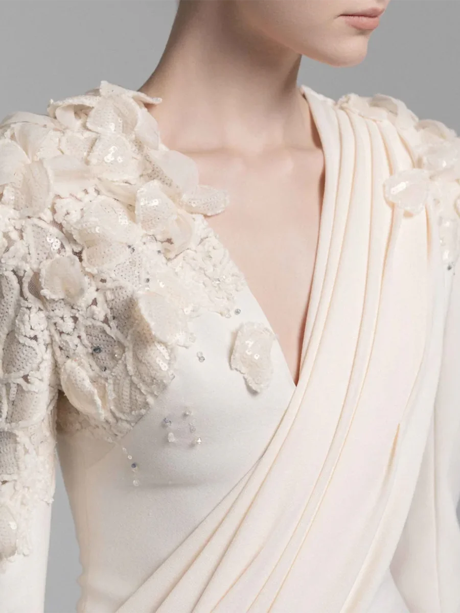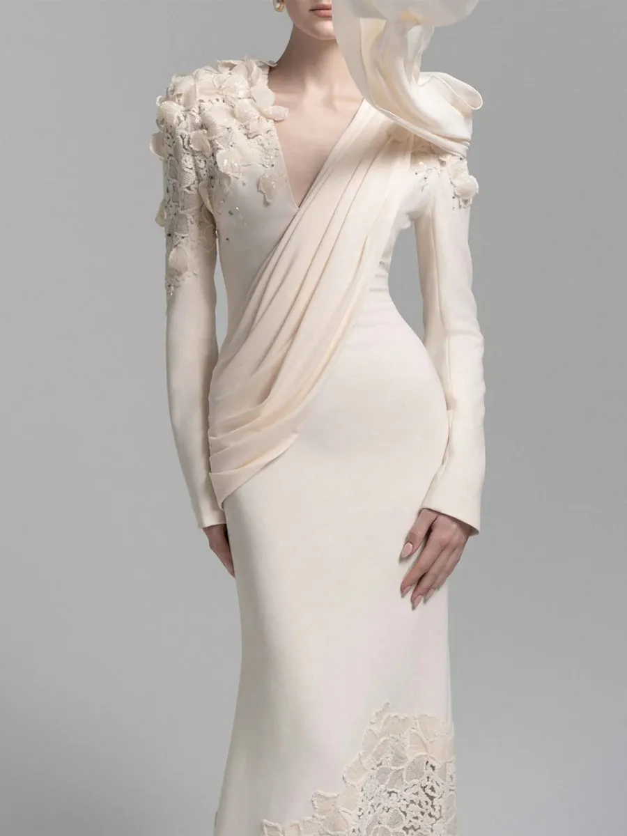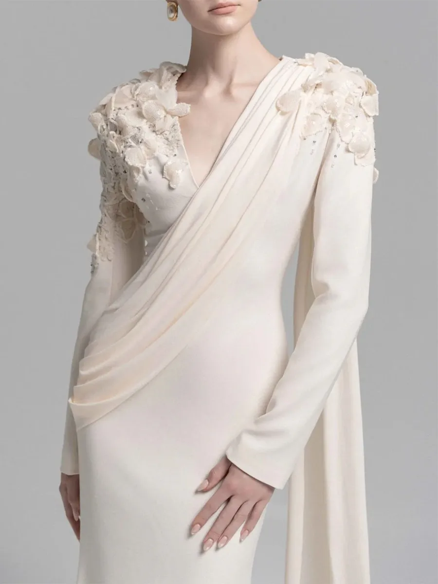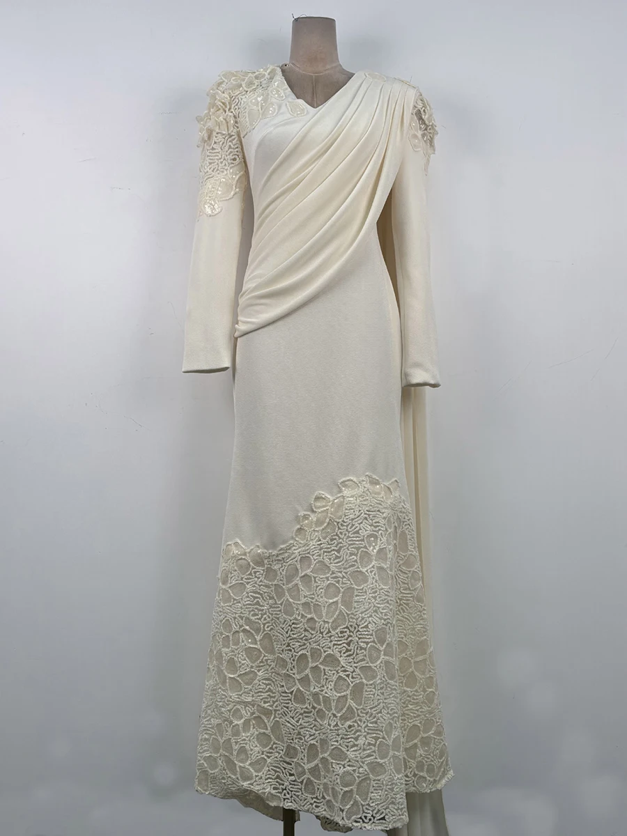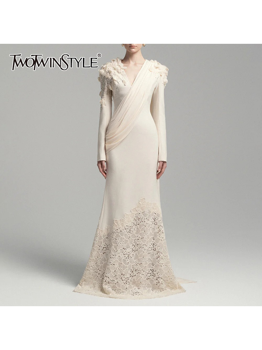 TWOTWINSTYLE Solid Spliced Sequins Temperament Dresses for Women V Neck Long Sleeves Tunic Patchwork Folds Dress Female Clothing