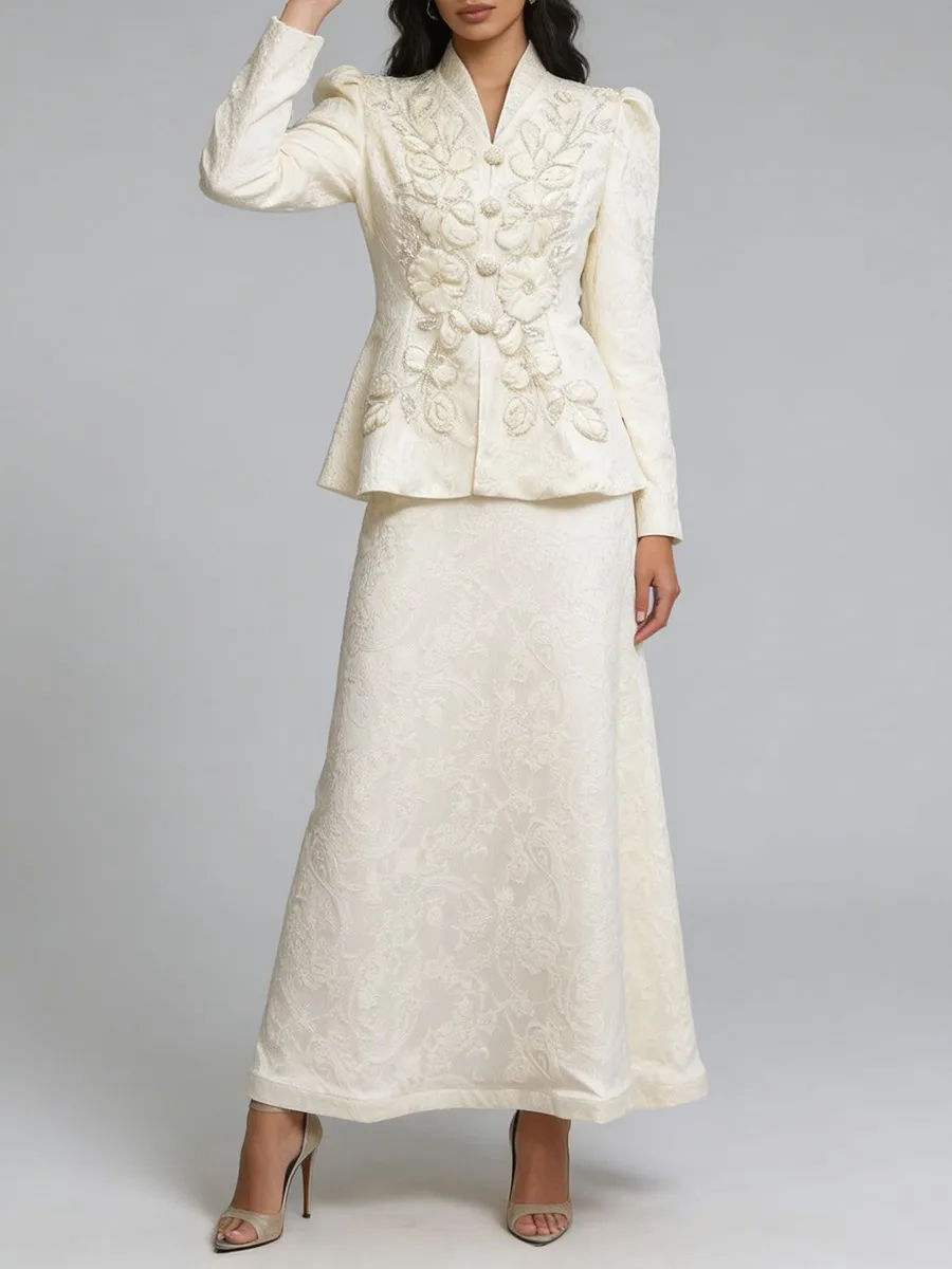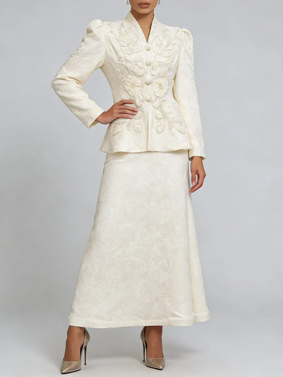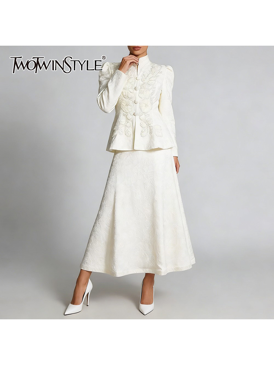 TWOTWINSTYLE Solid Temperament Two Piece Sets for Women V Neck Long Sleeves Spliced Appliques Top High Waist Skirt Set Female